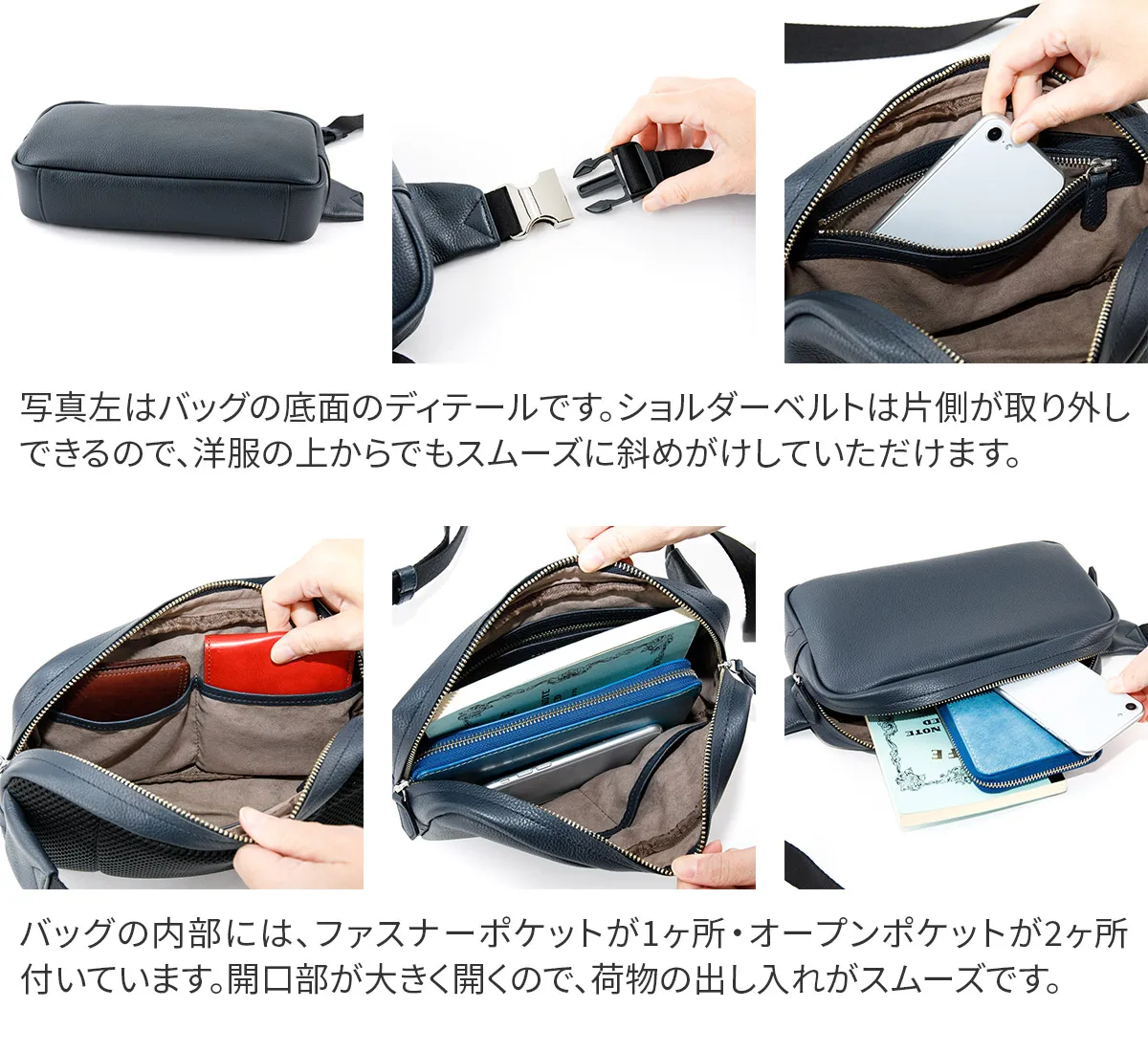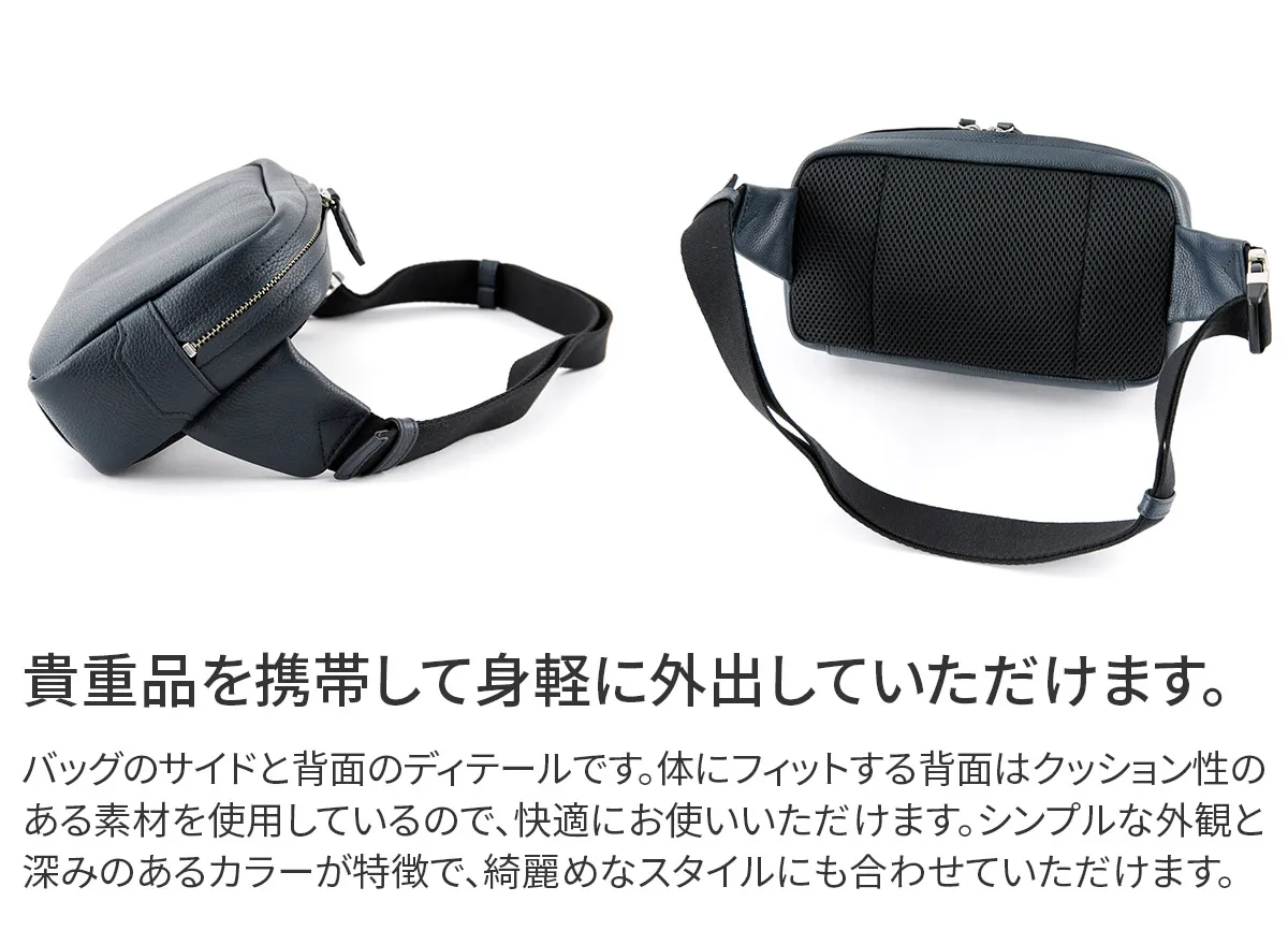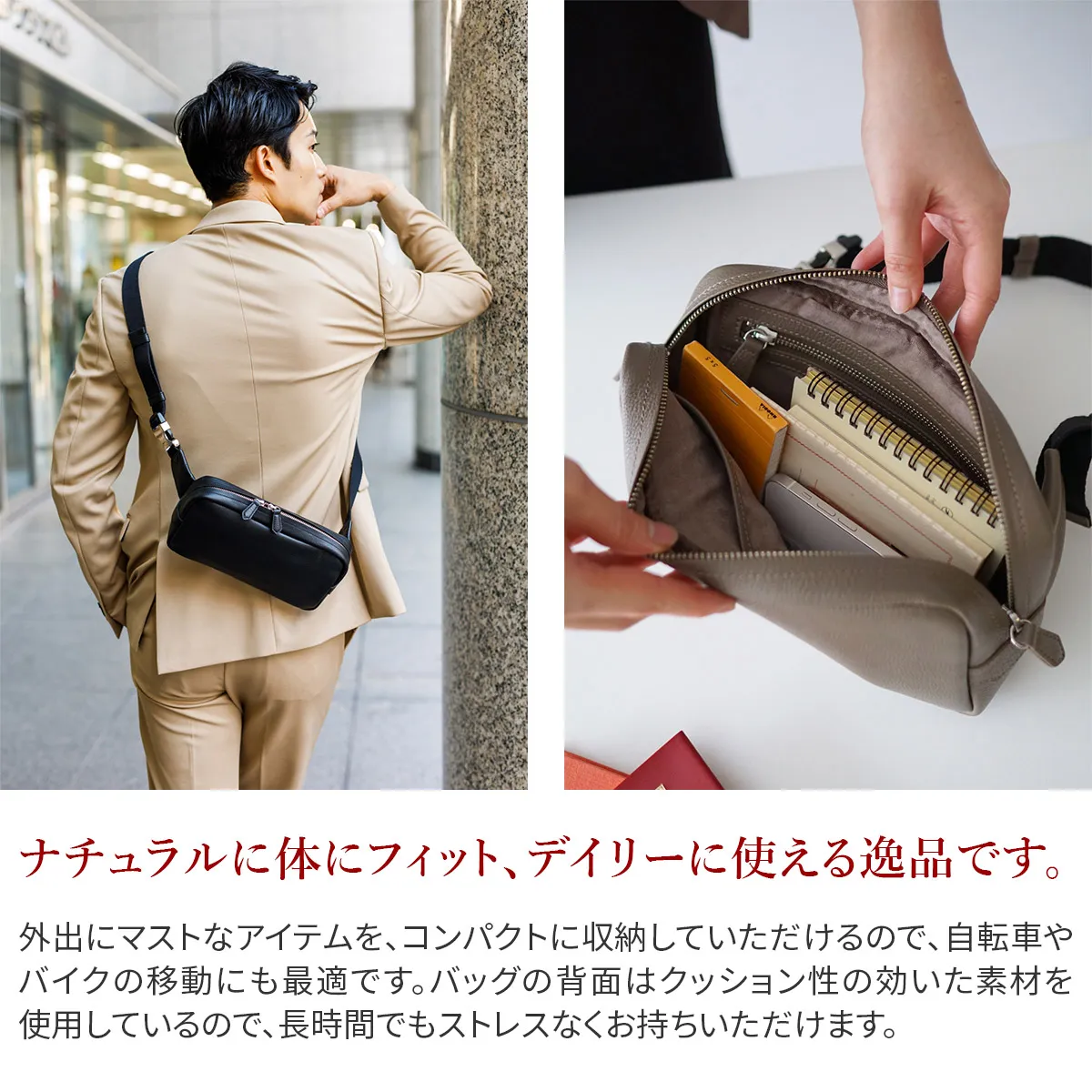上品なレザーをふんだんに使用したバッグコレクション「CLAUDIO(クラウディオ)」。 時代のトレンドに左右されない、普遍的で長く使用できるデザインが特徴です。 オールレザーならではの高級感とポケット等の充実した収納が魅力。 SONNE(ゾンネ)の定番コレクションです。 シンプルな外観が素材の良さを引き立てるボディバッグです。 長財布や文庫本も収納できるサイズなので、身軽にお出かけしていただけます。