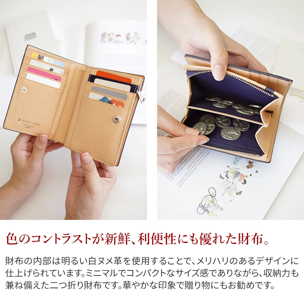 [シリーズ] ペイズリー柄の型押しを施し、浮き出た部分に削りを施すことで、細かい柄まで細部に表現されています。熟練の職人技術により、定番のスムースレザーを奥行のある柄の陰影が美しい存在感のある革へと変化させています。内側は明るい白ヌメカラーにすることで、メリハリのあるデザインに仕上げられています。 [藍染レザー] 藍で染色されたレザーを使用しています。革を一度真っ白に白鞣しを施し、藍の染料に漬けた後、一度乾かします。その後、余分な染料を水で洗い流して干す。この工程で一回染色となります。こちらの藍染めカラーは8回、20回。全て一枚一枚手作業で行われています。そんな職人さんの愛のこもったお財布は、息を飲むほどに美しく、深み・透明感・適度なムラのある藍色が最大の特徴です。また、経年変化によりツヤも出てきますので、定期的に艶出しのクリームでケアしていただくことでより輝きが増します。