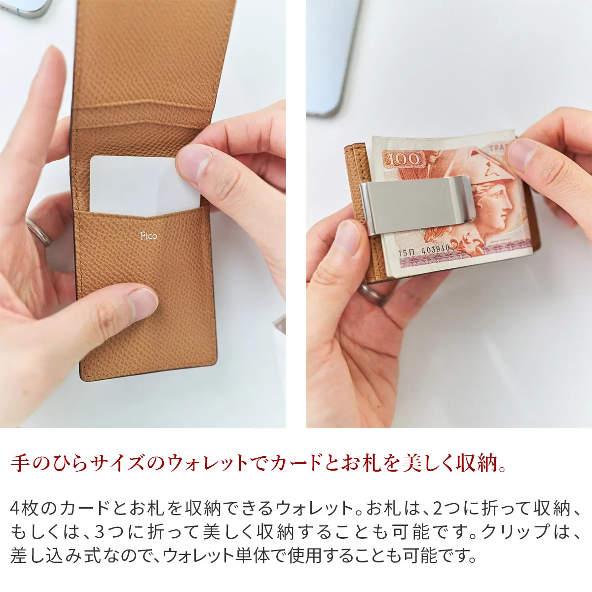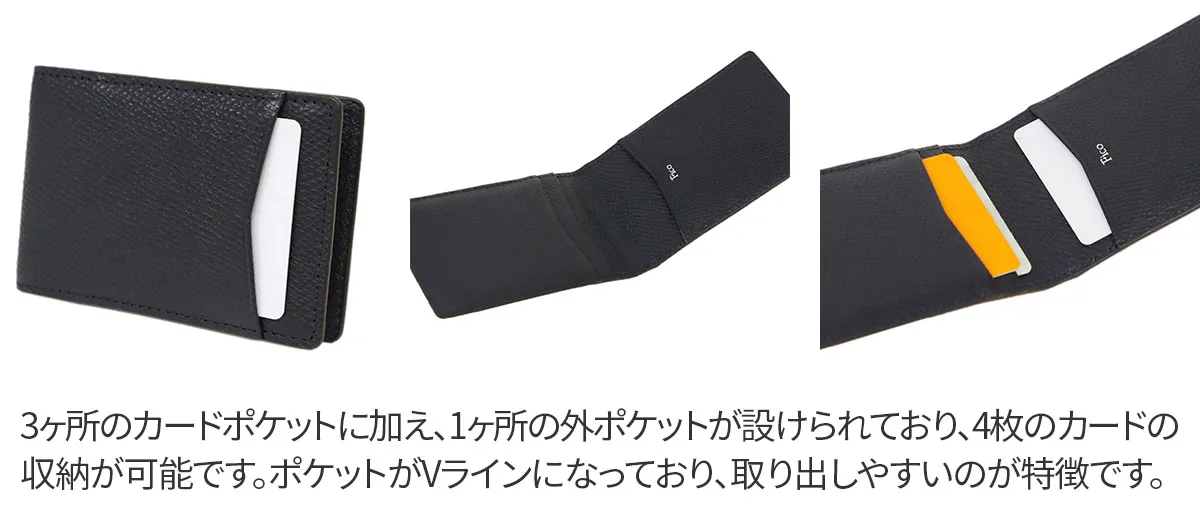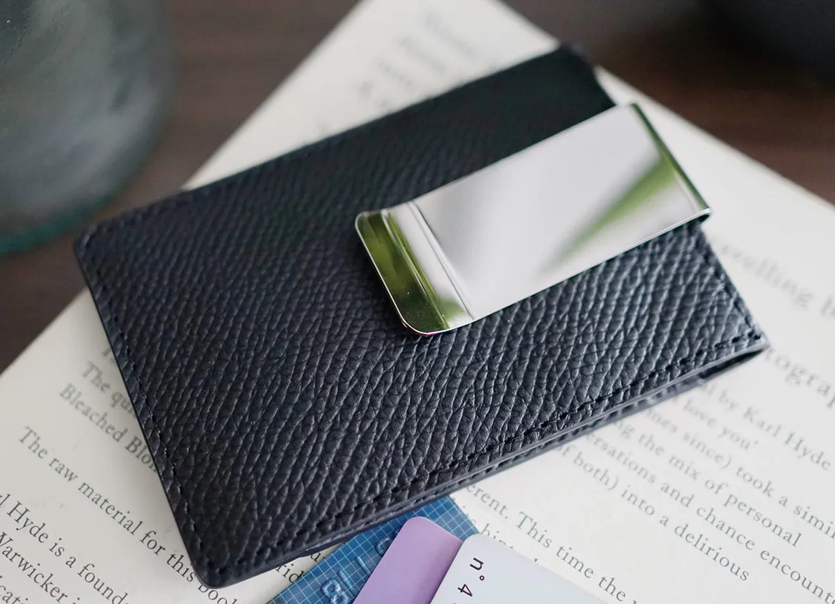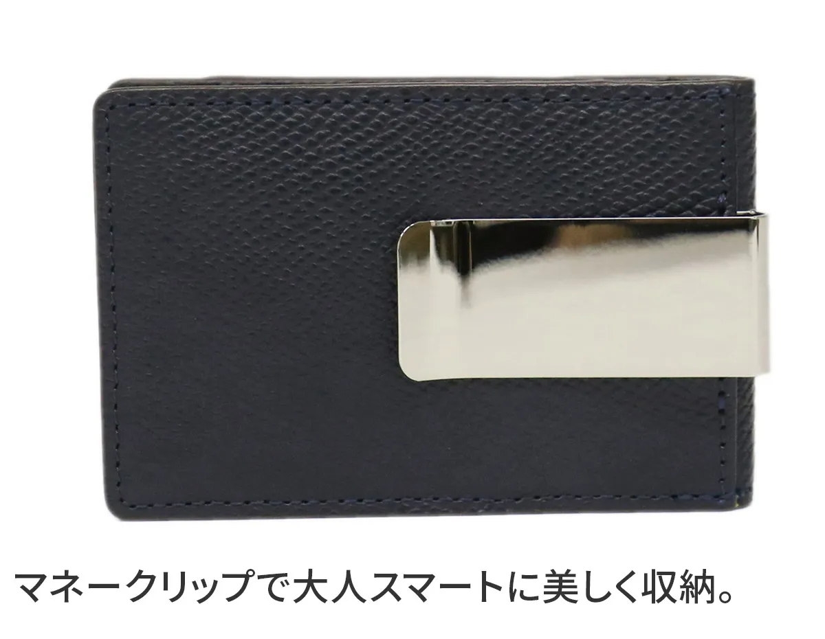 オーセンティックな佇まいにリラックス感とカジュアル感をプラスしたシリーズ。 “手のひらサイズ”をキーワードに、コンパクトなレザーグッズを展開。 ドイツ車のカーシートにも使用されている牛革原皮を使用。 職人がパテで下地の表面を均一にならしていく。顔料で色付け後、型を押す。 型の頭をプリンティングマシーンを用いて染料で頭貼りを行う。また頭貼りをしない黒、ネイビー等の濃色は染料をスプレー吹きし透明感を出しています。 手に馴染むしなやかさと ラフに使っても気にならない堅牢さを持ち合わせています。 スマートに収納できるマネークリップ。お札を二つ折りにしてもよし、三つ折りでもすっきり収納できるので、お好みに合わせて収納方法を変えることができます。 また、クリップは取り外し可能なので、ウォレット単体でもお使いいただけます。