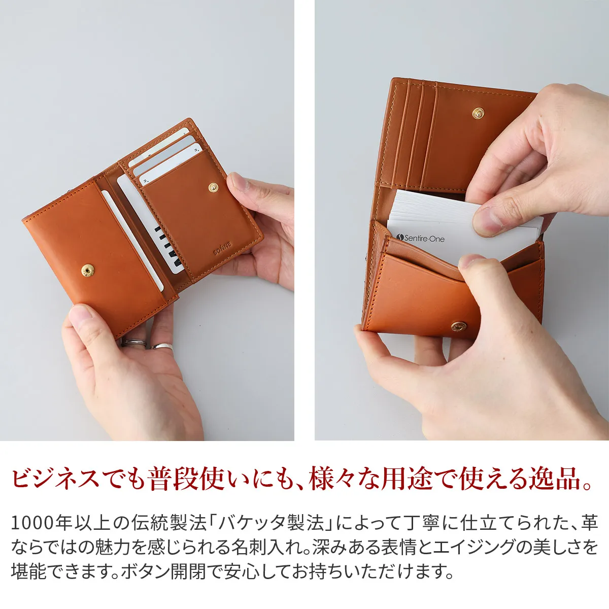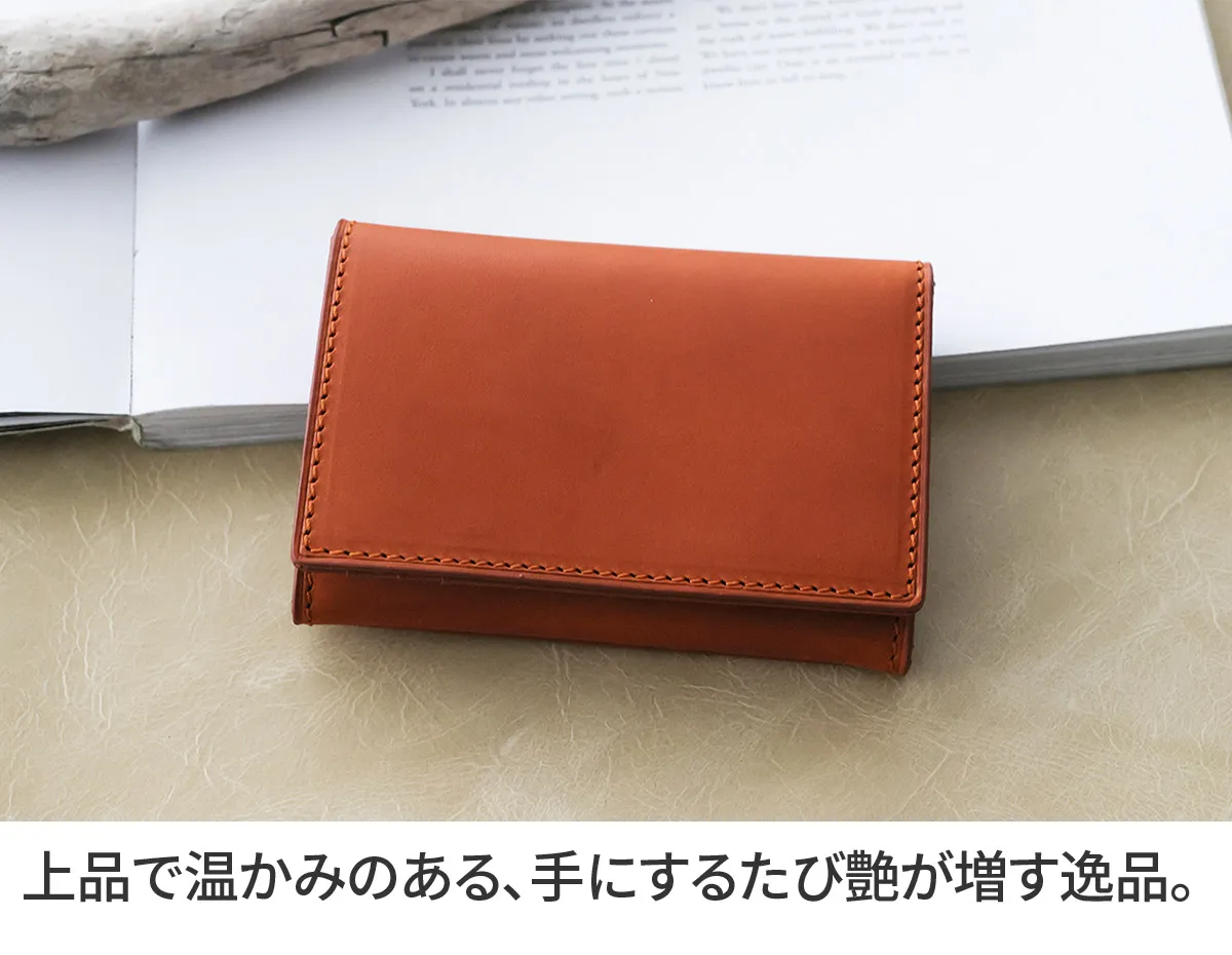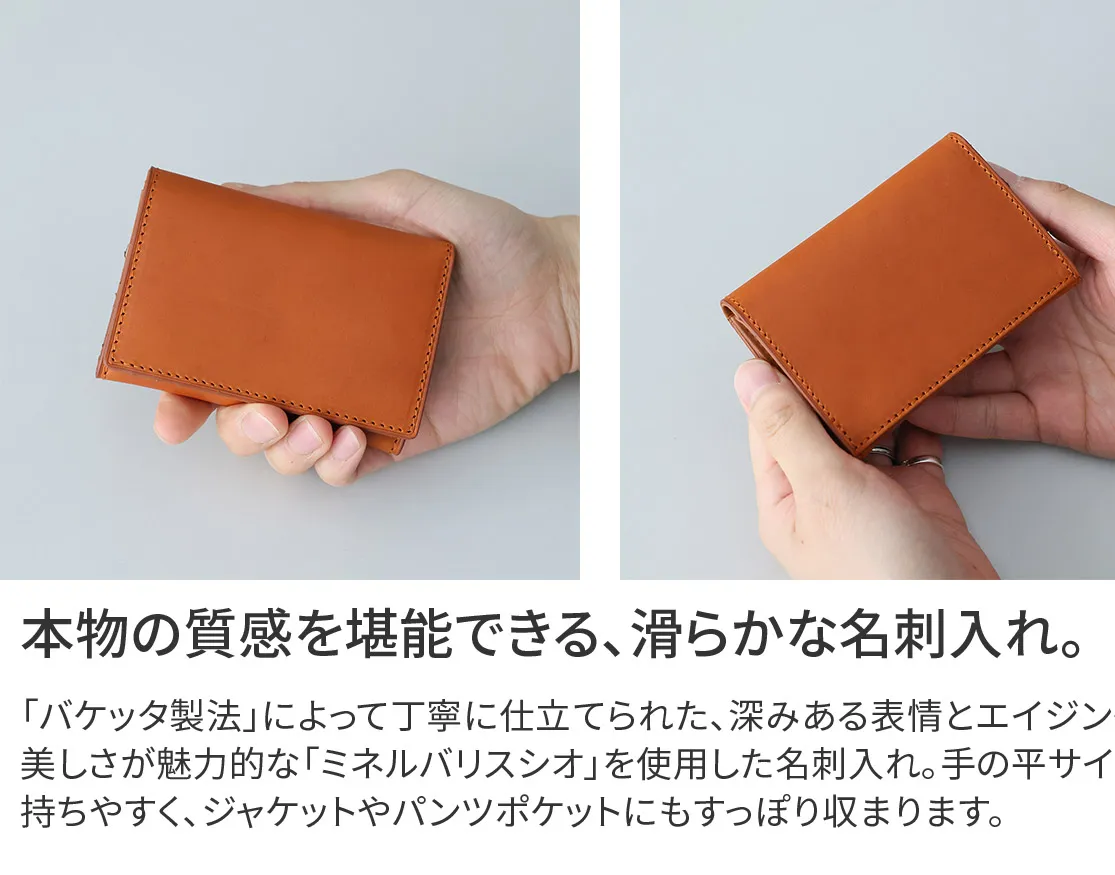 上質な艶と透明感をもつイタリア・フィレンツェ産の「ミネルバリスシオ」。 その深みある表情とエイジングの美しさは、1000年以上の伝統製法「バケッタ製法」によって丁寧に仕立てられた革ならではの魅力です。 表革には、そのミネルバリスシオを贅沢に使用。 つるりと滑らかな表面は上品で温かみがあり、手にするほどに艶を増し、持ち主だけの風合いへと育っていきます。 内装には、インド産フルグレインレザー「ナッパグロッシー」を採用。 しっとりと柔らかく、しなやかで弾力に富んだその手触りは、使い心地においても極上の体験をもたらします。 滑らかさと本物の質感を意味する「リスヴェロ」は、使うたびに輝きを深めていく、大人のためのレザーウォレットシリーズです。 素材の風合いを最大限に活かしたシンプルな名刺入れで、スナップボタンで止めることができる為、パカパカ開閉することも気にならず、お召し物のポケット以外に収納いただいても安心です。