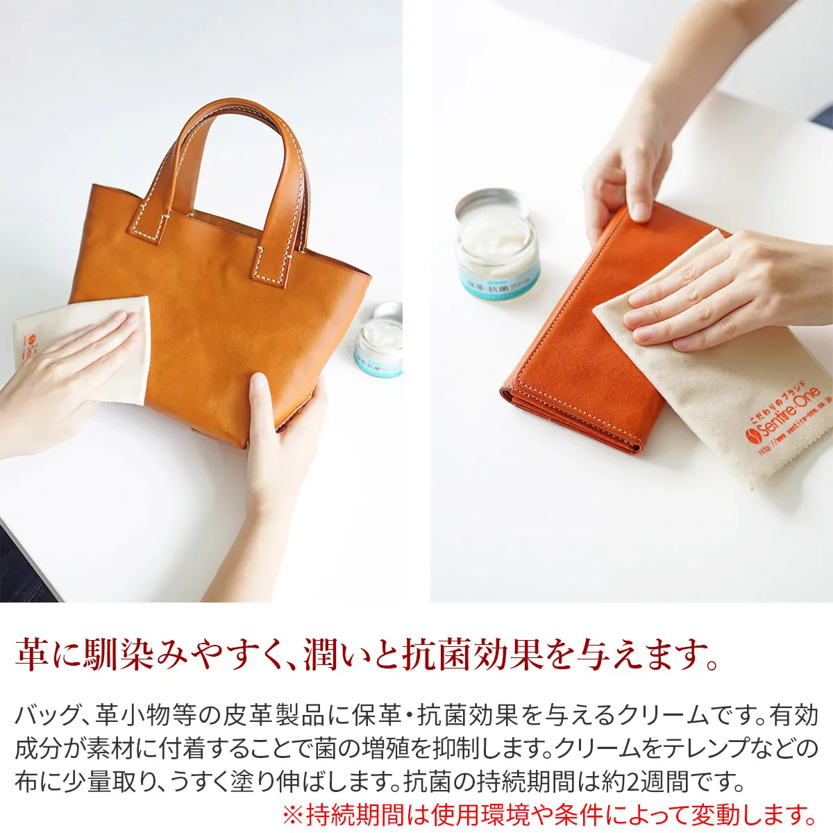 バッグ、革小物等の皮革製品に保革・抗菌効果を与えるクリームです。有効成分が素材に付着することで菌の増殖を抑制します。クリームをテレンプなどの布に少量取り、うすく塗り伸ばします。抗菌の持続期間は約2週間です。 SIAA抗菌加工マークは、JIS Z 2801により評価された結果に基づき、抗菌製品技術協議会ガイドラインで品質管理・情報公開された製品に表示されています。 ※持続期間は使用環境や条件によって変動します。 ※すべての菌に効果があるわけではありません。