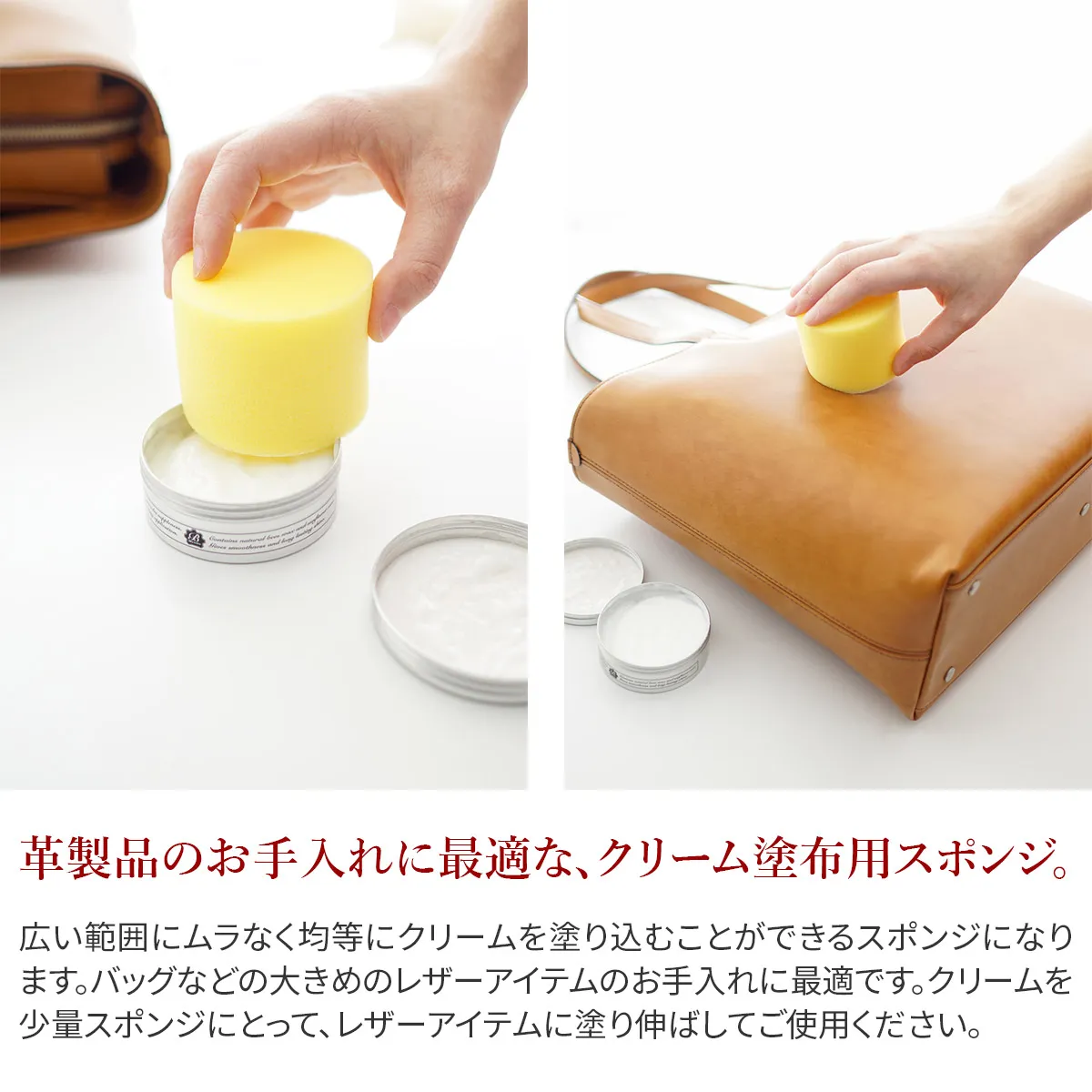 一般的な布などと比べ、一度に広い範囲にムラなく均等にクリームを塗り込むことが可能ですので、バッグなどの大きめレザーアイテムのケアに最適です。
