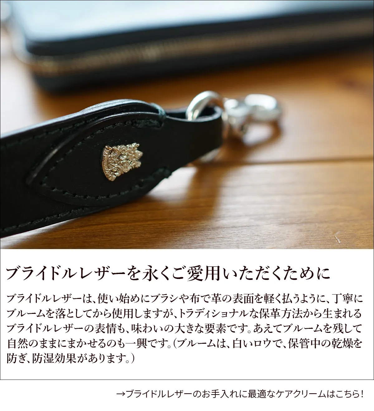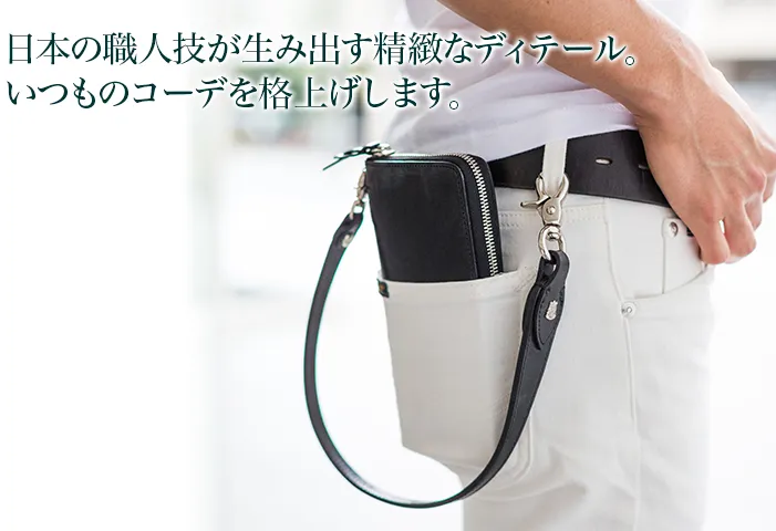 落ち着きのある光沢感と、シンプルながら高貴さを感じさせる皮革が印象的な上質なウォレットコード。シンプルなデザインだからこそ、素材の良さ、縫製などディテールのこだわり、オリジナルエンブレムに至るまで、仕立ての良さが際立っています。いつものコーディネートに、さり気ないアクセントとしても光る逸品です。 素材には、馬勒を作るために作られた強靭なBridle Leatherを使用しています。イギリス紳士を想わせるこの皮革は、デザインに余分な翻弄さを許さず導く様に形が姿を現したという印象です。Bloom(ブルーム)からはじまる若さと強靭・硬質な時期からブルームが取れ、馴染み、傷つき、ツヤを増し、使い込まれメンテナンスを繰り返す時間の中でも、色艶は気品を失わず静かな貫禄をたたえはじめます。