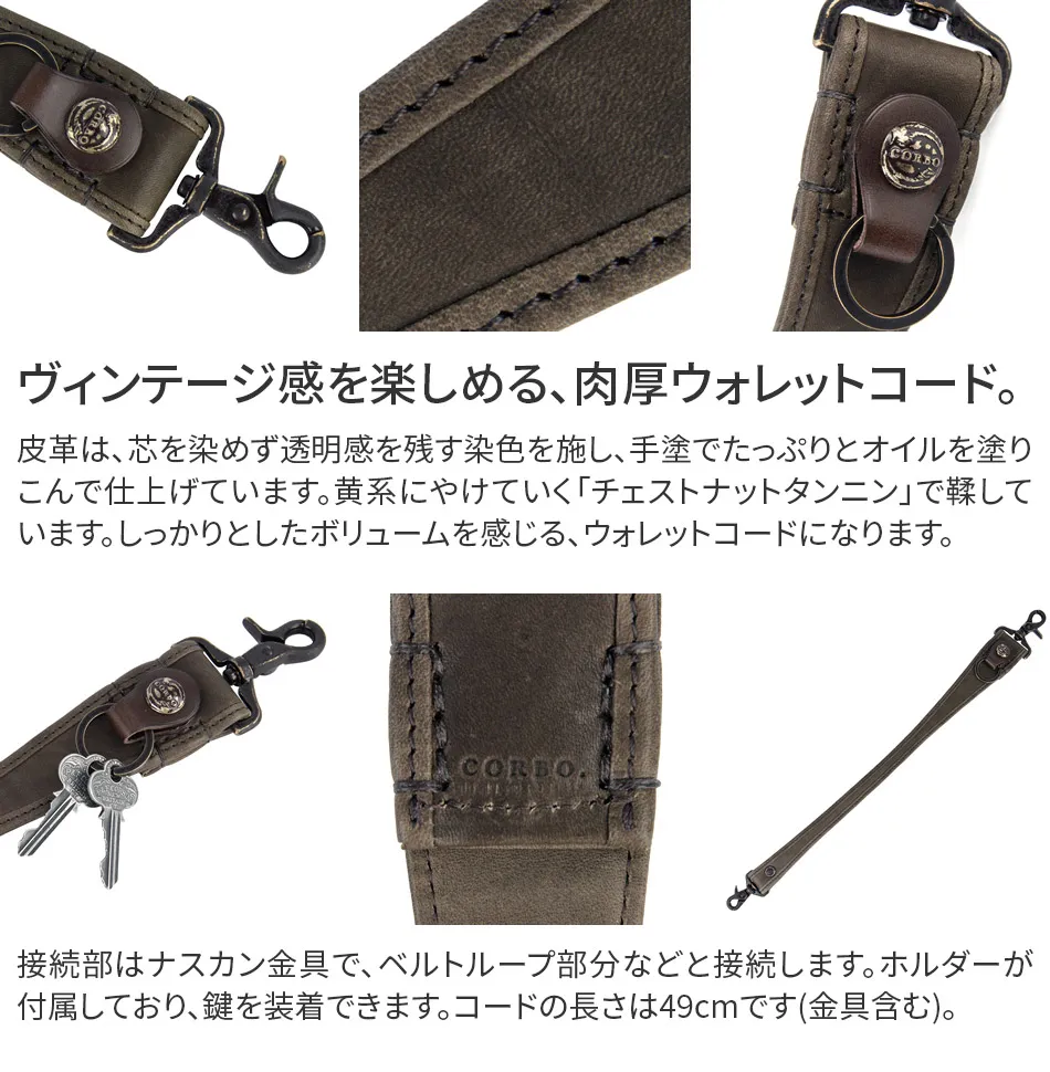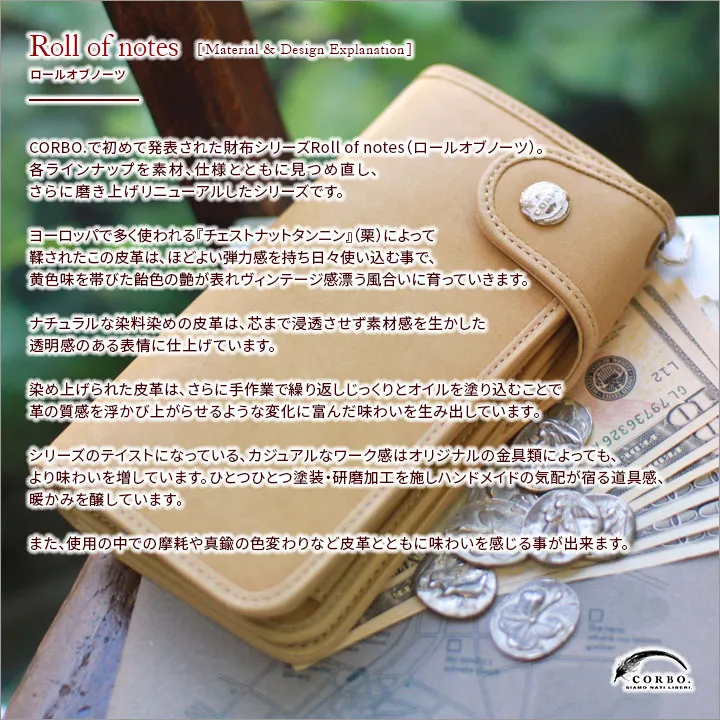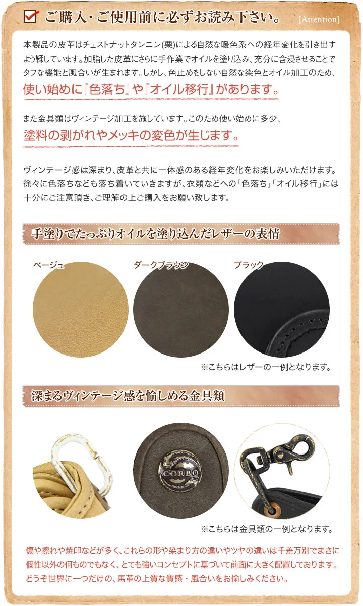 芯まで浸透させず、ナチュラルな染料染めで染めて、素材感を生かし透明感のある表情の皮革です。さらに手作業で繰り返しじっくりとオイルを塗り込むことで、革の質感を浮かび上がらせるような変化に富んだ味わいを生み出しています。 オイル移行やチェストタンニンンの灼け、経年の汚れが皮革を味のあるヴィンテージに育てていきます。 革だけでなく、真鍮メッキに塗装し研磨された、人の手に永年触られた道具のような暖かみ感じる金具部分も使い込めば更に真鍮も深みを増し、皮革と共に完璧に近づいていきます。