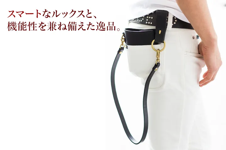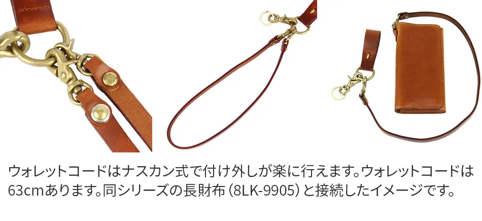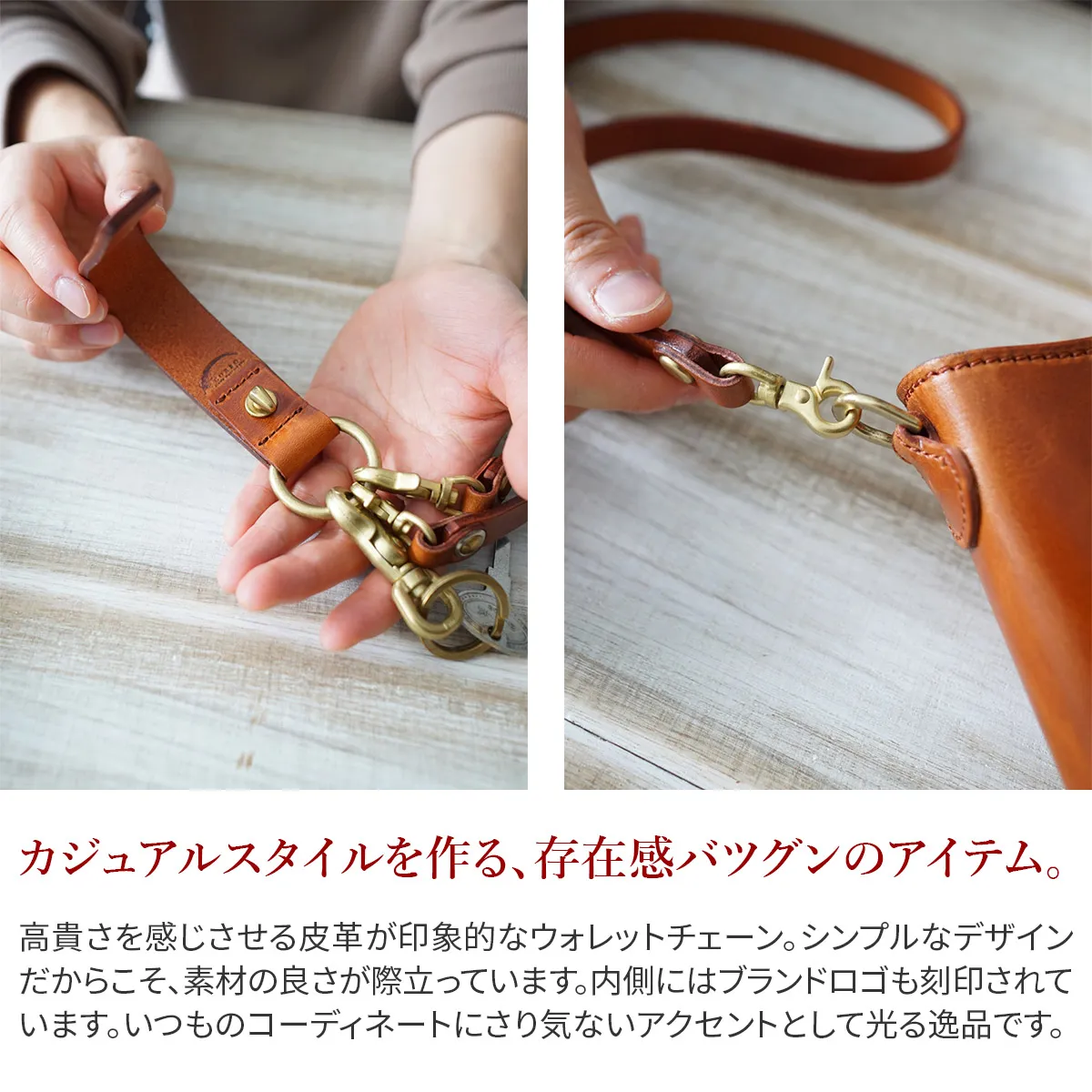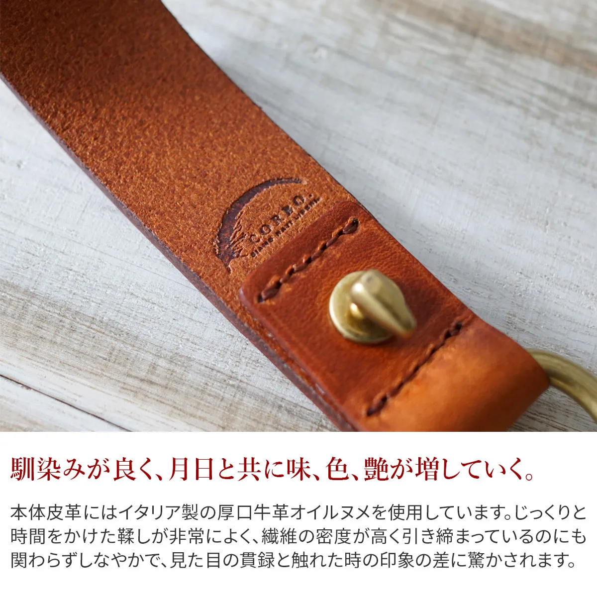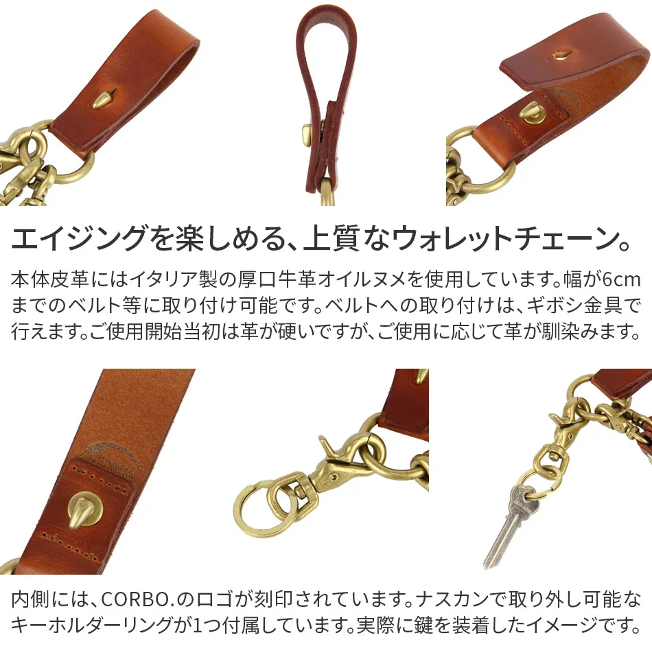 高貴さを感じさせる皮革が印象的なウォレットチェーン。シンプルなデザインだからこそ、素材の良さが際立っています。内側にはブランドロゴも刻印されています。いつものコーディネートにさり気ないアクセントとして光る逸品です。 本体皮革にはイタリア製の厚口牛革オイルヌメを使用しています。じっくりと時間をかけた鞣しが非常によく、繊維の密度が高く引き締まっているのにも関わらずしなやかで、見た目の貫録と触れた時の印象の差に驚かされます。