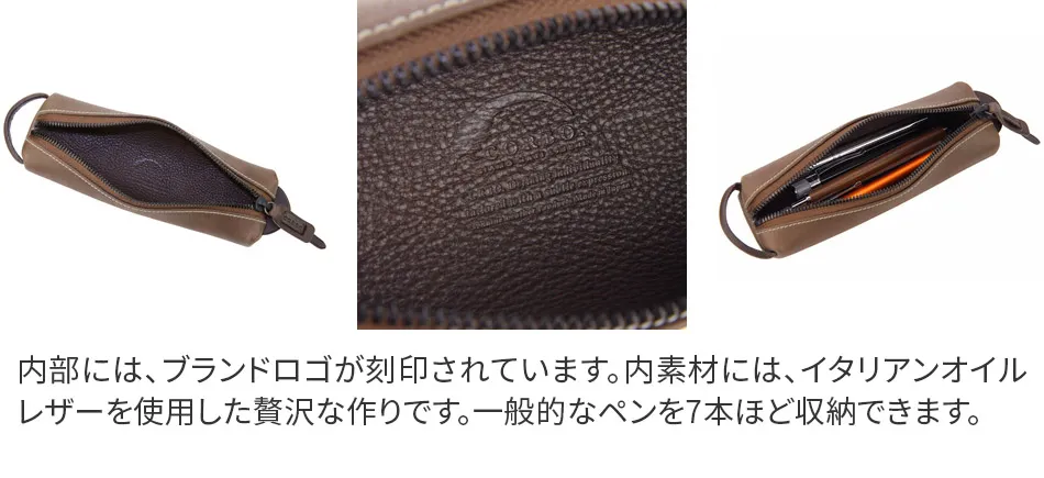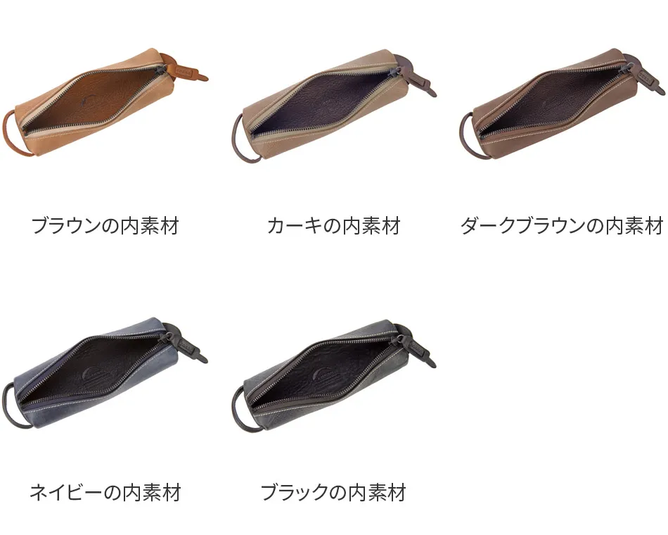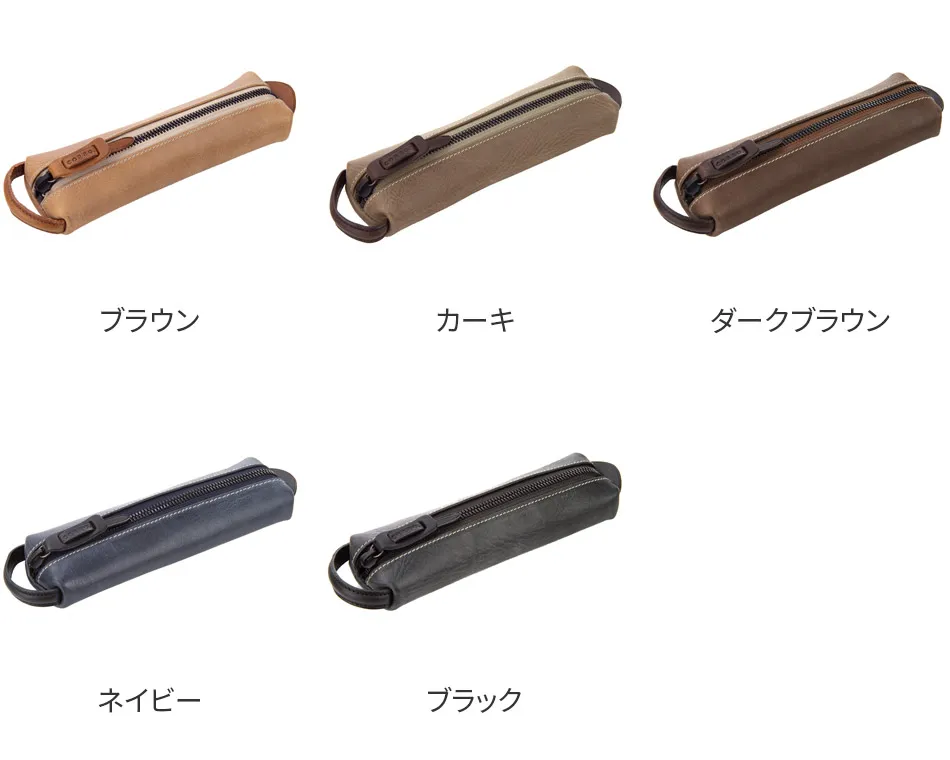 デスク回りにもこだわりたい大人の為のステーショナリー。浅い傷ならば擦るとすぐに馴染むのが特徴的な皮革です。デザインのアクセントにもなっているループやツマミはファスナーの開閉のしやすさを考えた作りで使用感も抜群です。 本体の皮革は、銀面を軽く擦り、染色とほどよいオイル加工で牛革の色や腰を ソフトに落ち着かせ、摩擦による焦がしの効果が出やすいワックス加工を施しています。素朴な雰囲気の皮革に合わせ綿糸風のスパン糸で縫製することで、デニムジーンズの糸への色移りのような表情を出しているため、どこか暖かみを感じるような仕上がりも魅力的。