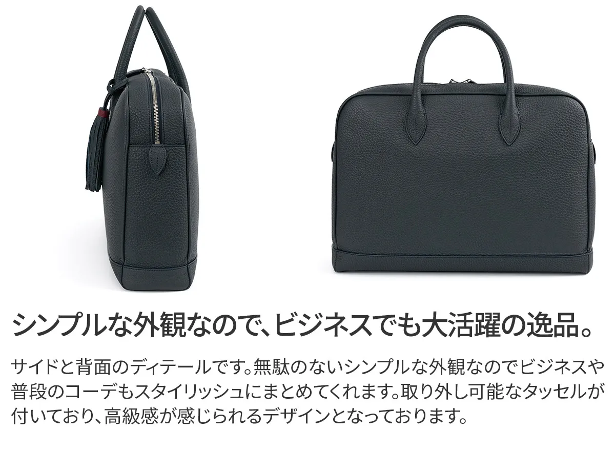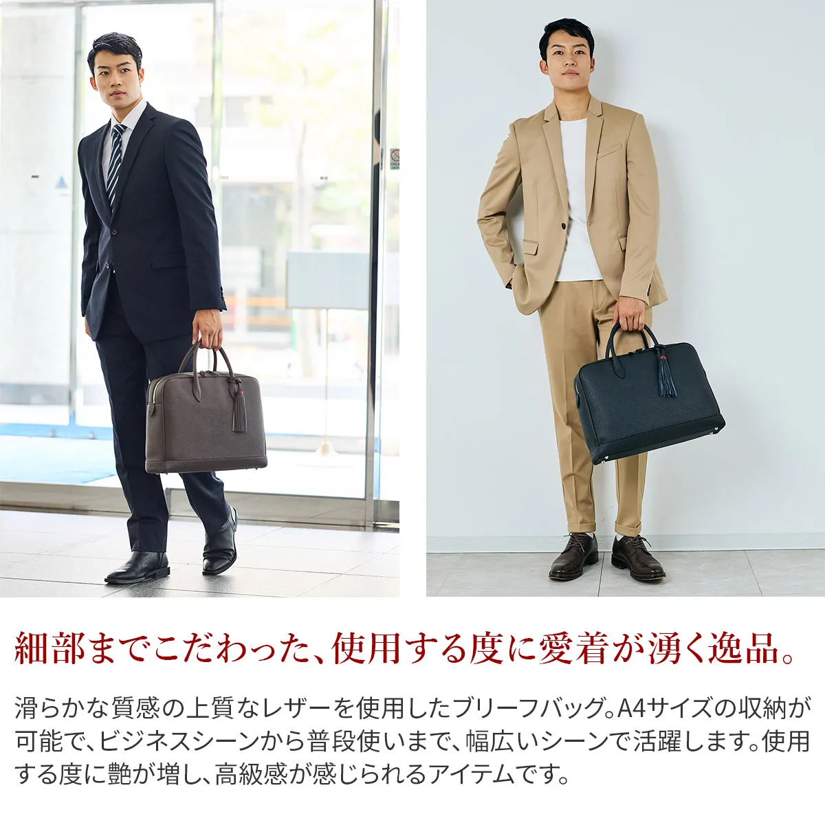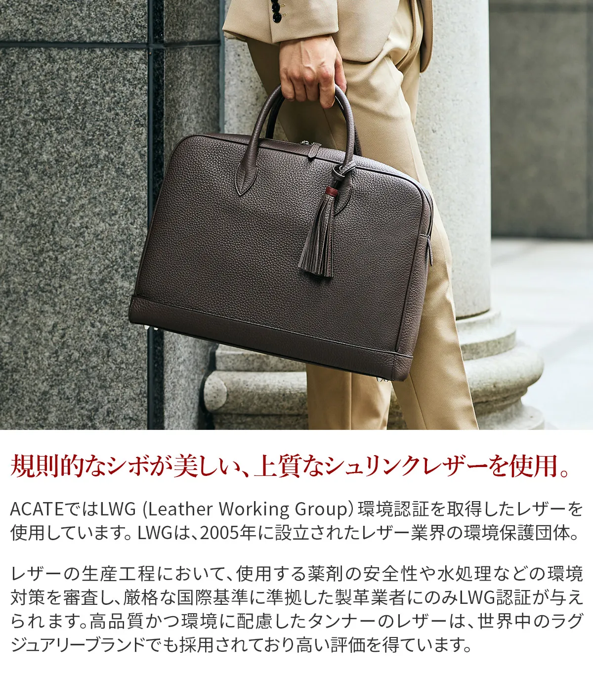 レザーには、上質でソフトな手触りが特徴のイタリア製シュリンクレザー(カーフレザー)を使用しています。 ACATEで採用しているシュリンクレザーは、耐久性、優雅さ、柔らかさを備えており、表面全体に均一で規則的なシボが入っている点が最大の特徴。 使い込むほどに美しい色艶を醸し出す、経年変化が楽しめるレザーです。 ACATEの生産は、MADE IN ITALYの高品質生産を追求し、細部へのこだわりと職人技で知られる工場"Dania”で行われています。 Daniaの強みは、職人技とテクノロジーへの両面投資にあり、伝統的な手縫いの価値を守りながらも、現代的なアプローチを提供しているという点。 Daniaの職人は様々な経験、年齢、背景を持っており、それぞれが専門領域で独自の特色を発揮しています。 40年以上にわたるハンドメイド技術の経験は、専門家の独自のこだわりであり、彼らは絶えず自己を更新し、イタリアとフランスのハイブランドの卓越した品質を維持し続けてきました。 そしてデジタル化による仕上げは、イタリアの最も才能ある若手職人によって担当されています。 Daniaは、コラムマシン、デジタルカッティング、ロングアームマシン、360度アームマシンなどが備わっており、常に最新の技術を提供。 長年にわたり培われた職人技と最新技術の融合が、高品質なプロダクトの提供を可能にしているのです。 滑らかな質感の上質なレザーを使用したブリーフバッグ。使用する度に艶が増し、高級感も増していきます。 A4サイズが入る大きさなので普段使いはもちろん、ビジネスシーンでも活躍するアイテムです。 普段のスタイルを格上げしてくれる逸品です。