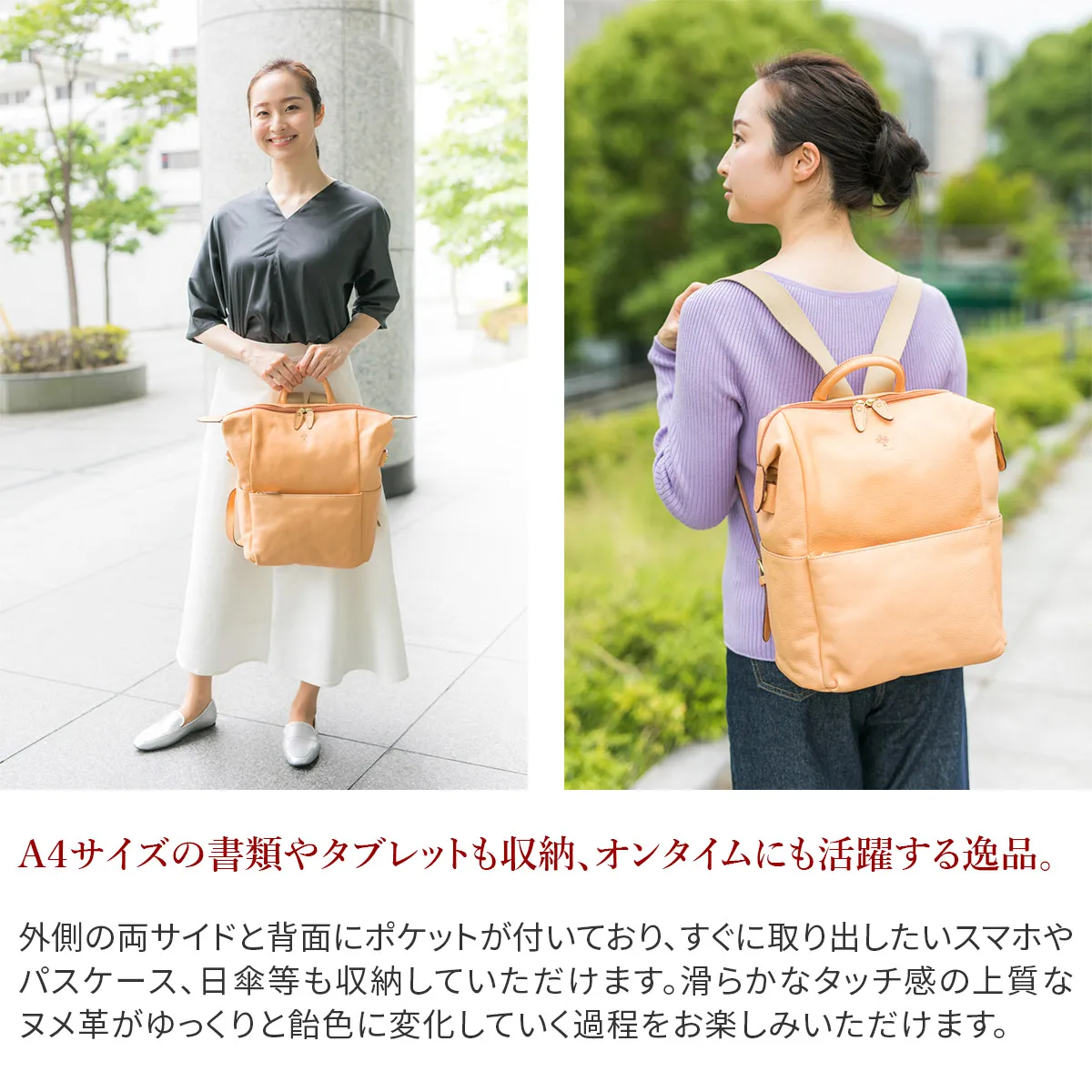 「自然を大切にしたい」はALBEROのフィロソフィー。 Naturaleは、それを象徴するシリーズ。 牛革ショルダー部を植物タンニンでなめし染色を施さず使う程に飴色に変化して光沢が増す素材。 サイドのタック使いにより全体に立体感を出し、見た目にも美しいディテールが印象的なトートバッグです。 長さの異なるショルダーベルトが2本付属されており、ナスカンで簡単に着脱ができるのでシーンやコーデに合わせて持ち方をアレンジしていただけます。 B5書類が収納可能でデイリー使いにぴったりなサイズ感です。通勤・通学バッグとしても活躍してくれます。