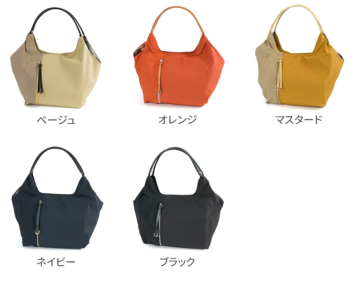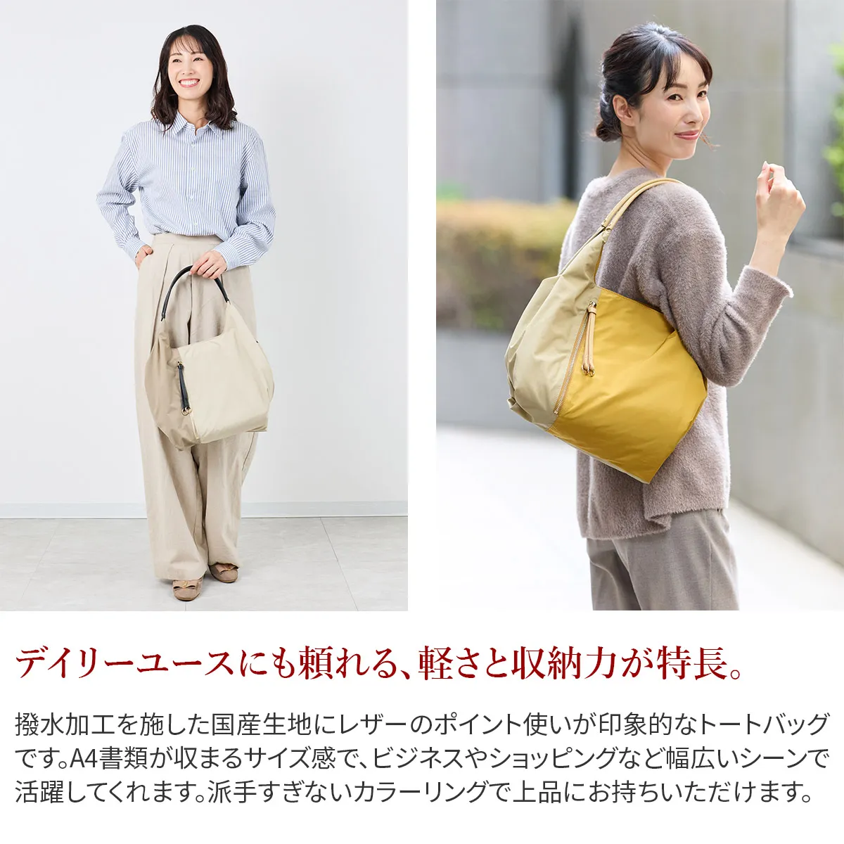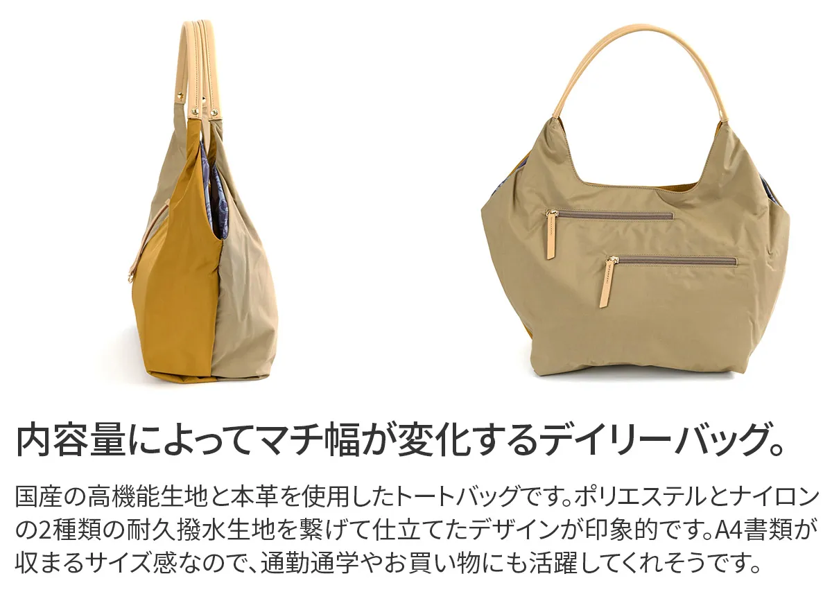 国産の撥水生地と優しいタッチ感の牛革を使用しています。 水や汚れを弾き、軽量でお手入れもかんたん。空模様を気にせず、抜群の使い勝手で毎日活躍してくれるバッグです。 《素材の特性》 天然皮革を使用しており、革そのものの風合いを生かすため、過度な色止め加工などは行っておりません。そのため、水に濡れたり、強い摩擦などにより、色落ちする恐れがございます。 耐久撥水生地を使用したA4対応トートバッグです。ベーシックながらポケットが豊富に備わっているので、小物類をスッキリ収納できます。 中身の容量に合わせてマチ幅が可変し、入れるものによって異なるフォルムでお持ちいただけます。 メインファスナーの側にはマグネットを備え、ファスナーを開閉しなくてもマグネットだけで中身へアクセスができるようになっています。 通勤にはもちろん、プライベートシーンにも活躍してくれるアイテムです。