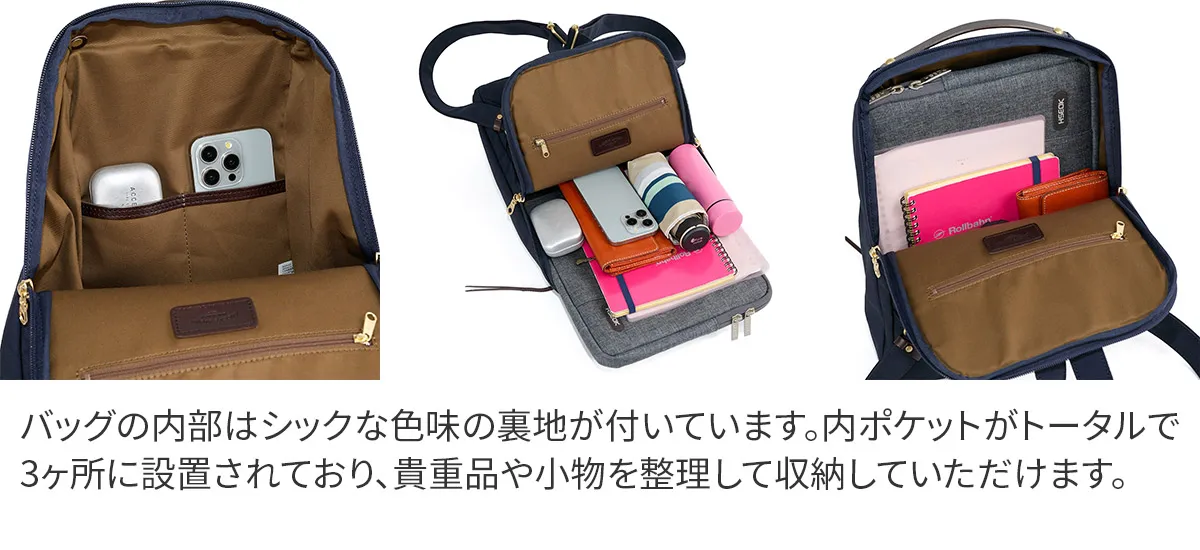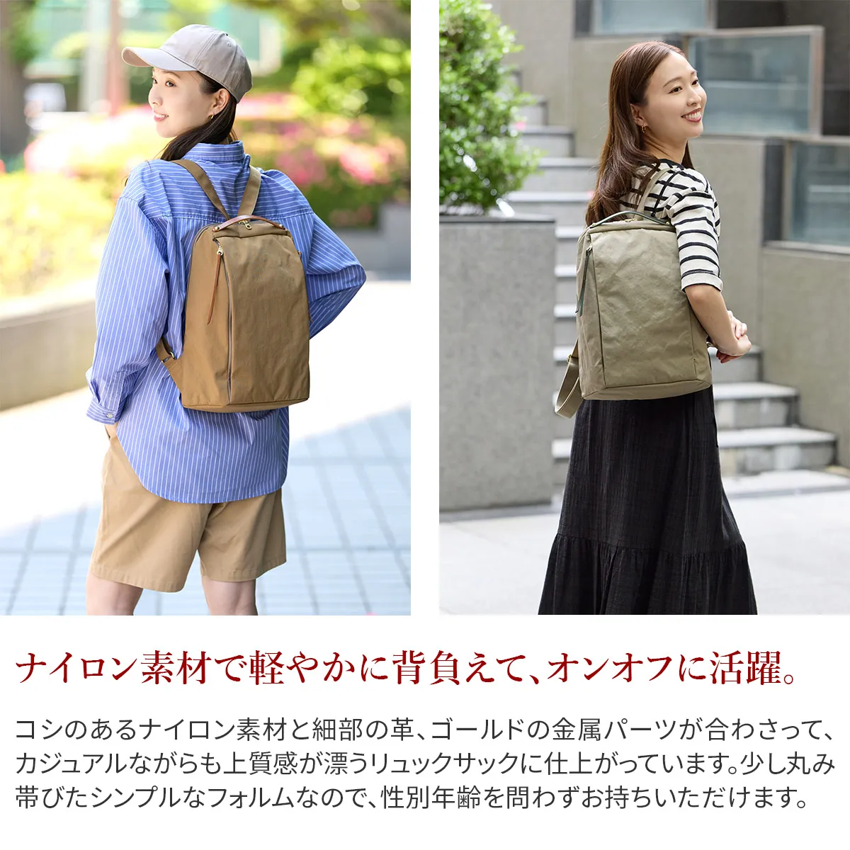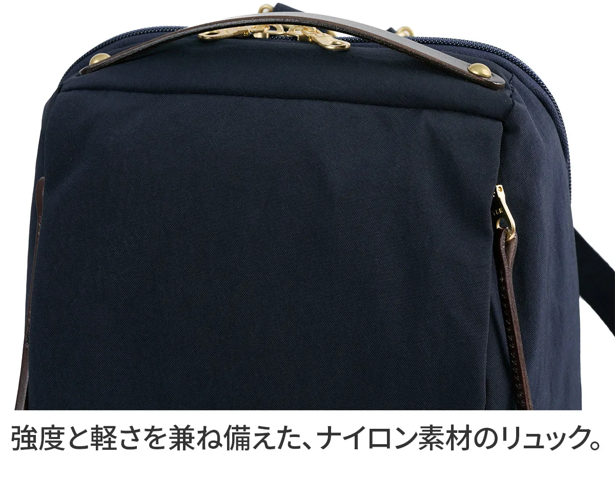 塩縮加工により生地の密度を上げた、強度と軽さを兼ね備えたナイロン素材を使用。生地の表面にできる凹凸により、光の当たり具合で様々な表情を見せてくれます。 コシのあるナイロン素材と細部の革、ゴールドの金属パーツが合わさって、カジュアルながらも上質感が漂うリュックサックに仕上がっています。少し丸み帯びたフォルムですが、外ポケットも隠れた作りでシンプルな佇まいなので、性別年齢を問わずお持ちいただけます。軽量な作りでオンオフに活躍してくれます。