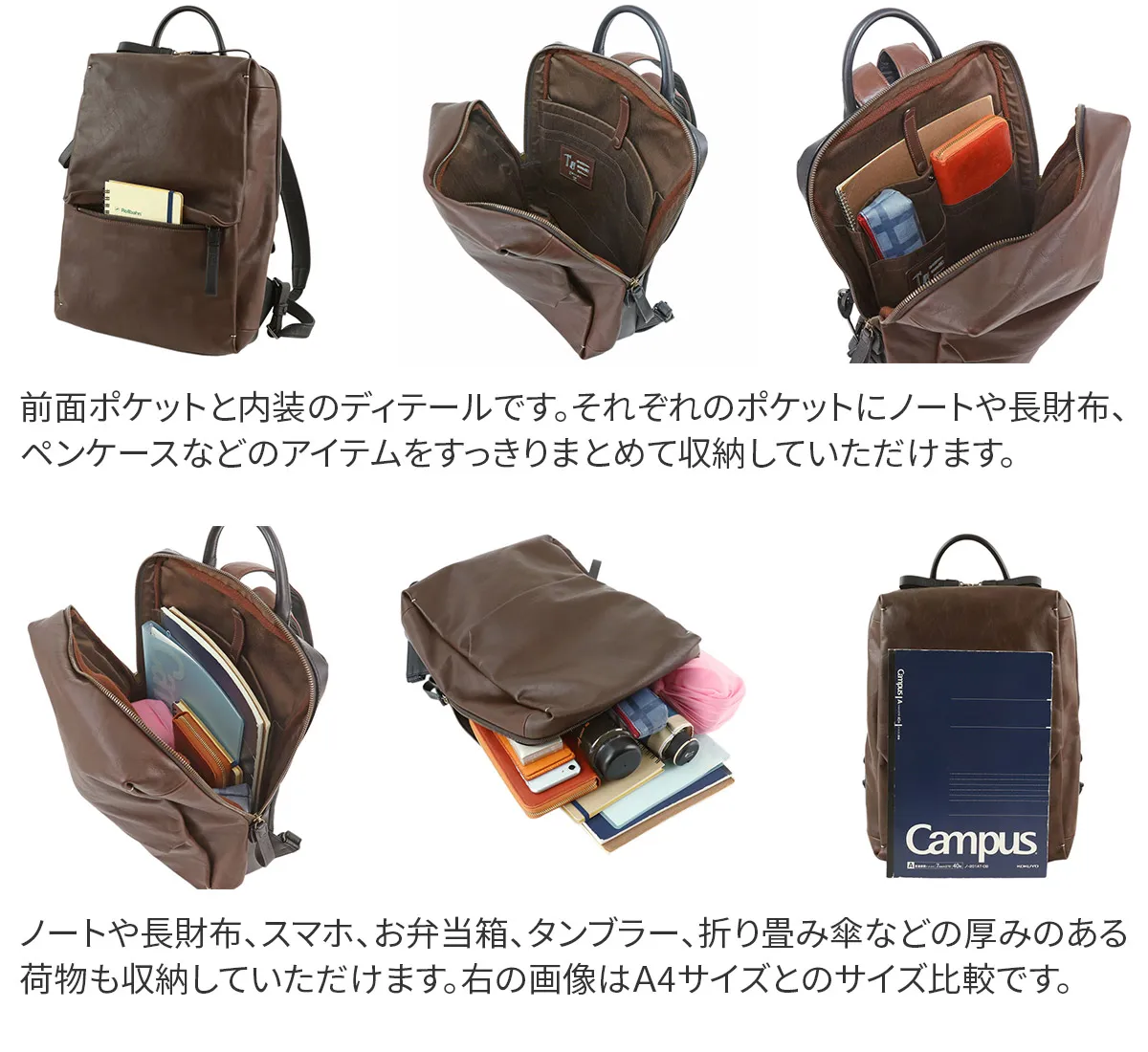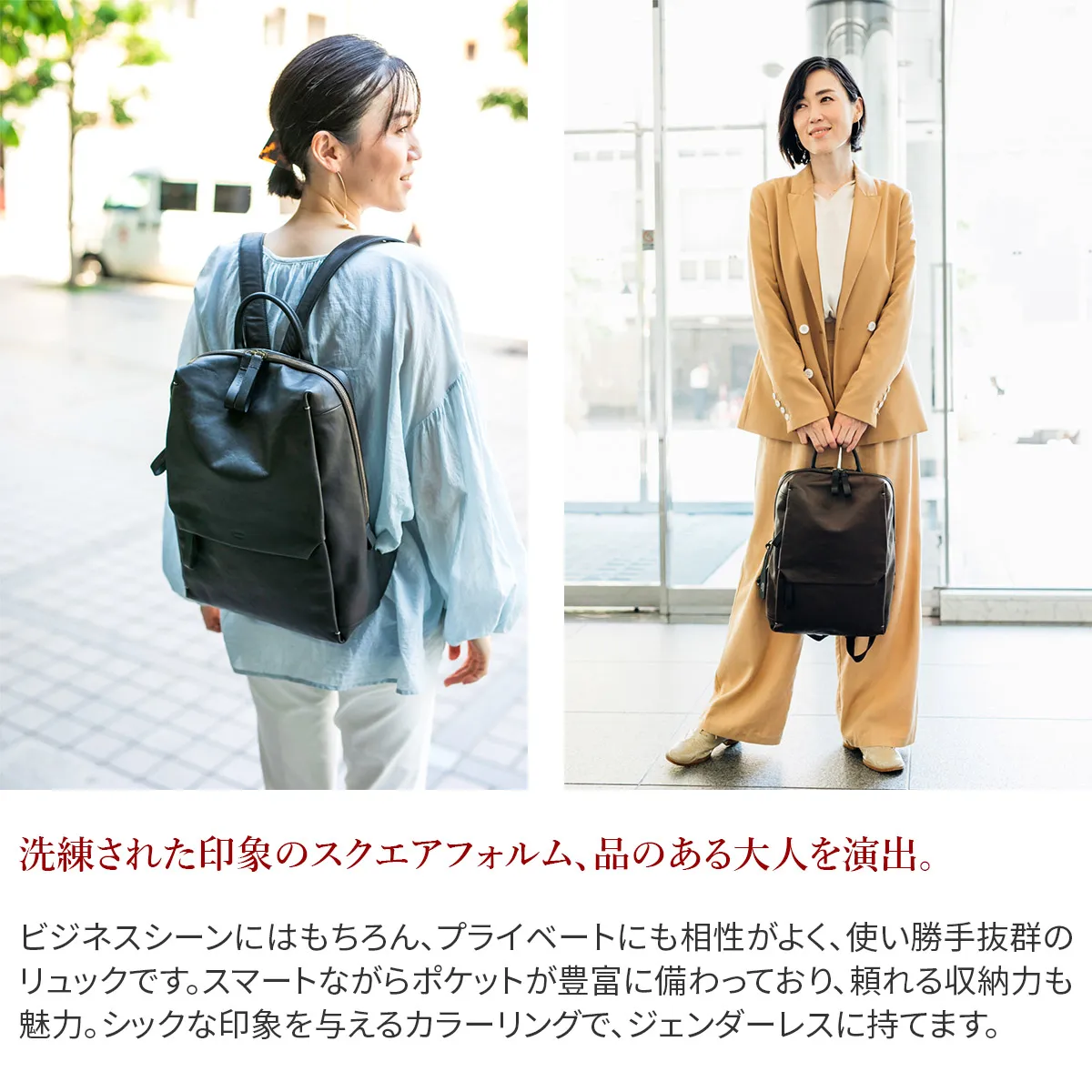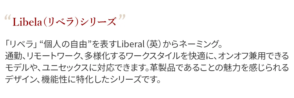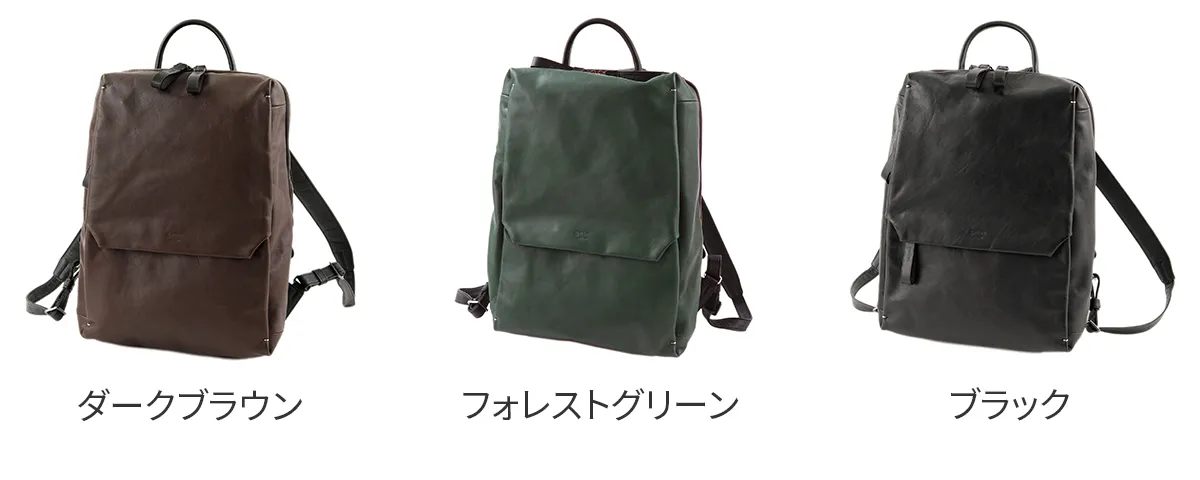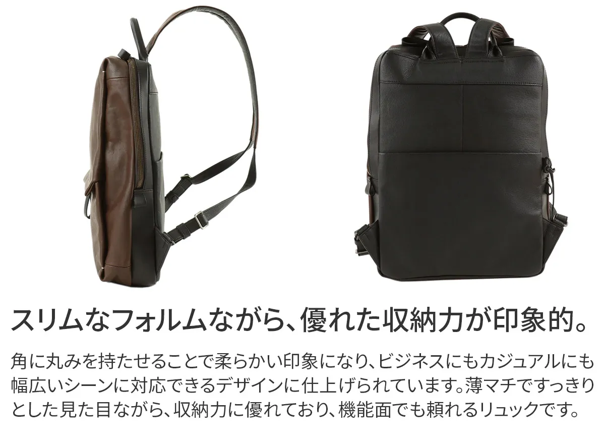 「リベラ」”個人の自由”を表すLiberal(英)からネーミング。 通勤、リモートワーク、多様化するワークスタイルを快適に、オンオフ兼用できるモデルや、ユニセックスに対応できます。 革製品であることの魅力を感じられるデザイン、機能性に特化したシリーズです。 <素材の特性・メリット> 北米産のステア原皮を国内でタンニン鞣しの熟練タンナーで仕上げた牛革で、しなやかさとコシを絶妙に併せ持った仕上がりになっています。 引き締まった繊維と、スムース仕上げでありながら地肌の表情が豊かに現れるところが北米原皮の魅力です。 ほぼ素上げに近い表面仕上げの為、経年変化は透明感のある艶が生まれてきます。それでいて、雨ジミになりにくいのもメリットです。 付属には、厚手で堅牢な牛ヌメ革と、軽量で丈夫な国産ピッグレザーを用途に応じて使用しています。 スクエア型のすっきりとしたフォルムが目を惹く、ユニセックスデザインのリュックです。 リュック前面のファスナーポケットのフラップがアクセントになっており、クラシカルな印象をプラスしています。 A4書類がすっぽり収まるサイズ感で、スーツスタイルにも合わせやすく様々なシーンで活躍します。