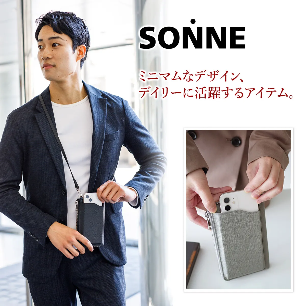 上品なレザーをふんだんに使用したバッグコレクション「CLAUDIO(クラウディオ)」。 時代のトレンドに左右されない、普遍的で長く使用できるデザインが特徴です。 オールレザーならではの高級感とポケット等の充実した収納が魅力。 SONNE(ゾンネ)の定番コレクションです。 スマートフォンを収納するバッグ機能とお財布機能が兼ね備えられています。 必要最低限の持ち物を携帯することができ、ちょっとした外出や出張、旅行にも適しています。 ショルダーベルトは取り外しできるため、シーンに合わせてアレンジしてお使いいただけます。 コーディネートのアクセントになるカラーから定番のカラーまで幅広くお楽しみいただけます。