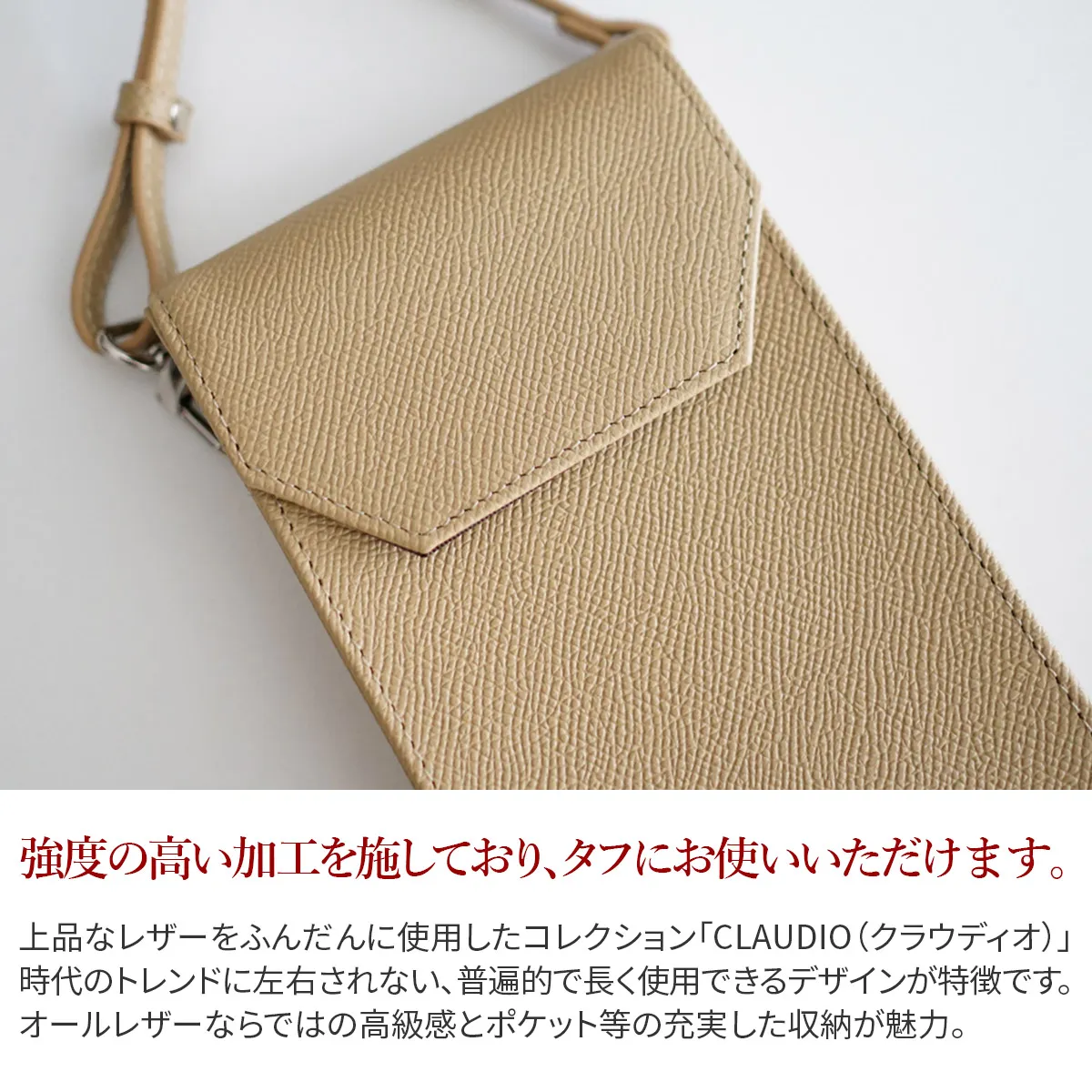 上品なレザーをふんだんに使用したバッグコレクション「CLAUDIO(クラウディオ)」。 時代のトレンドに左右されない、普遍的で長く使用できるデザインが特徴です。 オールレザーならではの高級感とポケット等の充実した収納が魅力。 SONNE(ゾンネ)の定番コレクションです。 サブバッグとしてスマホとカードだけを収納してお持ちいただくとお会計もスムーズです。 ショルダーベルトも幅広く調節できるので、アウターの上からでもお使いいただけます。