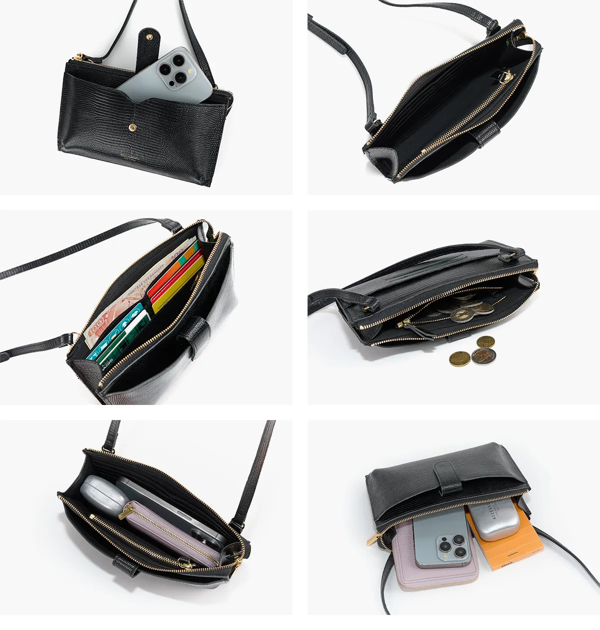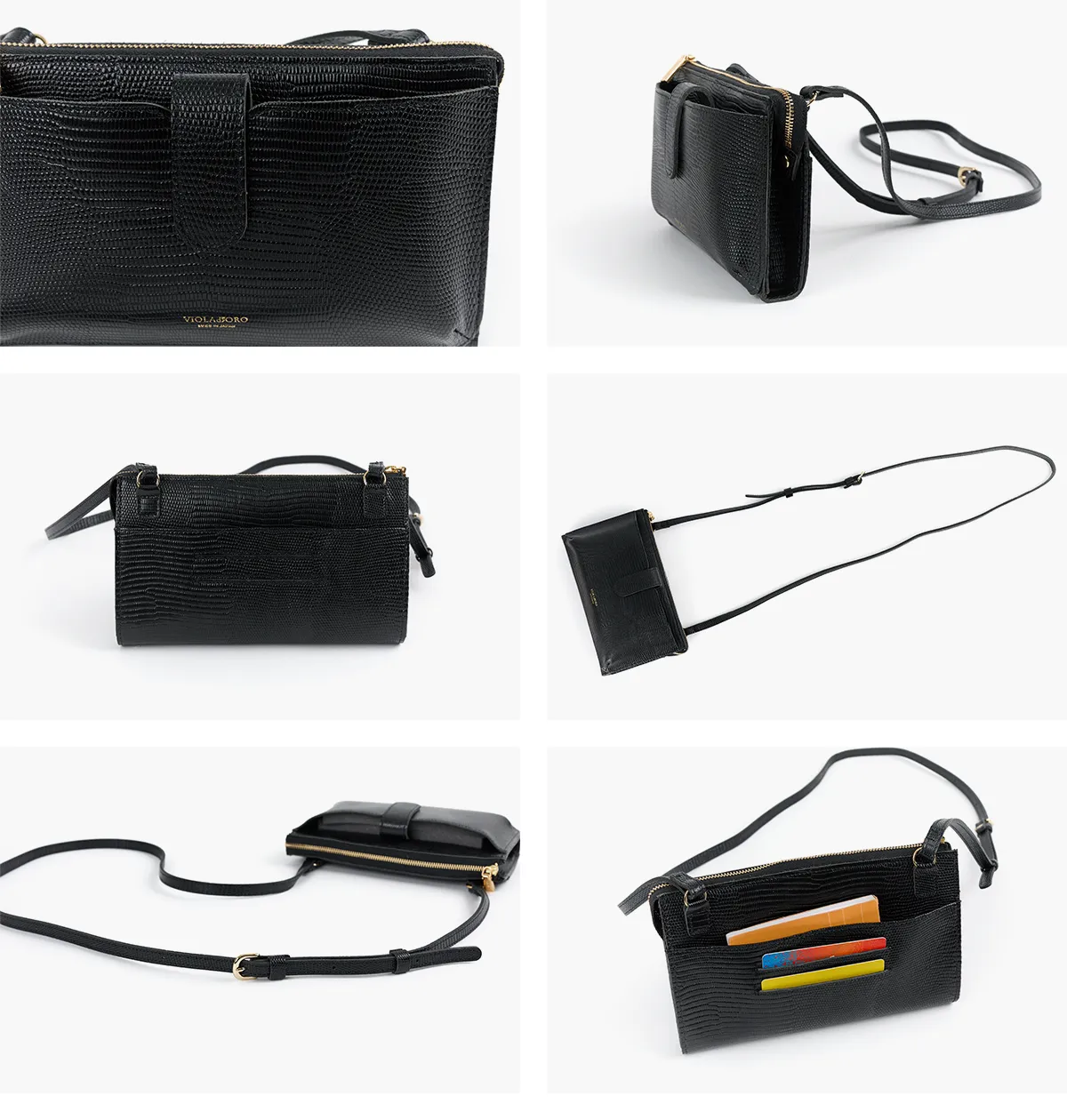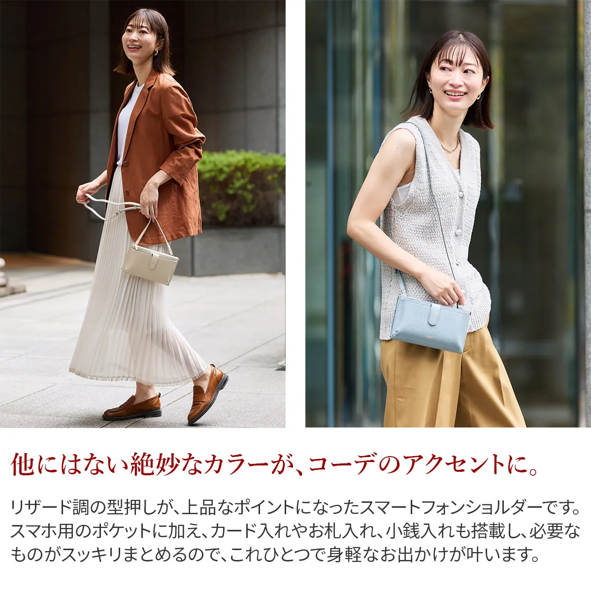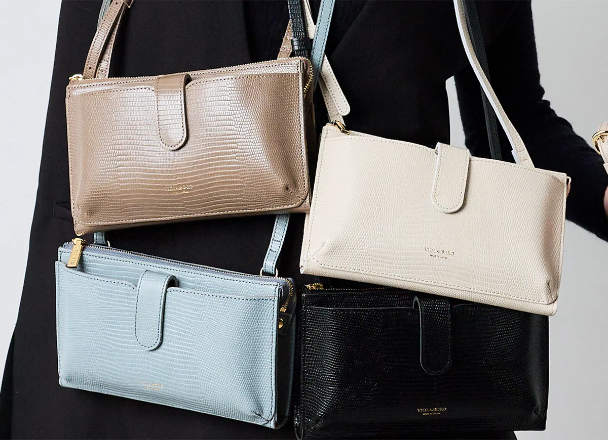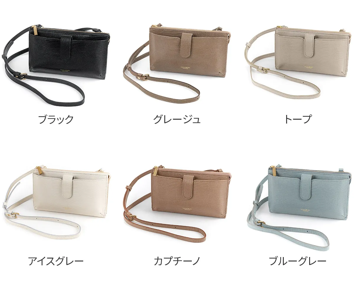 お出かけに必要なものすべてが収まるスマートフォンポシェット。リザードの型押しレザーが高級感を醸し出します。 内ポケットには、カード入れやファスナーポケットがついており、コンパクトに収納できます。 カラー展開も豊富なので、普段のコーディネートのアクセントとしてもぴったりな逸品です。