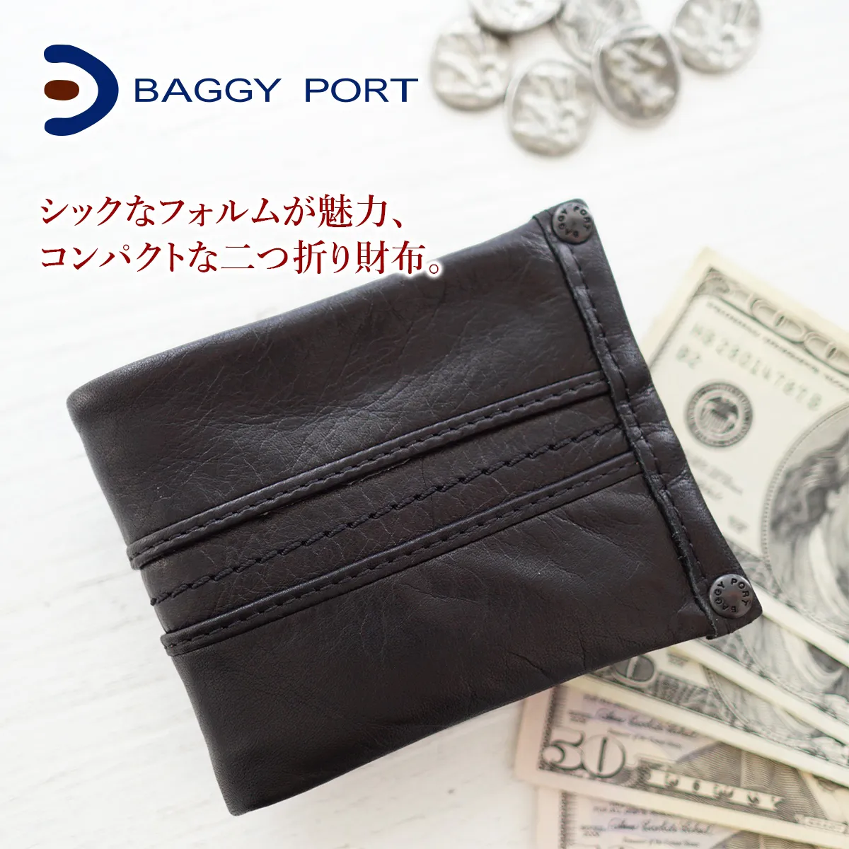BAGGY PORT(バギーポート) フルクロームWAX シリーズ 小銭入れ付き 二つ折り財布 SNK-611 シンプルでコンパクトなのに大容量、 「大人カジュアル」ウォレット。
