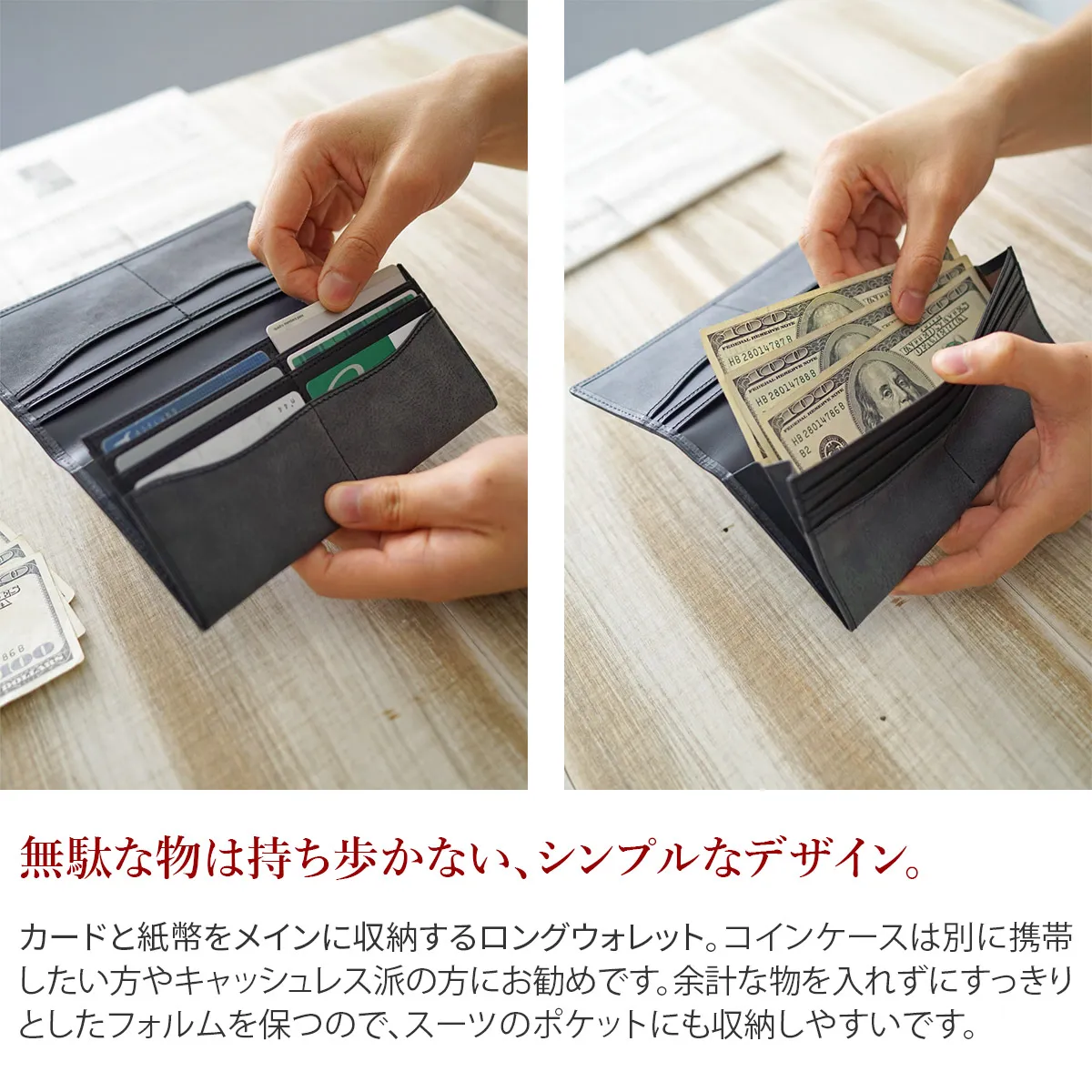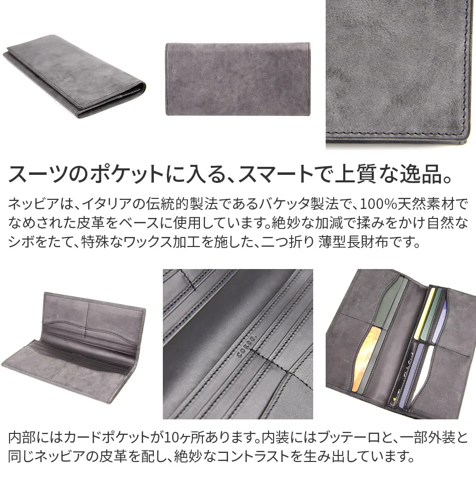 カードと紙幣をメインに収納するロングウォレット。コインケースは別に携帯したい方やキャッシュレス派の方にお勧めです。余計な物を入れずにすっきりとしたフォルムを保つので、スーツのポケットにも収納しやすいです。 霧に包まれたような表情のネッビア。永い時間をかけて霧は晴れ、沁み込み、やがて貫禄を増していきます。内装は同じ地方の少し固い皮革(ブッテーロ)を使用し、一部ネッビアを配することでコントラストをつけています。