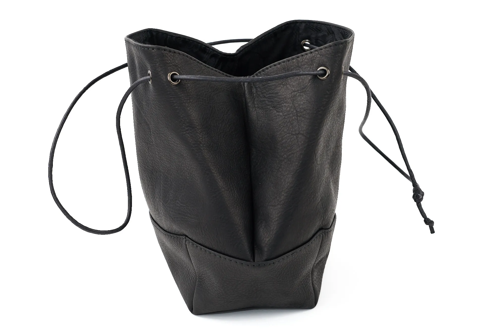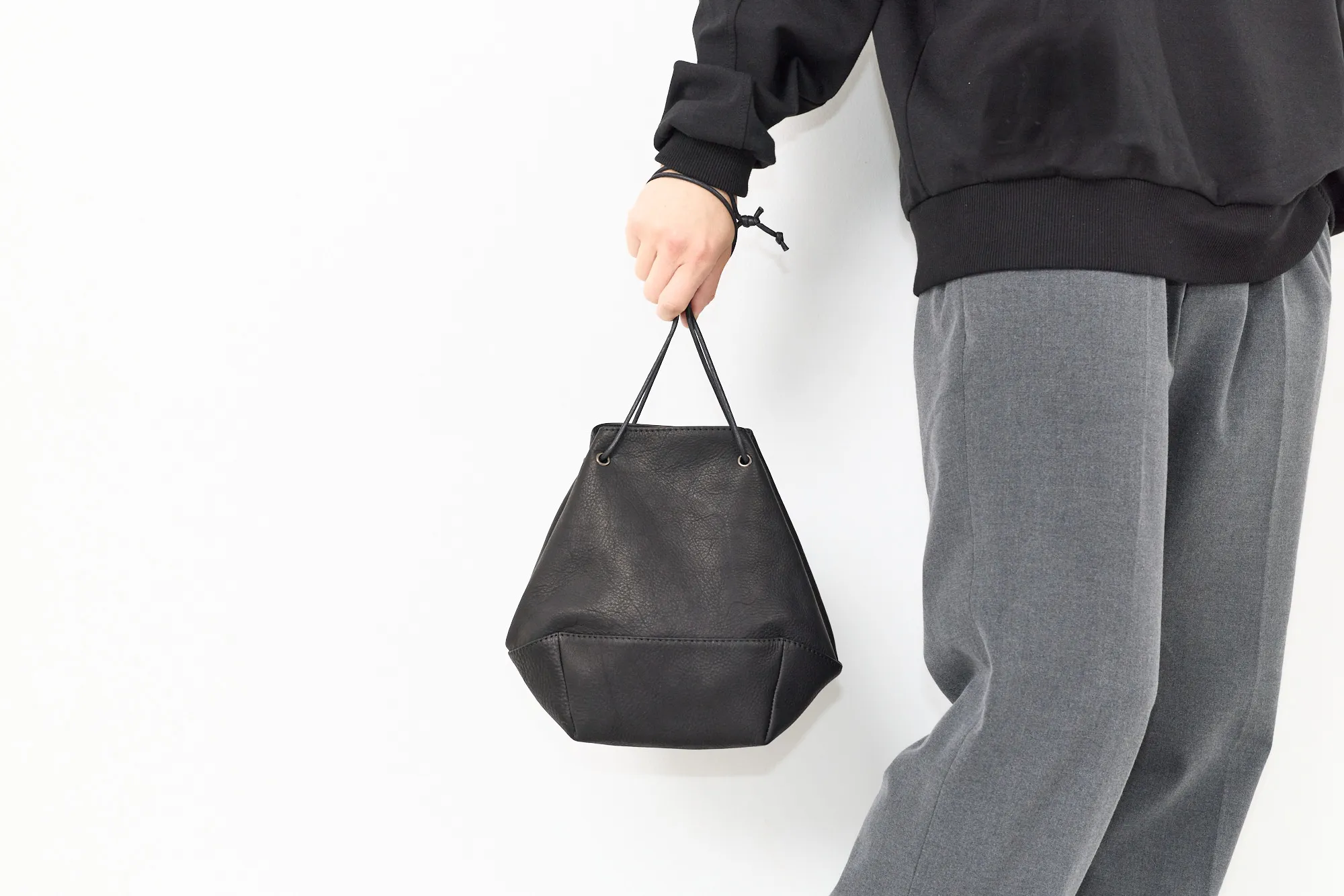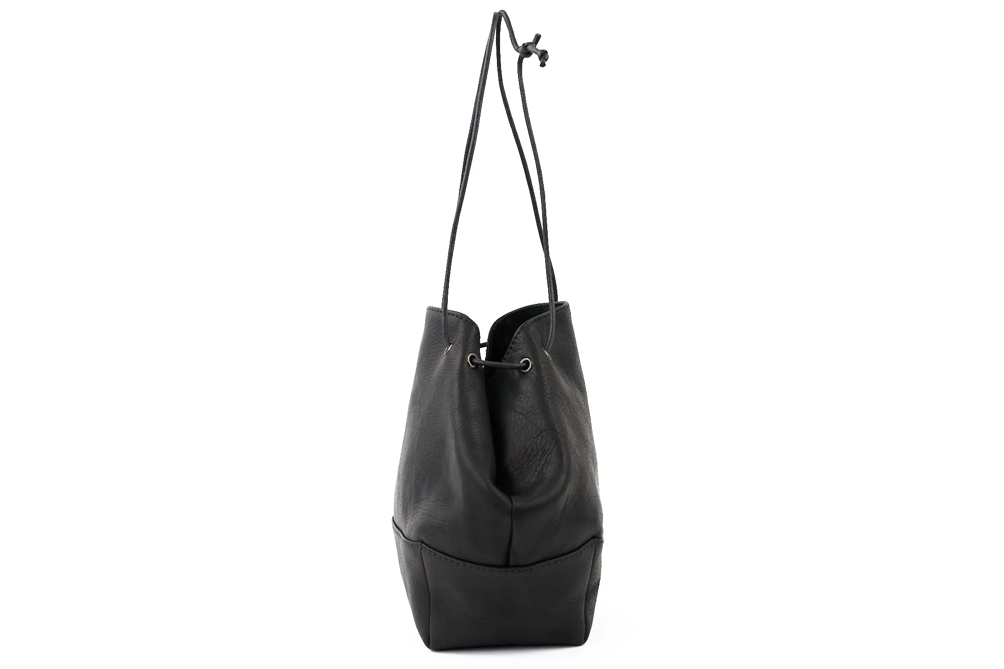 巾着バッグのラフな雰囲気と、レザーの上質感がうまくバランスされたモデルです。インパーマレザーは柔らかくしっとりした質感でありながら撥水性が高く、天候を気にせず使える実用性も魅力。 台形をベースにしたフォルムは見た目がすっきりしていて、巾着特有のカジュアルさを程よく抑えた印象。A5サイズが丁度収まるサイズ感で、必要な荷物がしっかり収まりつつ、スタイリングのアクセントとしても活躍します。 ロウ引きコードのショルダーは長さ調整がしやすく、手持ちと肩掛けの使い分けができる点も便利。シンプルながら存在感があり、男女問わず取り入れやすいバッグです。