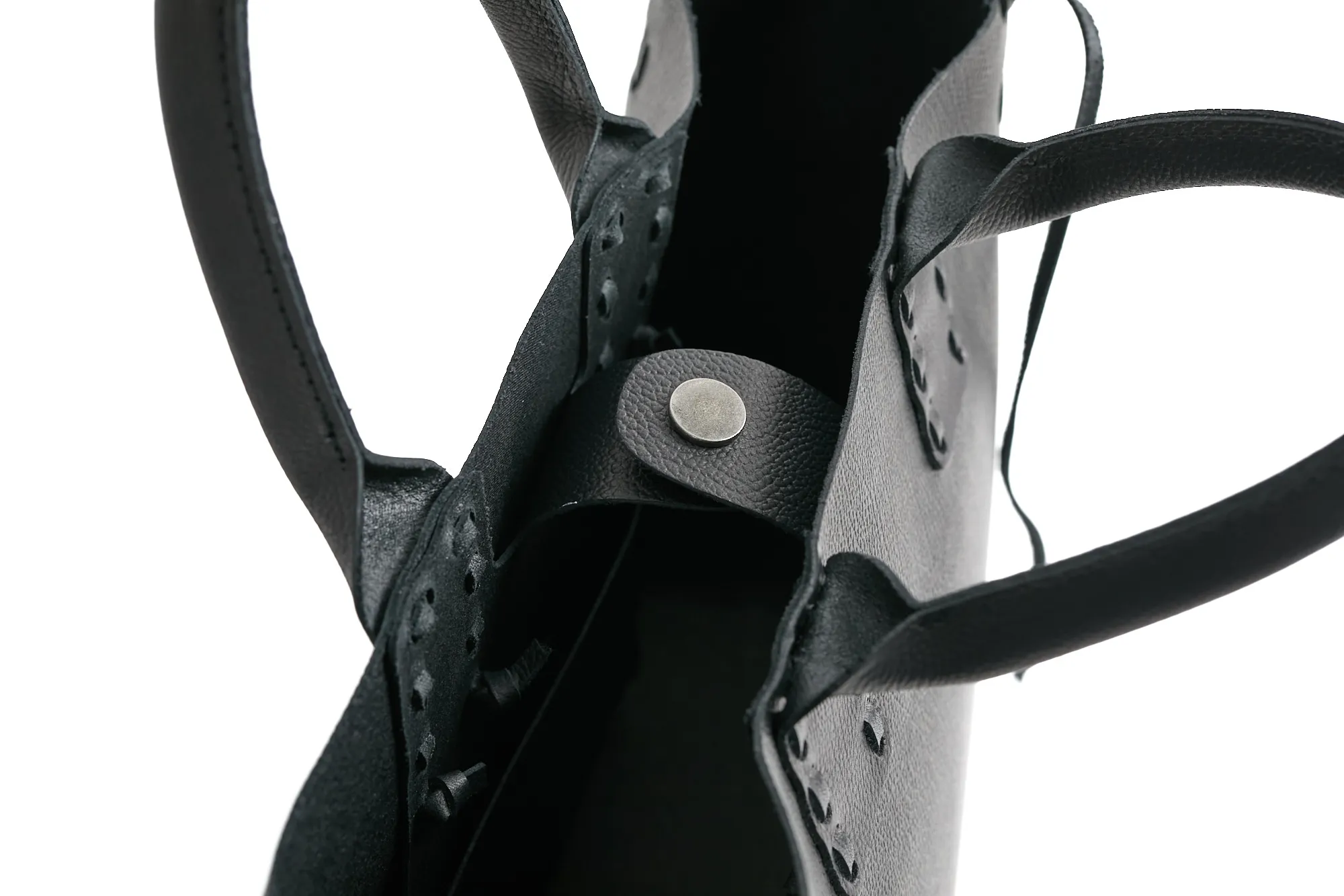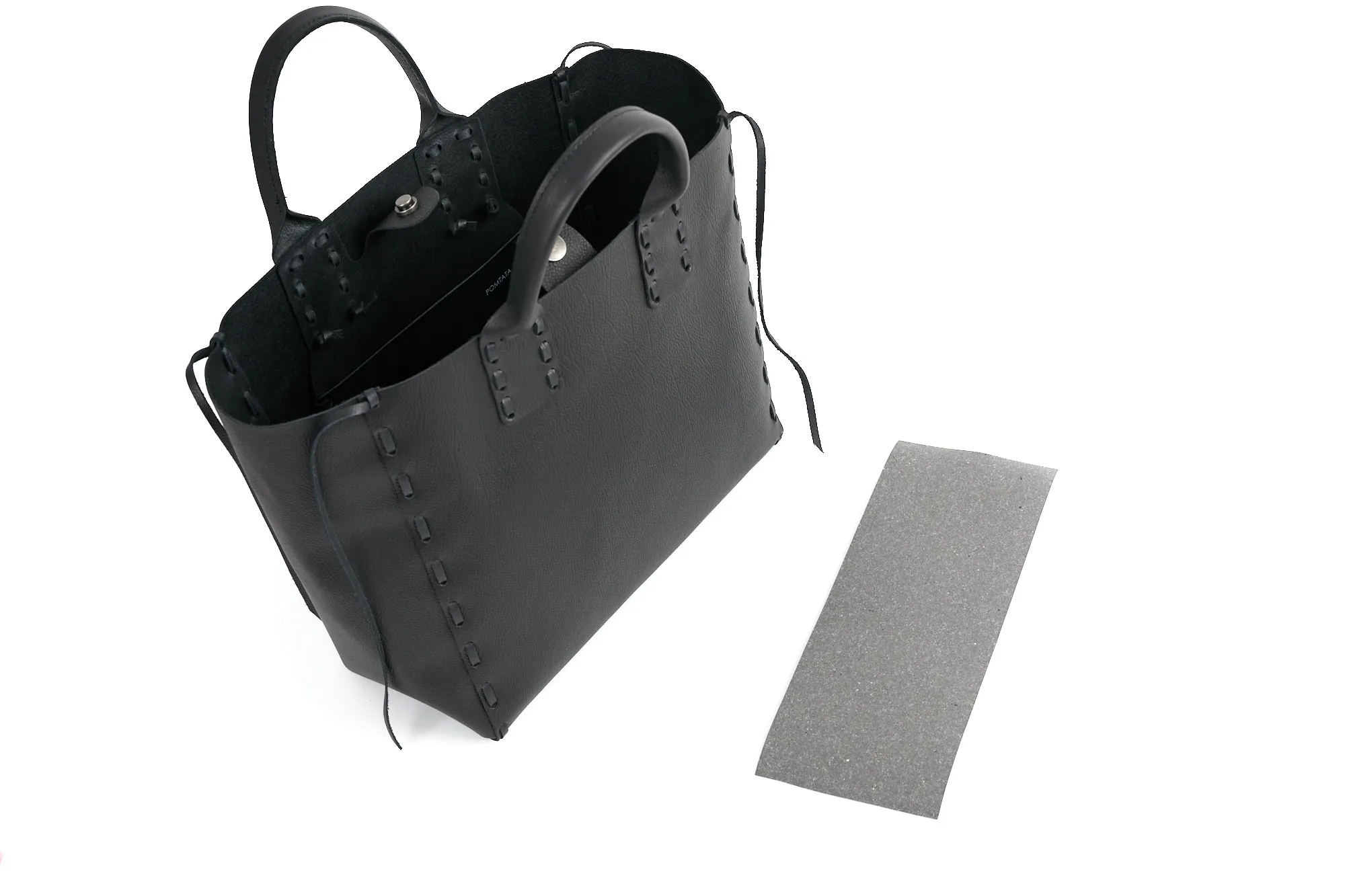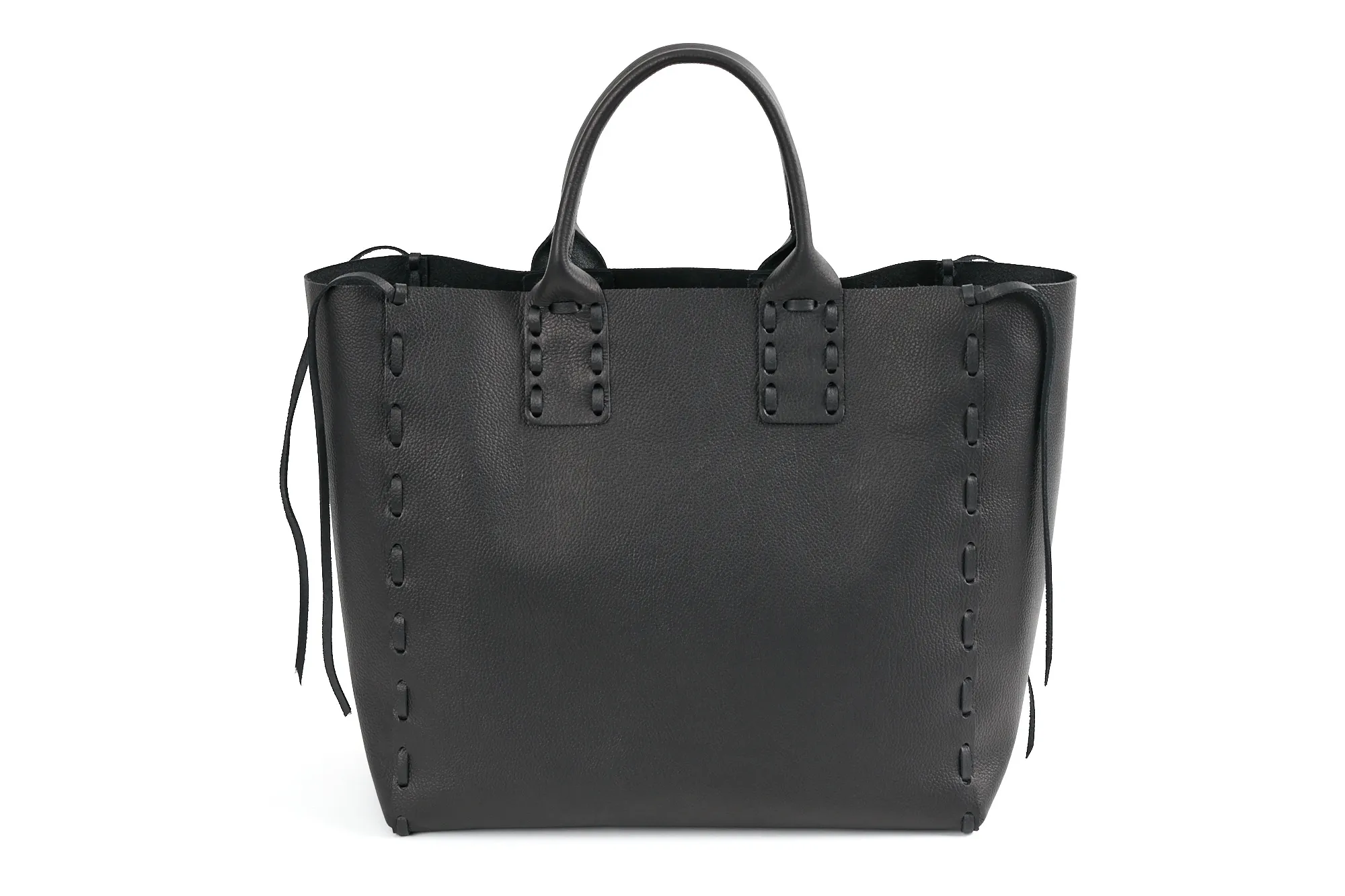 クラフト調の編み込みディテールを取り入れたトートバッグです。 革シボの型押しが、スタイリッシュながらもどこか温かみのある雰囲気を纏います。 開口部にあしらったインダストリアルな風合いのボタンがアクセントになっています。 A4対応の頼れる収納力でお仕事からプライベートまで対応。 一枚革で仕上げられているので、本革でありながらしっかり軽量も叶えます。
