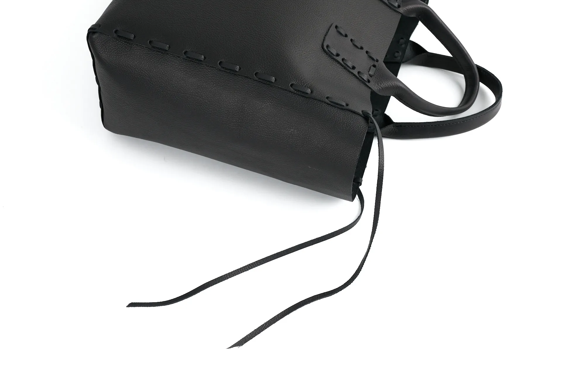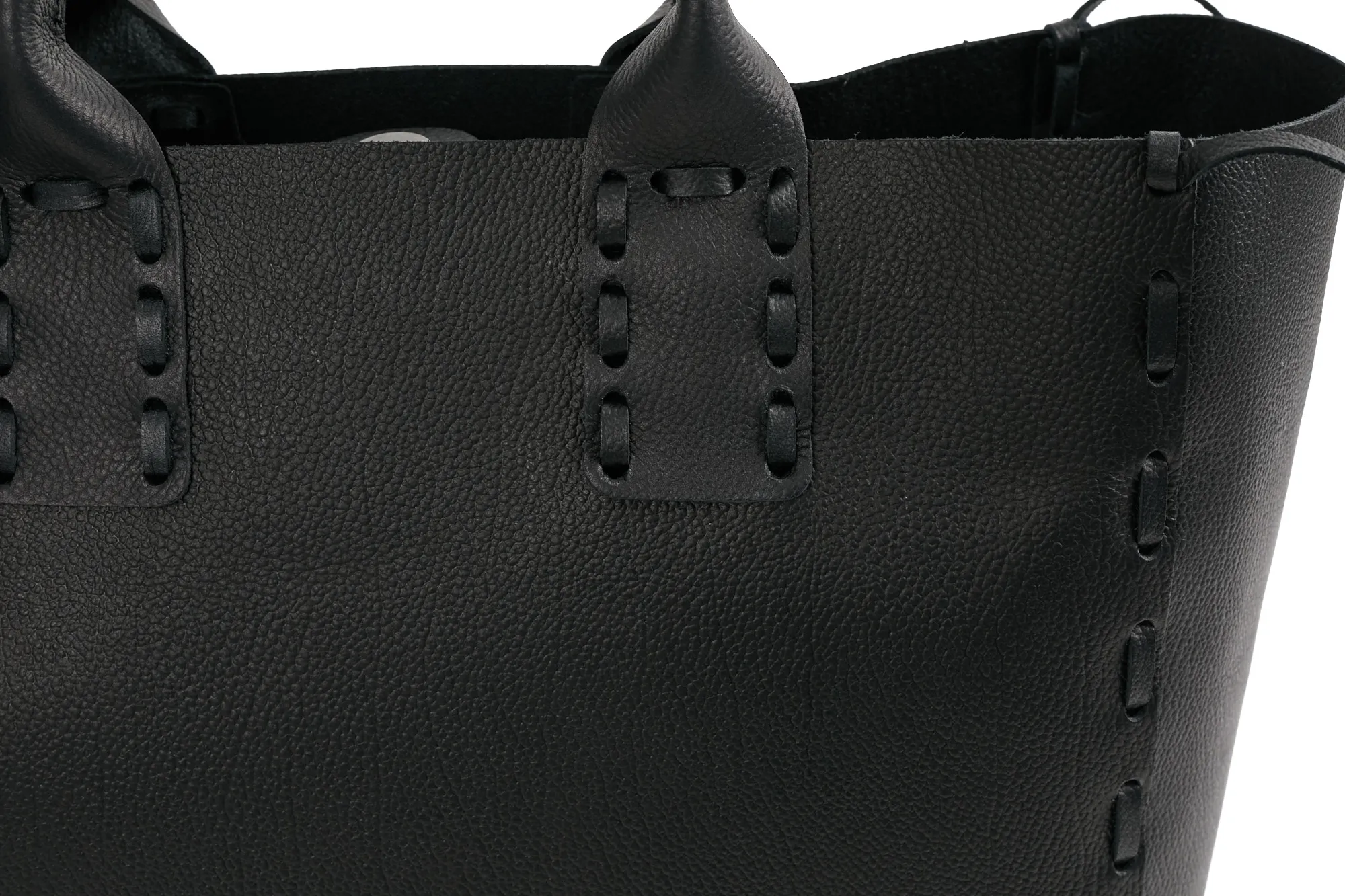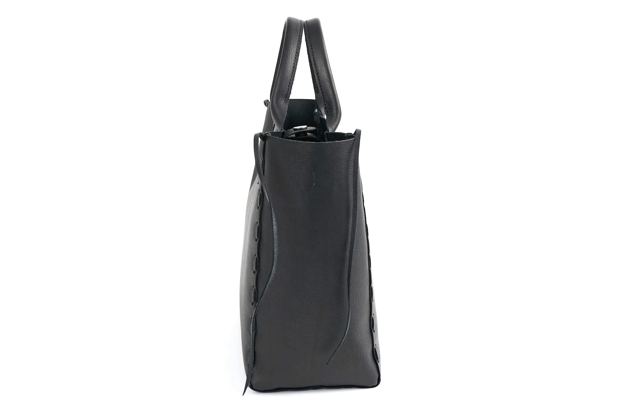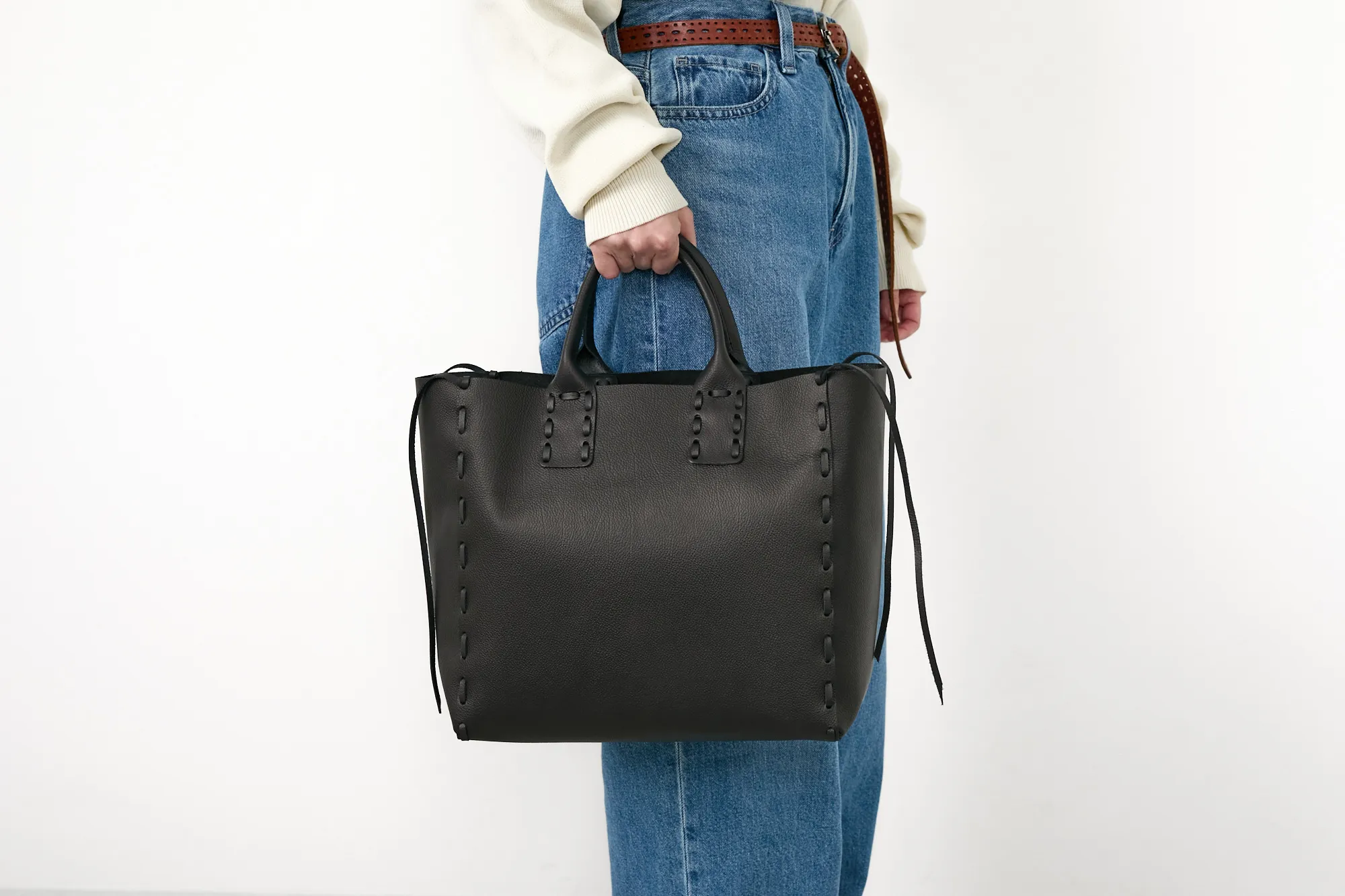 クラフト調の編み込みディテールを取り入れたトートバッグです。 革シボの型押しが、スタイリッシュながらもどこか温かみのある雰囲気を纏います。 開口部にあしらったインダストリアルな風合いのボタンがアクセントになっています。 A4対応の頼れる収納力でお仕事からプライベートまで対応。 一枚革で仕上げられているので、本革でありながらしっかり軽量も叶えます。