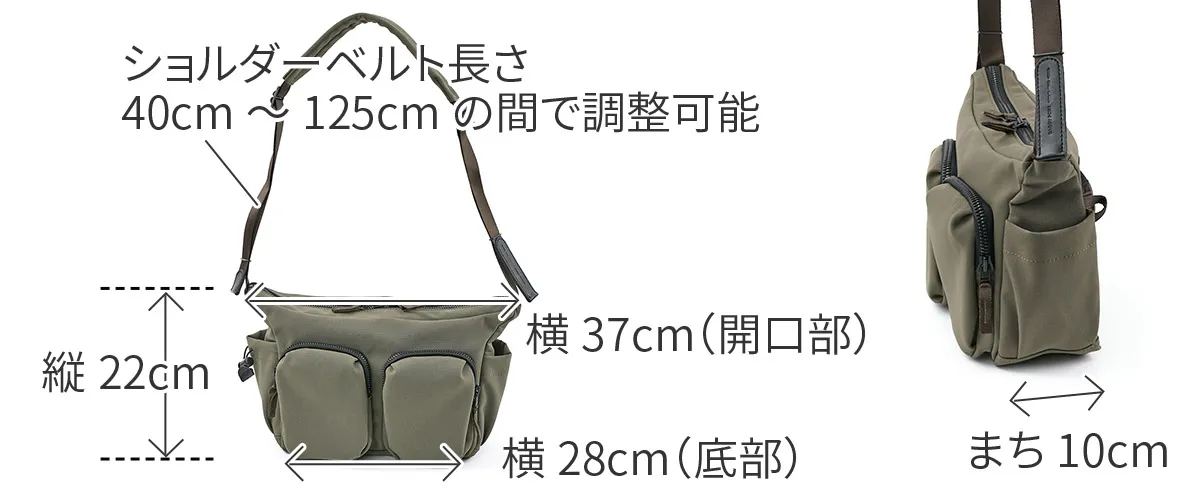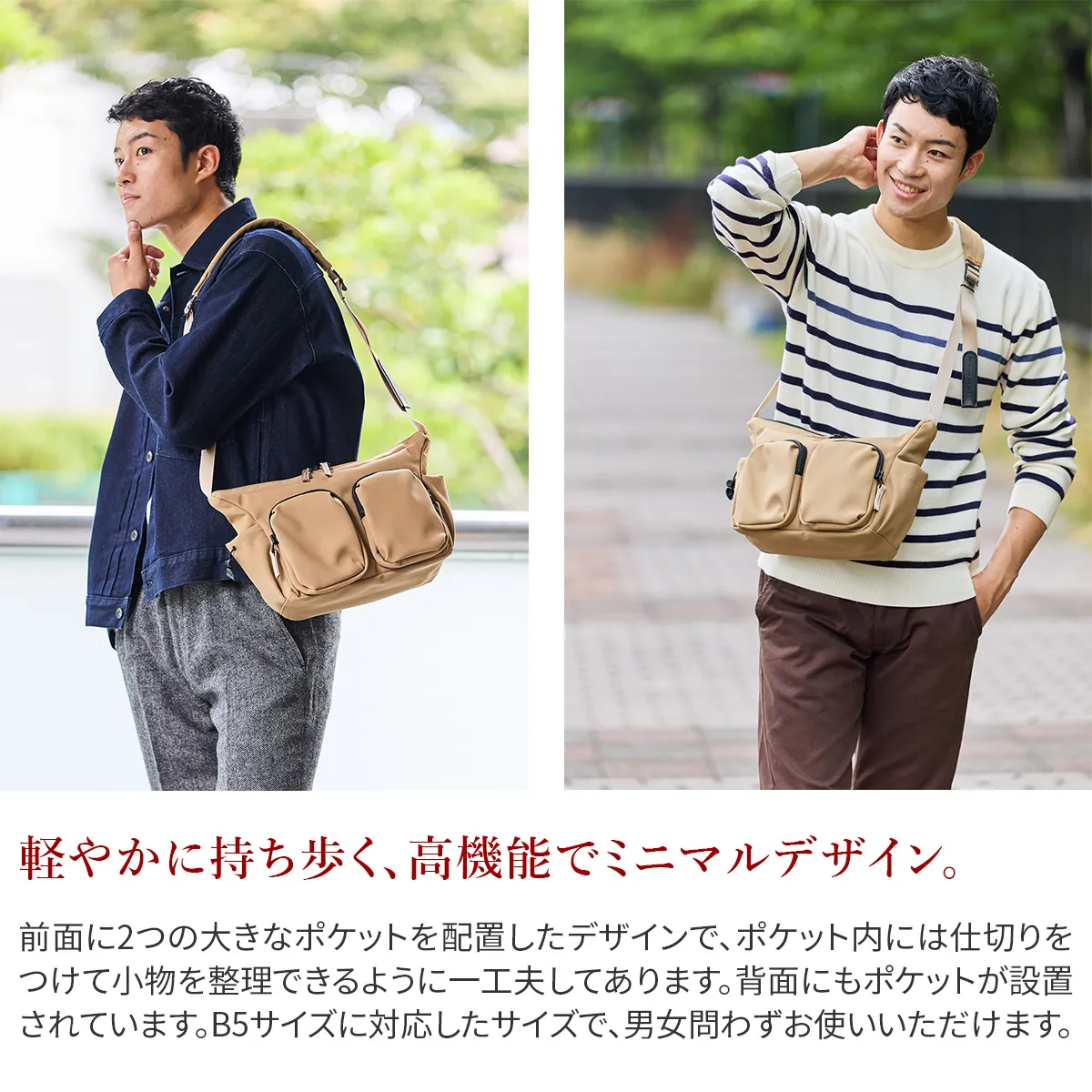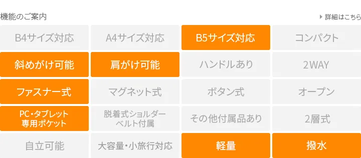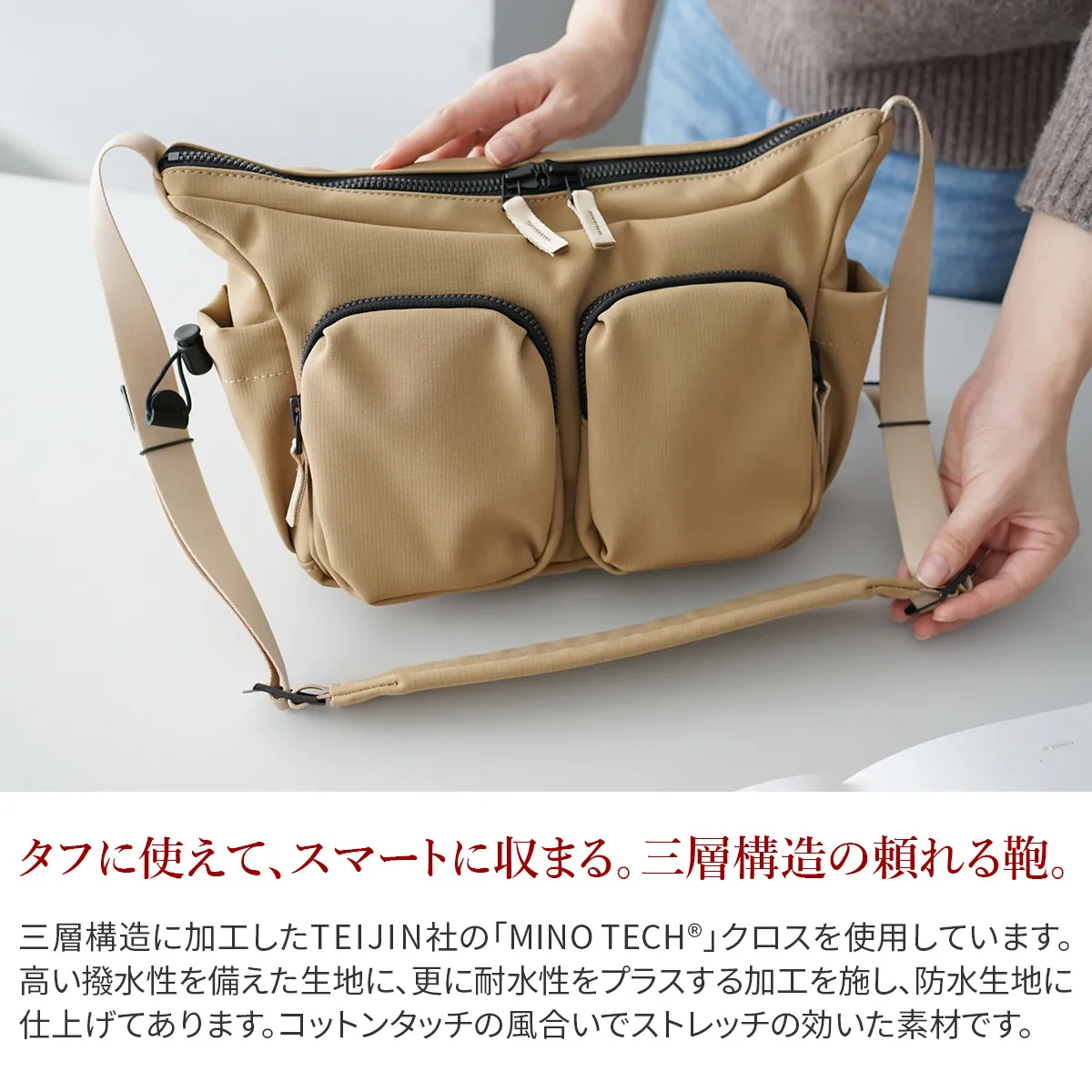 三層構造に加工したTEIJIN社 MINOTECH クロスを使用しています。高い撥水性を備えた生地に、更に耐水性をプラスする加工を施すことで防水生地に仕上げています。繊維としてはポリエステルですが、コットンタッチの風合いでストレッチの効いた素材ですので体にもなじみやすくヘビーユーズにも耐えうる丈夫な素材です。ファスナーにはメタル調のビスロンファスナーを使用しており、高級感はありながらも開閉がスムーズなのが特徴です。 前面に2つの大きなポケットを配置したデザインで、ポケット内には仕切りをつけて小物を整理できるように一工夫してあります。 左右側面にはマイボトルや折りたたみ傘なども収納できるポケットが設置されています。 背面にもファスナーポケットとトラベルでも便利なキャリーオンベルトと充実の機能性です。 B5サイズに対応したタブレットサイズで、男女問わずお使いいただけます。