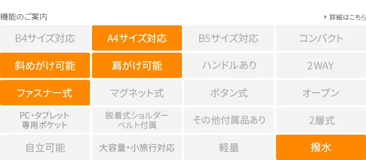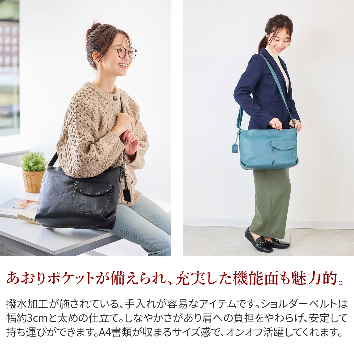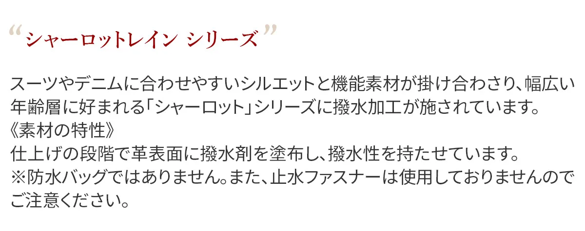 スーツやデニムに合わせやすいシルエットと機能素材が掛け合わさり、幅広い年齢層に好まれる「シャーロット」シリーズに撥水加工が施されています。 《素材の特性》 仕上げの段階で革表面に撥水剤を塗布し、撥水性を持たせています。 ※防水バッグではありません。また、止水ファスナーは使用しておりませんので、ご注意ください。 マットでしなやかな質感のレザーに撥水加工を施した、天気を気にせず使用できるショルダーバッグです。A4書類に対応した頼りになる収納力で、通勤や通学、休日のお出かけにも活躍します。ショルダーベルトは幅約3cmと太めで安定して持つことができます。