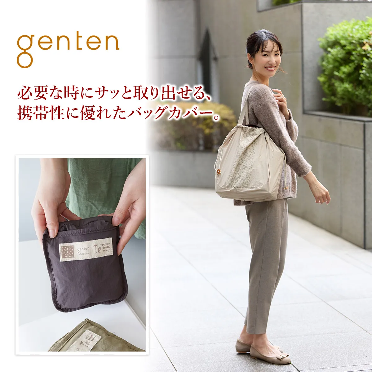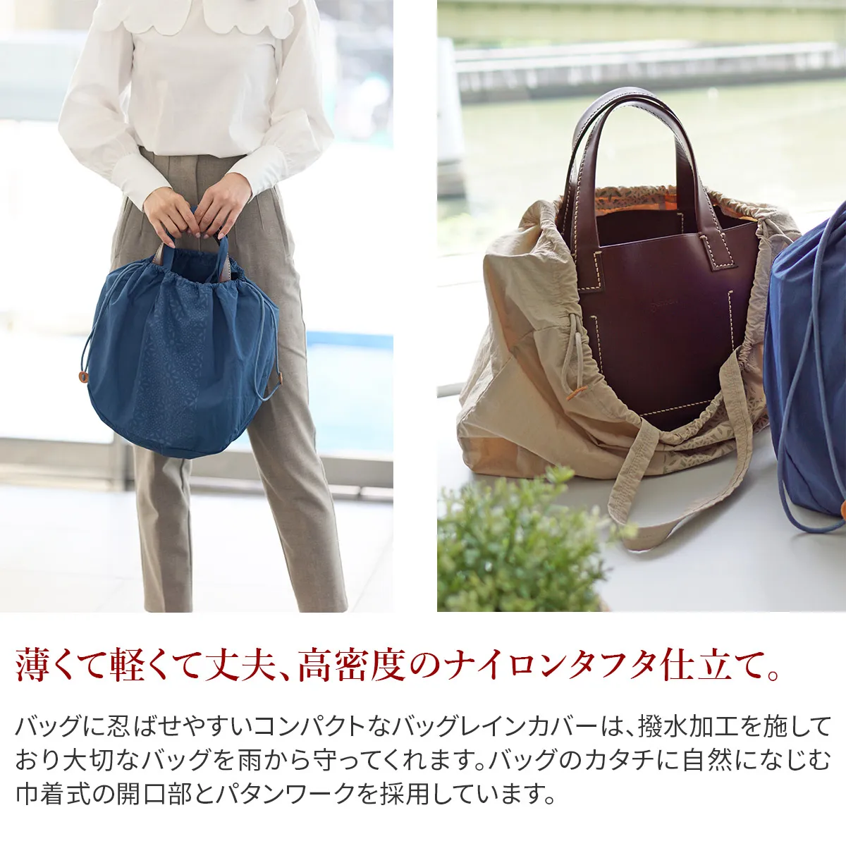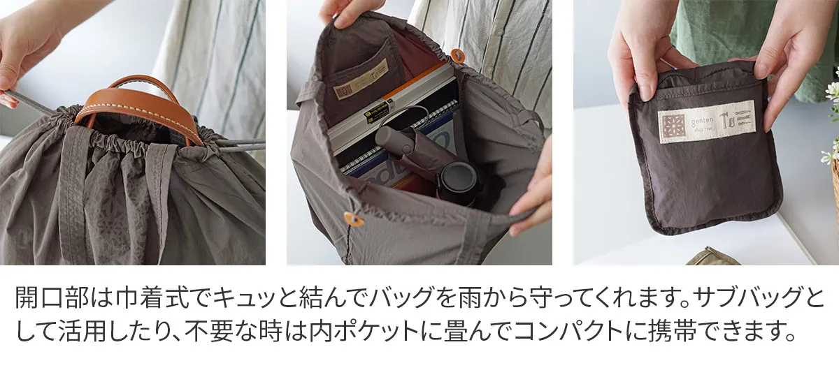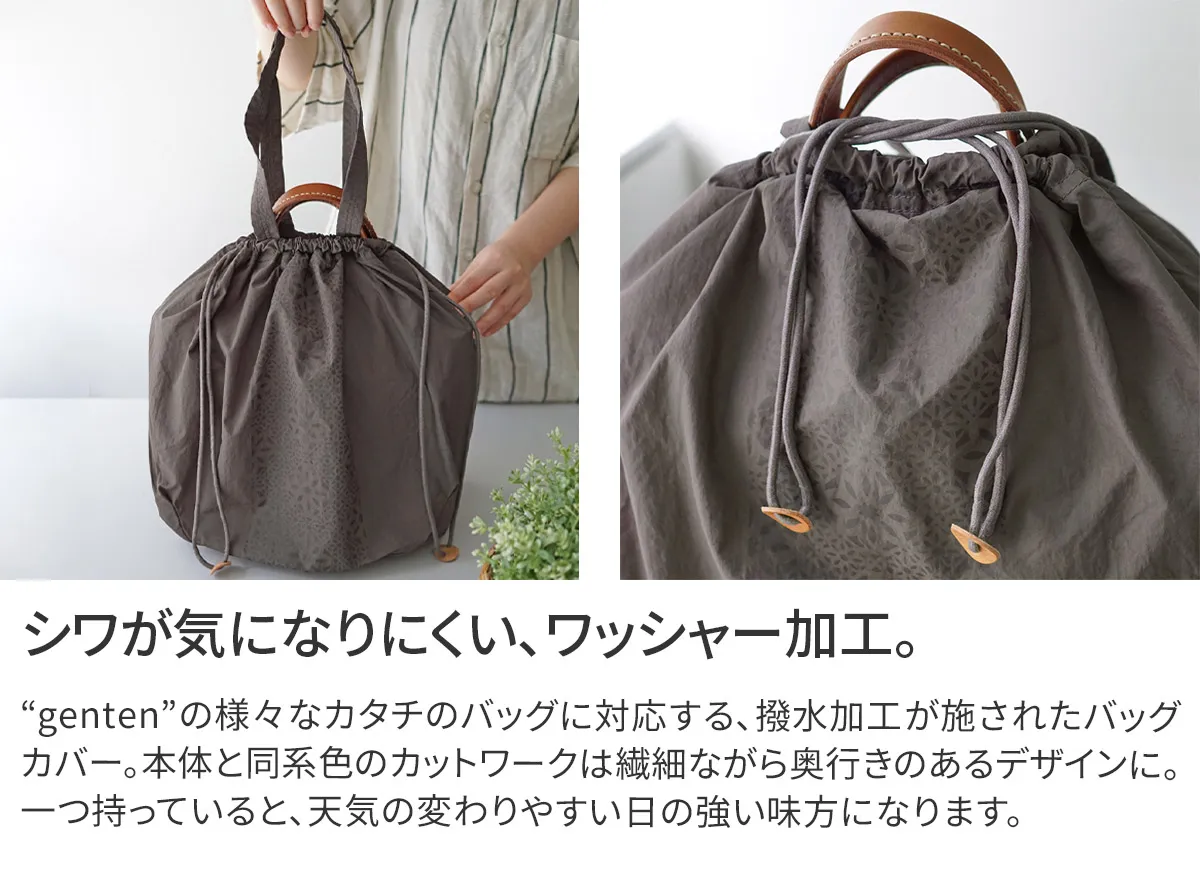 年々増加する雨量と、突如として訪れるゲリラ豪雨に備えて、1つは持っておきたいバッグのためのレインカバー。しとしとと降る雨を意味する「Pioviggine」ピオヴィッジネ(伊語)より「Pio」と名付けました。 雨から大切なバッグたちを守る 「Pio(ピオ)」は、100%リサイクルナイロンを使用。 ゲンテンのバッグは、丸いフォルムからスクエアシルエットまで多様、サイズも大小様々。どんな型にも対応できるように、ダーツをとって底面を丸くし、バッグを入れて巾着を絞ると自然にバッグに沿う設計。 非常に軽量で、畳むと手のひらに収まるコンパクトサイズなので、バッグの中のマストアイテムとして毎日携帯していただきたいシリーズとなっております。 【素材】 ・GRS(グローバルリサイクルスタンダード)認証、100%リサイクルナイロンのワッシャ加工生地を使用。 ・高密度のナイロンタフタで、薄くて軽く、丈夫。 ・生地には撥水加工を施しており、しっかり水をはじきます。 ・容積をLサイズ40リットル、Sサイズ21.5リットルとして、容積×1キロの重さを入れ、水平な棒に24時間吊るすテストはクリア。 ・生地段階でワッシャー加工を施しているため、折りたたんでもシワが気になりにくい。 消費者が正しくリサイクルされた製品を選択するために、上記を第三者認証し、保証しています。資源不足や環境汚染が問題視される中、今ある資源を大切に使い、廃棄物を減らすための大切な取り組みです。 商品には、別途GRS認証タグをお付けして納品いたします。