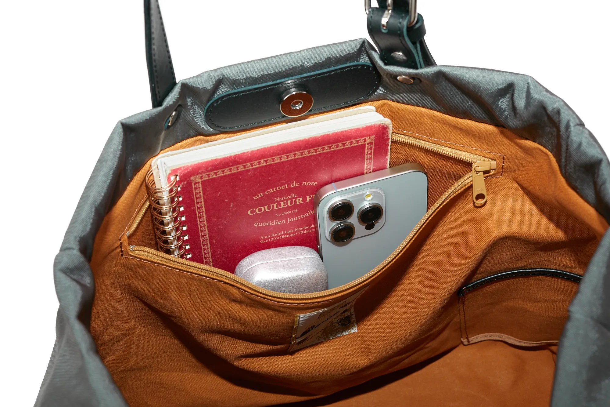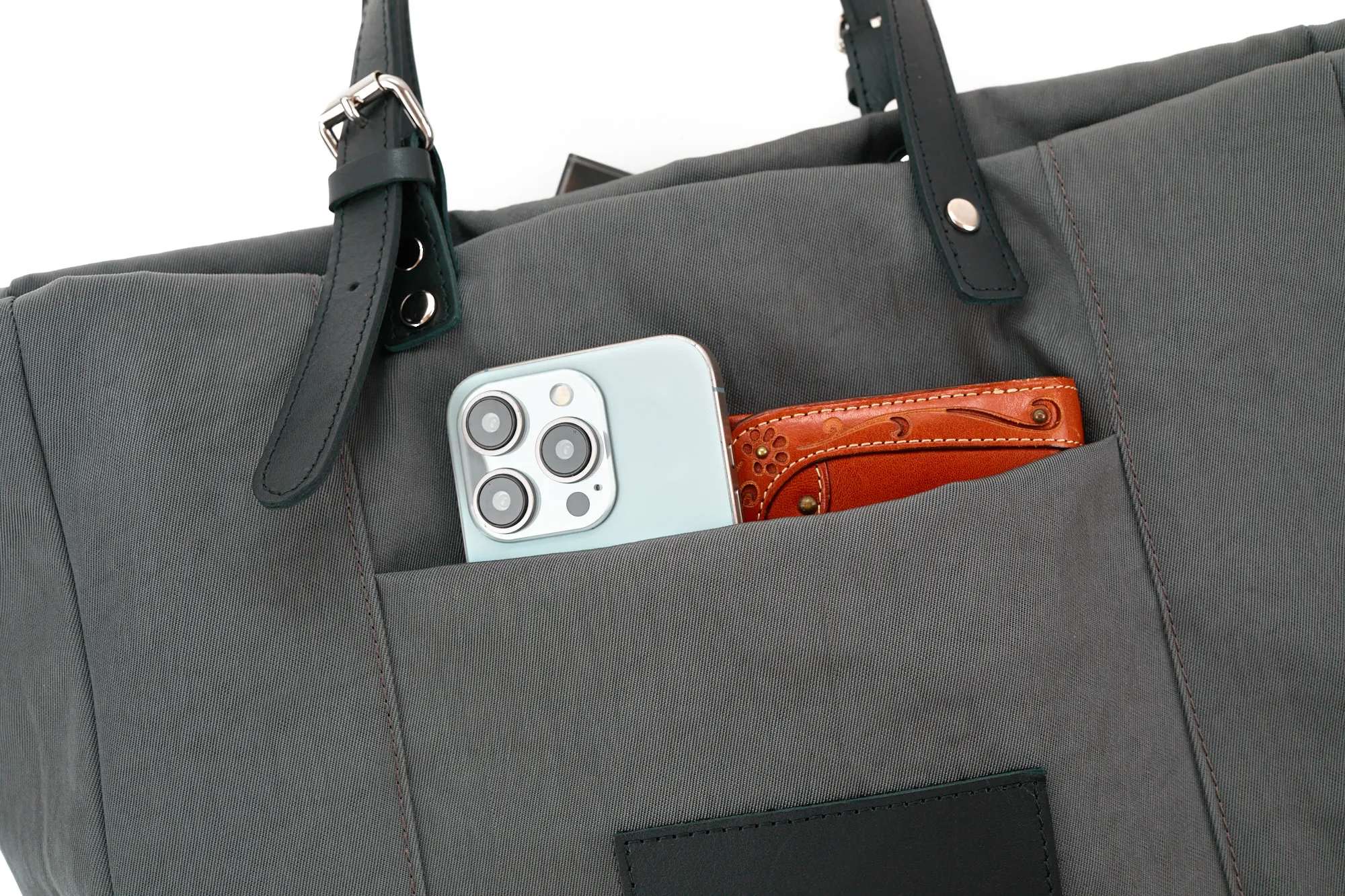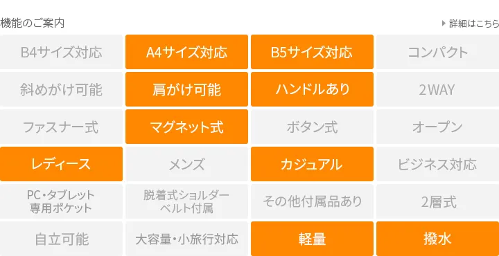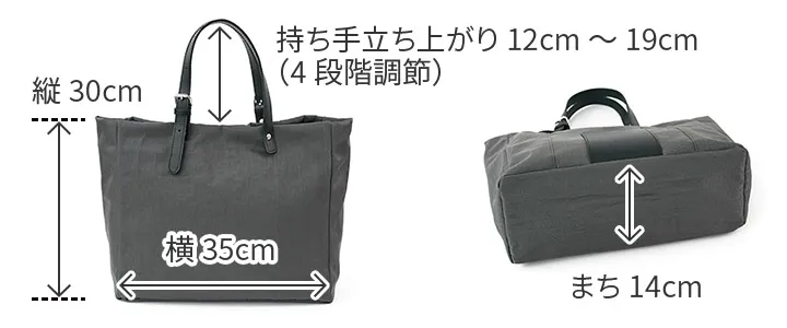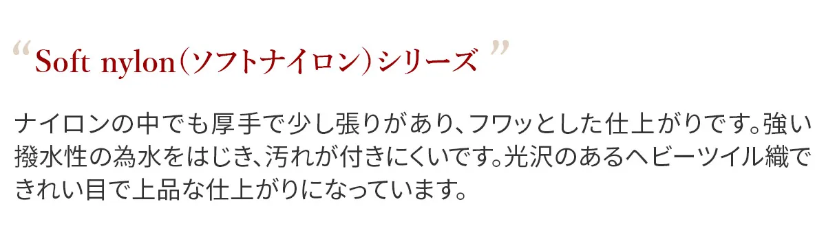 ナイロンの中でも厚手で少し張りがあり、フワッとした仕上がり。強い撥水性の為、水をはじき、汚れが付きにくいです。光沢のあるヘビーツイル織で、きれい目で上品な仕上がりになっています。 シックな色合いで普段使いしやすい軽量なトートバッグです。裏地に張りのある生地を使用しているので、形が崩れにくく、上品にお持ちいただけます。ポケットやボトルホルダーも備えられており、整理しやすい構造もポイントです。持ち手の長さは4段階調節が可能で、手持ちや肩がけスタイルにアレンジしていただけます。