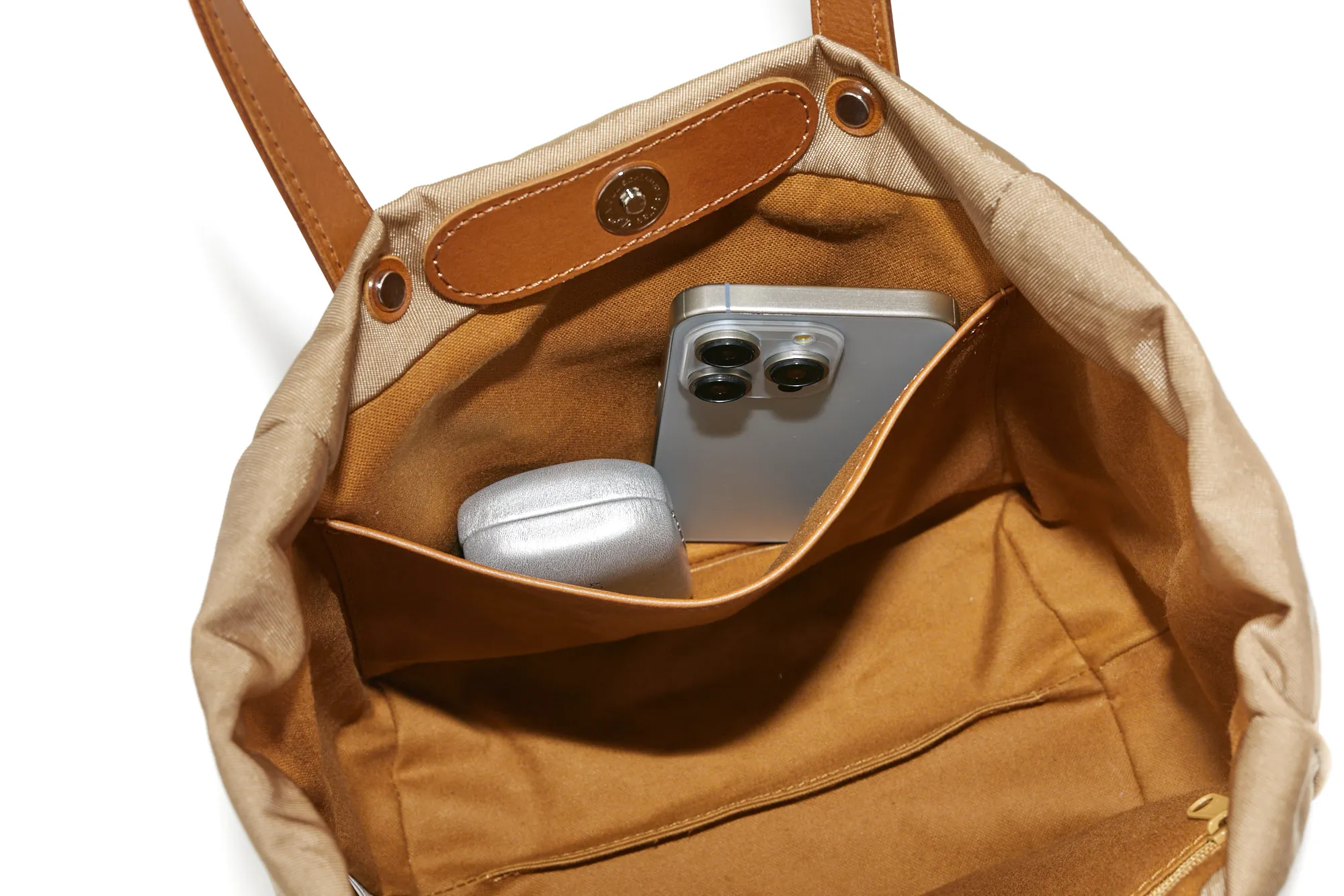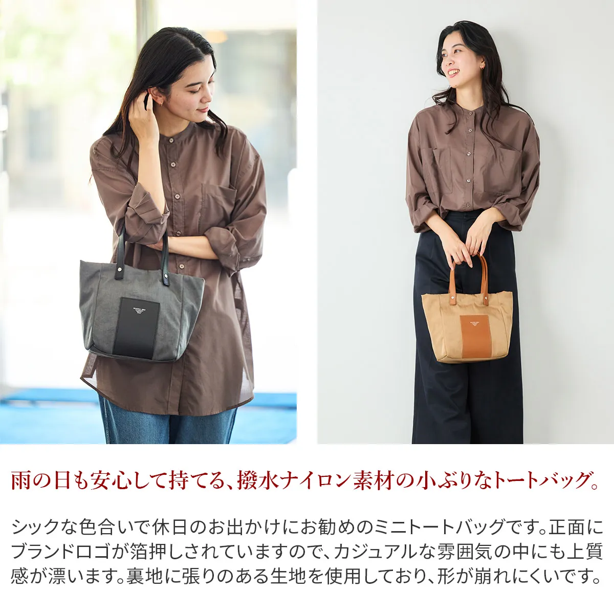 ナイロンの中でも厚手で少し張りがあり、フワッとした仕上がり。強い撥水性の為、水をはじき、汚れが付きにくいです。光沢のあるヘビーツイル織で、きれい目で上品な仕上がりになっています。 シックな色合いで休日のお出かけにお勧めのミニトートバッグです。正面にはブランドロゴが箔押しされており、カジュアルな雰囲気の中にも上質感が漂います。裏地に張りのある生地を使用しているので、形が崩れにくく、上品にお持ちいただけます。ポケットやボトルホルダーも備えられており、整理しやすい構造もポイントです。