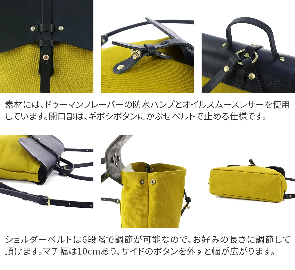 日常の女性たちを上質なカジュアルで、ちょっぴりエレガントにかっこよくしてくれるバッグ。肩掛けスタイルも可能なデザインで、活躍の幅が広がります。防水ハンプ素材で、雨に強いのがポイントです。 本体生地はシーガルシップのメイン素材である、「ドゥーマンフレーバー」の防水帆布です。厚い生地の中にたっぷりと蝋が入っているので、汚れも付きにくく、水に濡れると糸が膨張するため水の侵入を防ぎます。 付属のレザーは栃木レザーで、特別に厚みがある少し柔らかいオイルスムースレザーを使用しています。