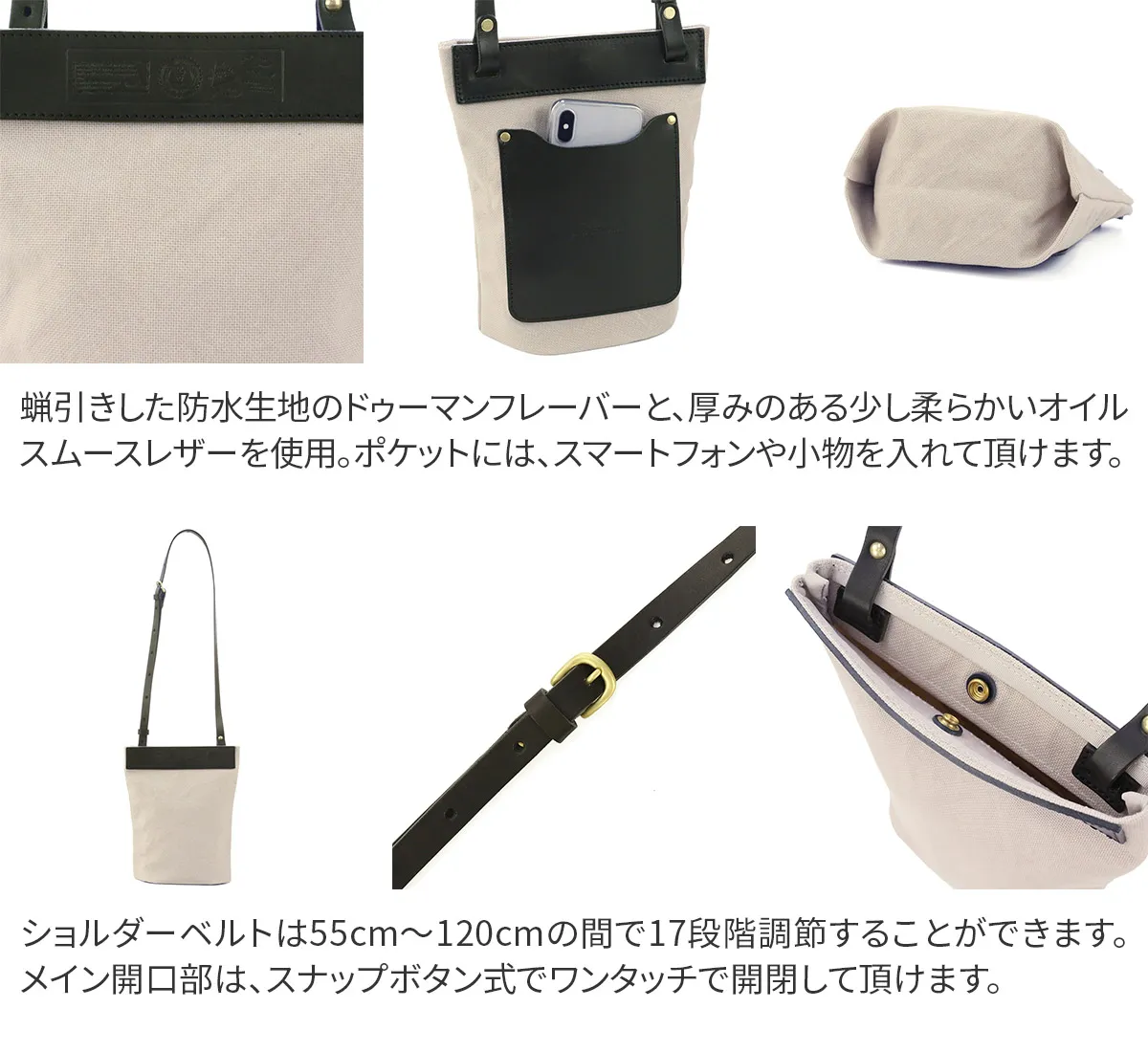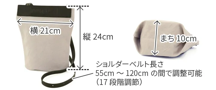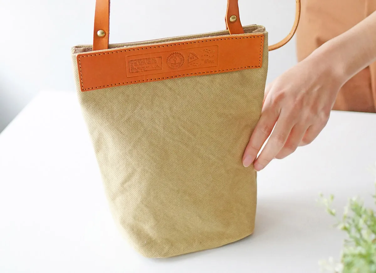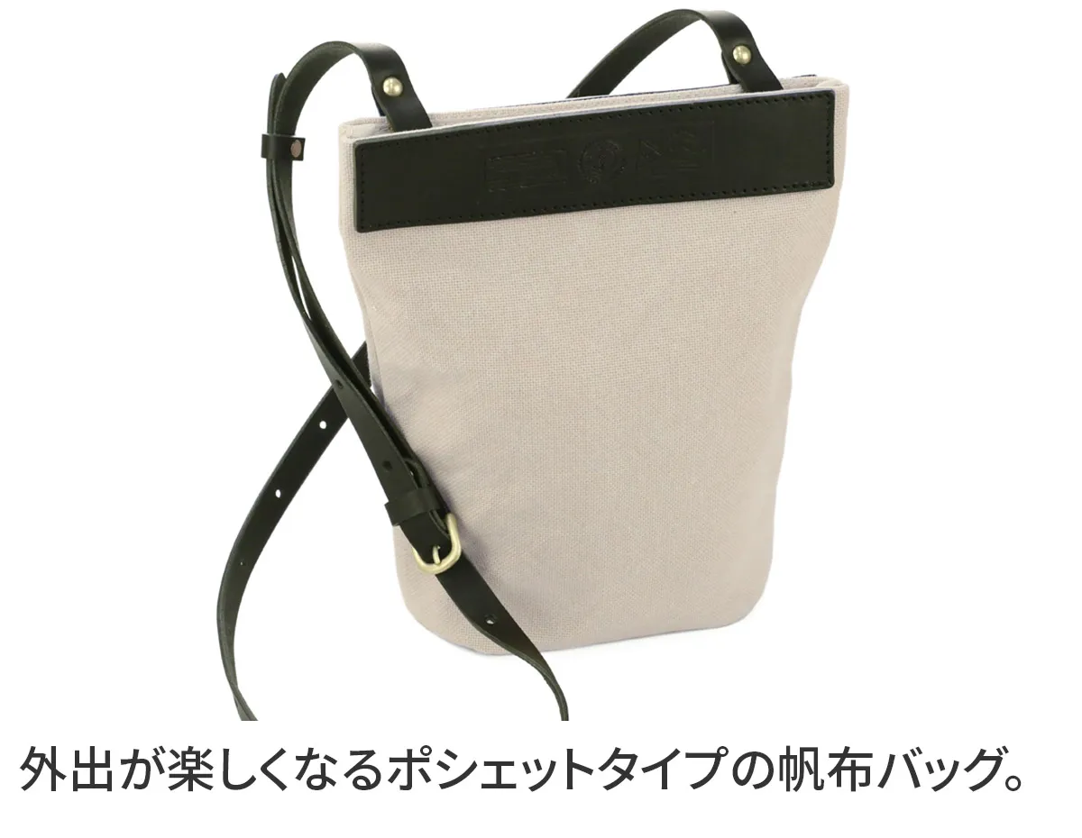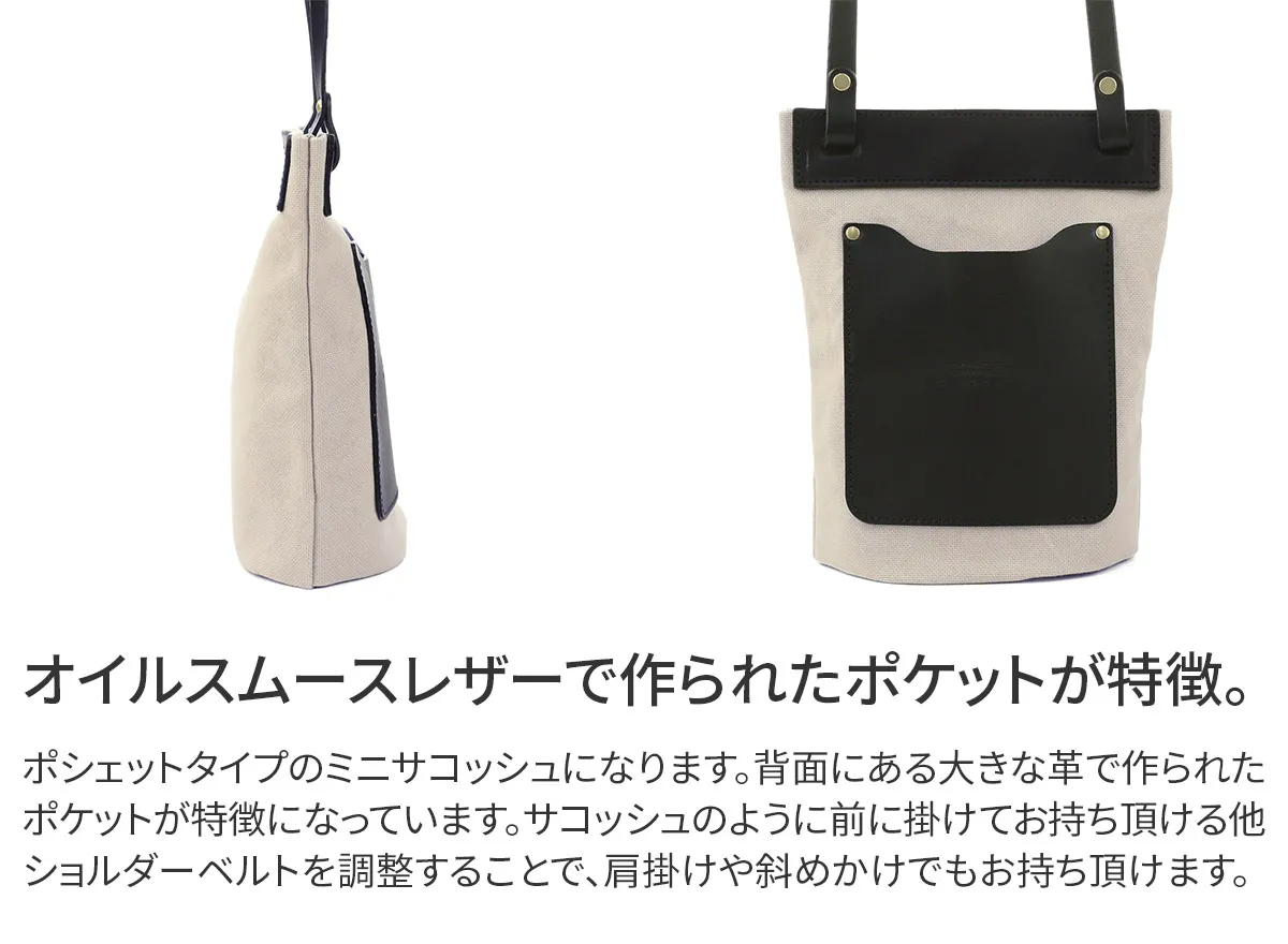 お出かけが楽しくなるポシェットタイプのミニサコッシュになります。まちを織り込むとかさばらないので、バッグに忍ばせて外出先でもお使い頂けます。裏側には大きな革で作られたポケットがあり、小物の収納に便利です。 本体生地はシーガルシップのメイン素材である、「ドゥーマンフレーバー」の防水帆布です。厚い生地の中にたっぷりと蝋が入っているので、汚れも付きにくく、水に濡れると糸が膨張するため水の侵入を防ぎます。 付属のレザーは栃木レザーで、特別に厚みがある少し柔らかいオイルスムースレザーを使用しています。