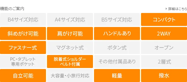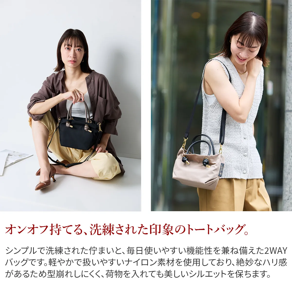 シンプルなデザインですが、ハンドルのカラーがアクセントになった逸品。 前後にあおりポケットがついているため、使用頻度の高い小物を収納でき、取り出しがしやすい仕様となっております。 コンパクトですが、見た目以上に収納できるのもポイント。弱撥水性があるので雨の日にもお持ちいただけるトートバッグです。