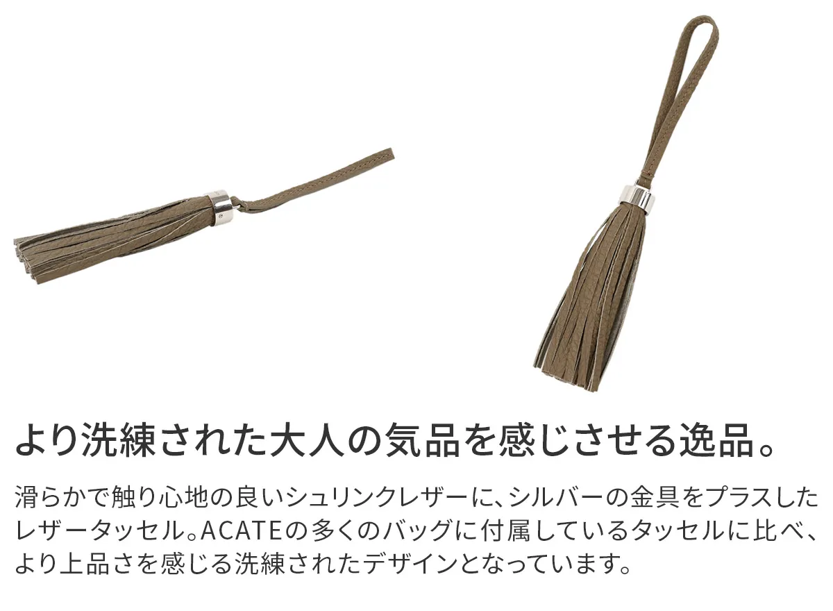 レザーには、上質でソフトな手触りが特徴のイタリア製シュリンクレザー(カーフレザー)を使用しています。 ACATEで採用しているシュリンクレザーは、耐久性、優雅さ、柔らかさを備えており、表面全体に均一で規則的なシボが入っている点が最大の特徴。 使い込むほどに美しい色艶を醸し出す、経年変化が楽しめるレザーです。 ACATEの生産は、MADE IN ITALYの高品質生産を追求し、細部へのこだわりと職人技で知られる工場"Dania”で行われています。 Daniaの強みは、職人技とテクノロジーへの両面投資にあり、伝統的な手縫いの価値を守りながらも、現代的なアプローチを提供しているという点。 Daniaの職人は様々な経験、年齢、背景を持っており、それぞれが専門領域で独自の特色を発揮しています。 40年以上にわたるハンドメイド技術の経験は、専門家の独自のこだわりであり、彼らは絶えず自己を更新し、イタリアとフランスのハイブランドの卓越した品質を維持し続けてきました。 そしてデジタル化による仕上げは、イタリアの最も才能ある若手職人によって担当されています。 Daniaは、コラムマシン、デジタルカッティング、ロングアームマシン、360度アームマシンなどが備わっており、常に最新の技術を提供。 長年にわたり培われた職人技と最新技術の融合が、高品質なプロダクトの提供を可能にしているのです。 滑らかで上質なシュリンクレザーを贅沢に使用した、シルバー金具がアクセントのレザータッセル。 お持ちのバッグに付けてあげることで、バッグを格上げしてくれる逸品です。