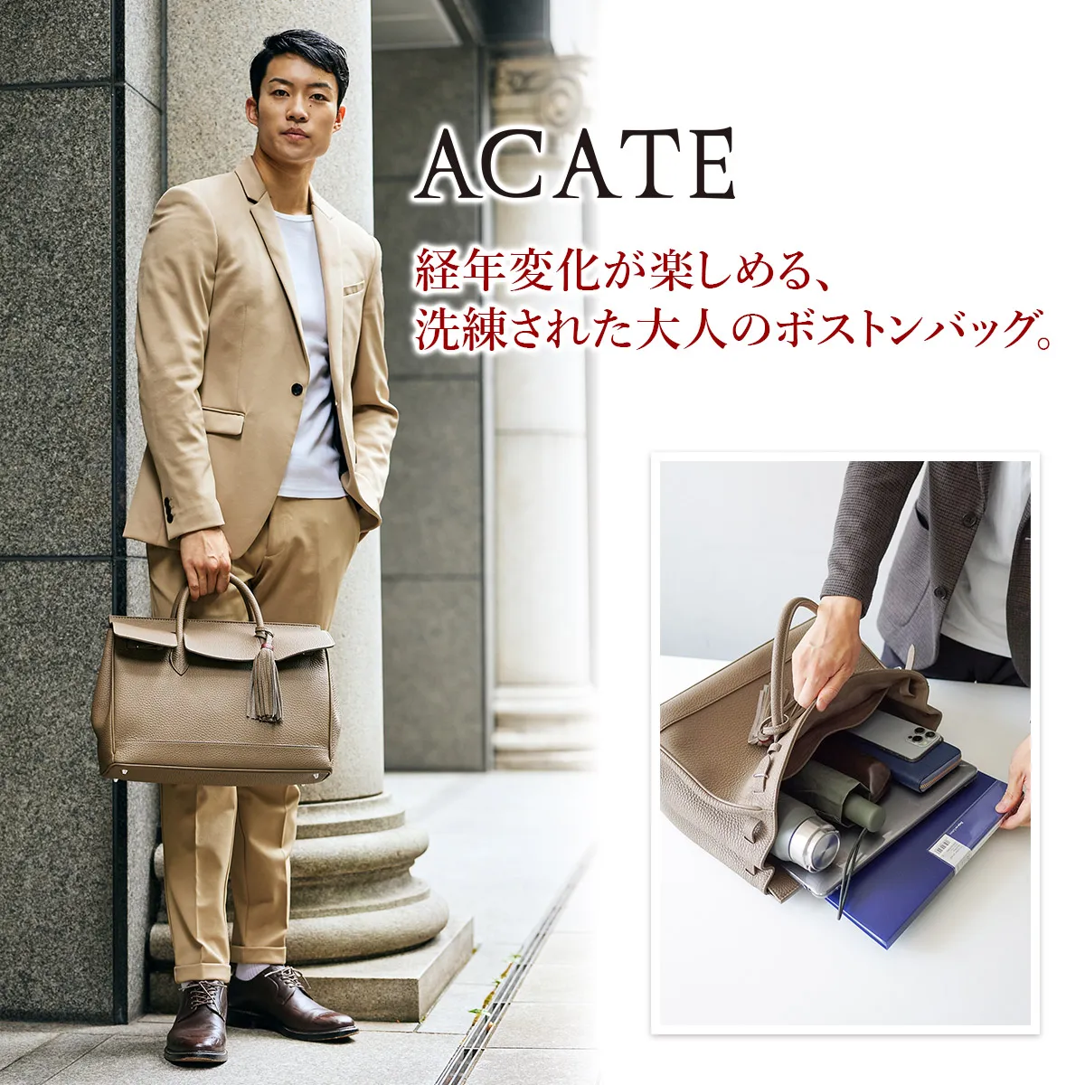 レザーには、上質でソフトな手触りが特徴のイタリア製シュリンクレザー(カーフレザー)を使用しています。 ACATEで採用しているシュリンクレザーは、耐久性、優雅さ、柔らかさを備えており、表面全体に均一で規則的なシボが入っている点が最大の特徴。 使い込むほどに美しい色艶を醸し出す、経年変化が楽しめるレザーです。 ACATEの生産は、MADE IN ITALYの高品質生産を追求し、細部へのこだわりと職人技で知られる工場"Dania”で行われています。 Daniaの強みは、職人技とテクノロジーへの両面投資にあり、伝統的な手縫いの価値を守りながらも、現代的なアプローチを提供しているという点。 Daniaの職人は様々な経験、年齢、背景を持っており、それぞれが専門領域で独自の特色を発揮しています。 40年以上にわたるハンドメイド技術の経験は、専門家の独自のこだわりであり、彼らは絶えず自己を更新し、イタリアとフランスのハイブランドの卓越した品質を維持し続けてきました。 そしてデジタル化による仕上げは、イタリアの最も才能ある若手職人によって担当されています。 Daniaは、コラムマシン、デジタルカッティング、ロングアームマシン、360度アームマシンなどが備わっており、常に最新の技術を提供。 長年にわたり培われた職人技と最新技術の融合が、高品質なプロダクトの提供を可能にしているのです。 滑らかな質感の上質なレザーを使用したボストンバッグ。使用する度に艶が増し、高級感も増していきます。 A4サイズの書類が収納できるサイズ感で、ビジネスシーンでも活躍するアイテムです。 シンプルな外観ながらも上品な印象が感じられる逸品です。