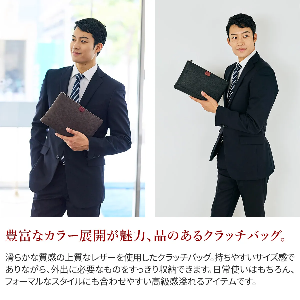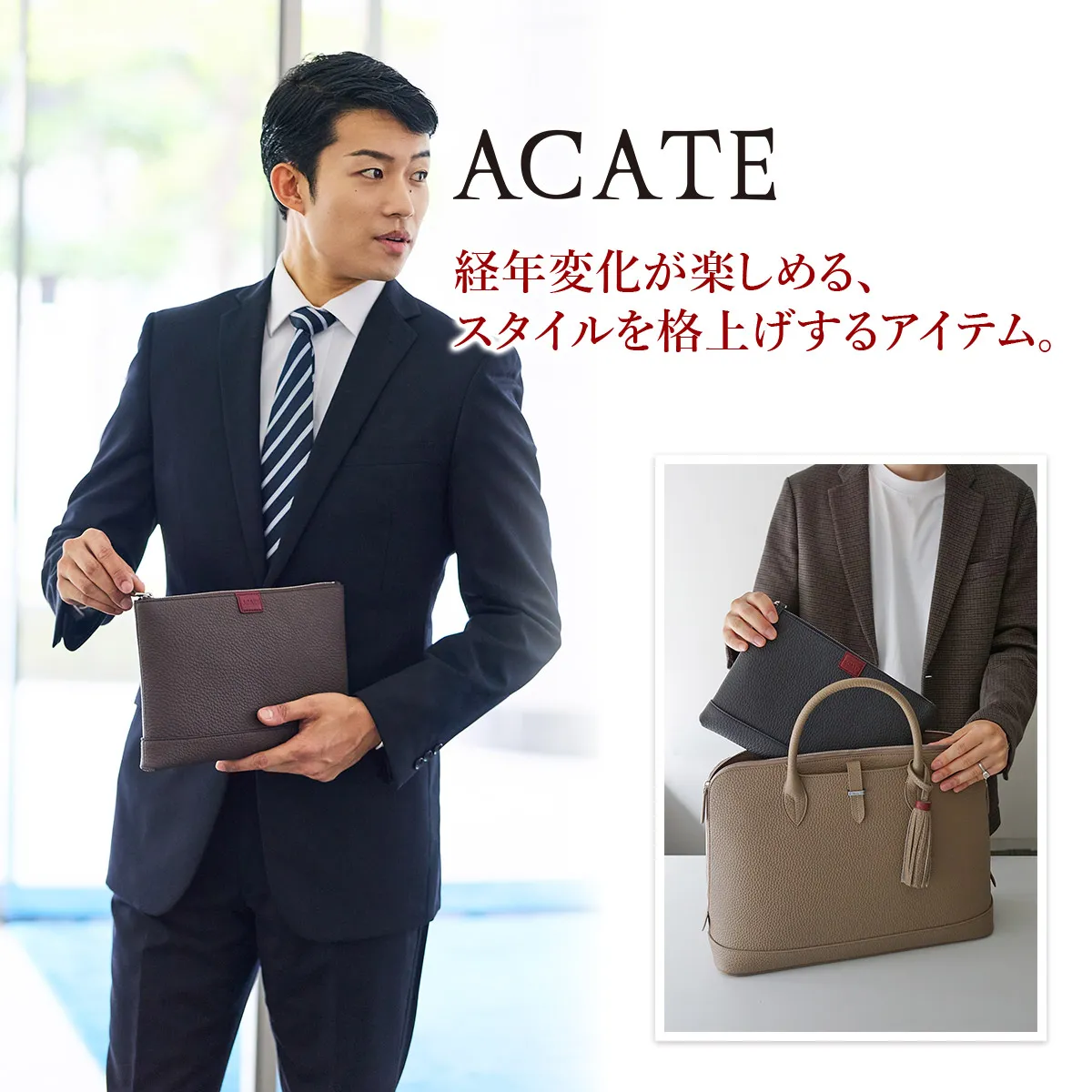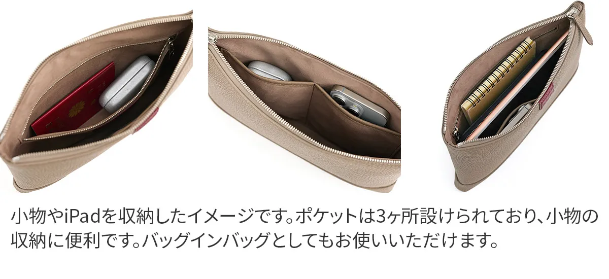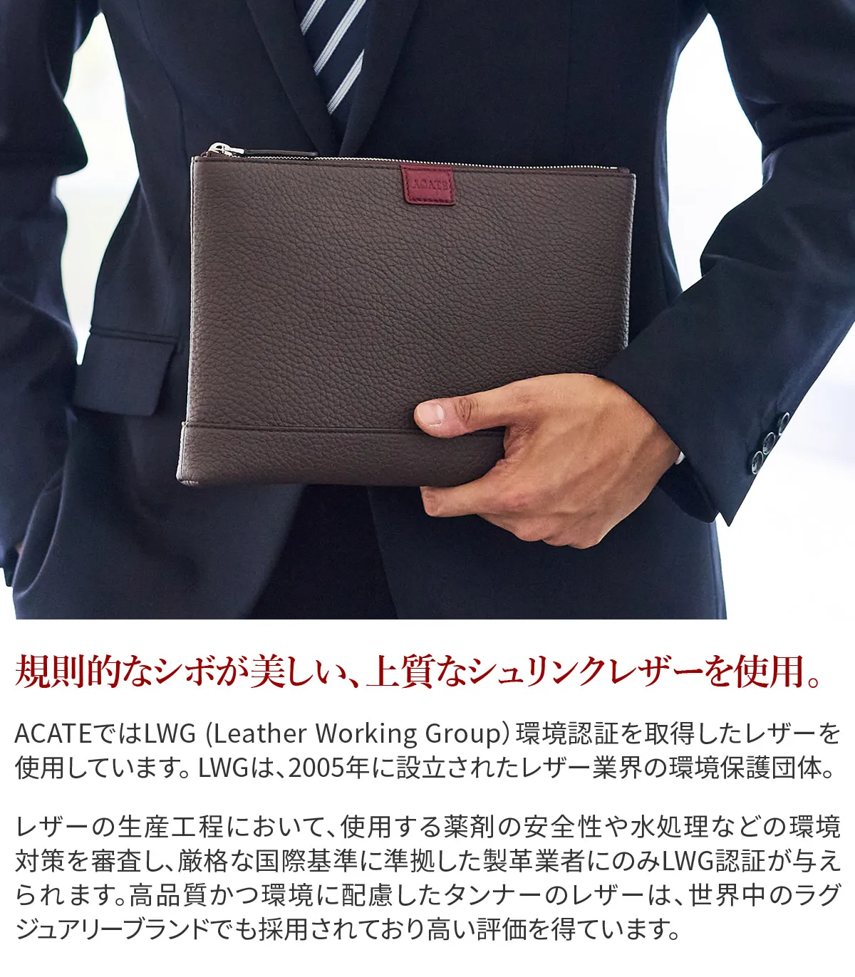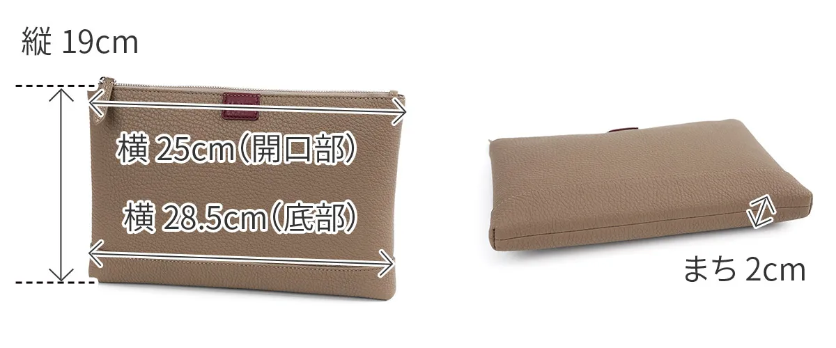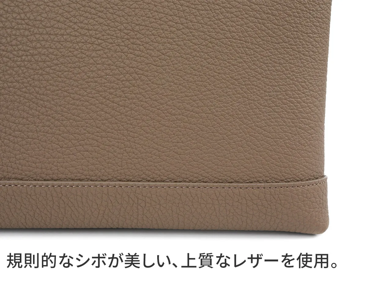 レザーには、上質でソフトな手触りが特徴のイタリア製シュリンクレザー(カーフレザー)を使用しています。 ACATEで採用しているシュリンクレザーは、耐久性、優雅さ、柔らかさを備えており、表面全体に均一で規則的なシボが入っている点が最大の特徴。 使い込むほどに美しい色艶を醸し出す、経年変化が楽しめるレザーです。 ACATEの生産は、MADE IN ITALYの高品質生産を追求し、細部へのこだわりと職人技で知られる工場"Dania”で行われています。 Daniaの強みは、職人技とテクノロジーへの両面投資にあり、伝統的な手縫いの価値を守りながらも、現代的なアプローチを提供しているという点。 Daniaの職人は様々な経験、年齢、背景を持っており、それぞれが専門領域で独自の特色を発揮しています。 40年以上にわたるハンドメイド技術の経験は、専門家の独自のこだわりであり、彼らは絶えず自己を更新し、イタリアとフランスのハイブランドの卓越した品質を維持し続けてきました。 そしてデジタル化による仕上げは、イタリアの最も才能ある若手職人によって担当されています。 Daniaは、コラムマシン、デジタルカッティング、ロングアームマシン、360度アームマシンなどが備わっており、常に最新の技術を提供。 長年にわたり培われた職人技と最新技術の融合が、高品質なプロダクトの提供を可能にしているのです。 滑らかな質感の上質なレザーを使用したクラッチバッグ。 持ちやすいサイズ感でありながら、外出に必要なものをすっきり収納できます。 日常使いはもちろん、フォーマルなスタイルにも合わせやすい逸品です。