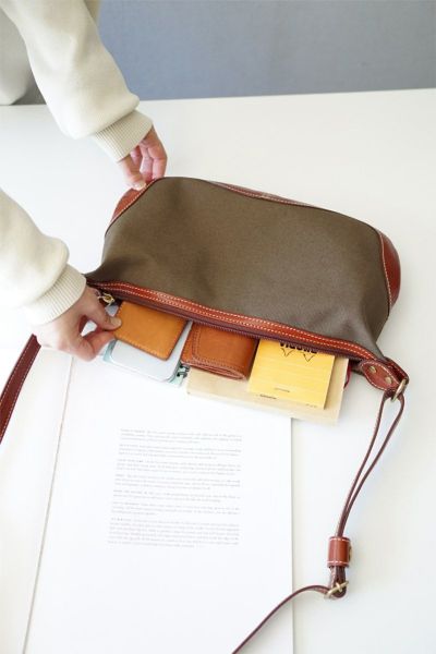 Catalana カタラーナ = カスタードの上にパリパリとしたカラメルがトッピングされた冷たいアイスデザート 「グロスコット」という連続染色による反染めの発色の良い高密度の9号帆布。 経年変化の楽しめるソフトなイタリアンレザーとのコンビネーション。 革の風合いも味わえ軽量で身体にも優しくなじみます。 軽量で気兼ねなくご使用いただける、ショルダーバッグ。 帆布とレザーの組み合わせが、カジュアルな中に上品な印象をプラスします。 コンパクトに収納し持ち運べ、コーデでの邪魔をしないシックな色合いで利便性抜群。デイリー使いにもぴったりなアイテムです。