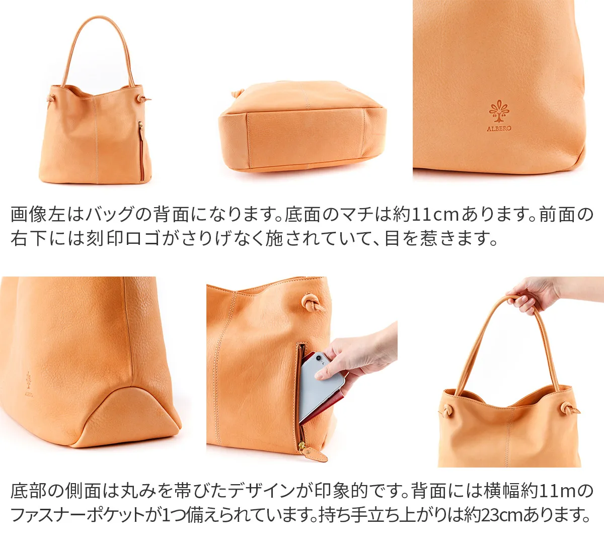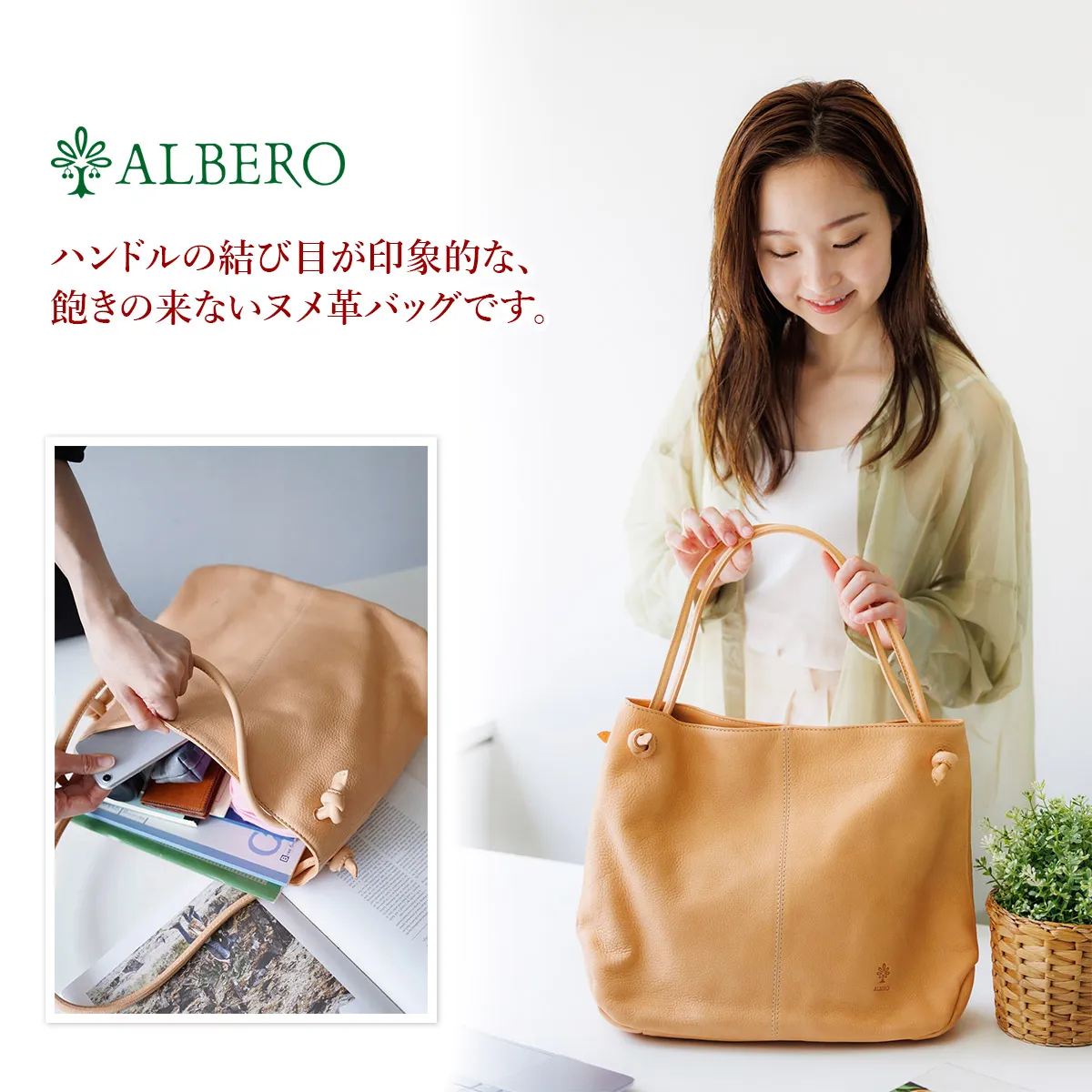 「自然を大切にしたい」はALBEROのフィロソフィー。 Naturaleは、それを象徴するシリーズ。 牛革ショルダー部を植物タンニンでなめし染色を施さず使う程に飴色に変化して光沢が増す素材。 ヌメ革の柔らかな風合いと、優れた収納力が魅力のトートバッグです。 ショルダーベルト幅は約1cmと細めに設けられており、女性らしい印象を与えます。 収納力も抜群で、A4サイズの書類が収納でき、オンオフ共に活躍します。