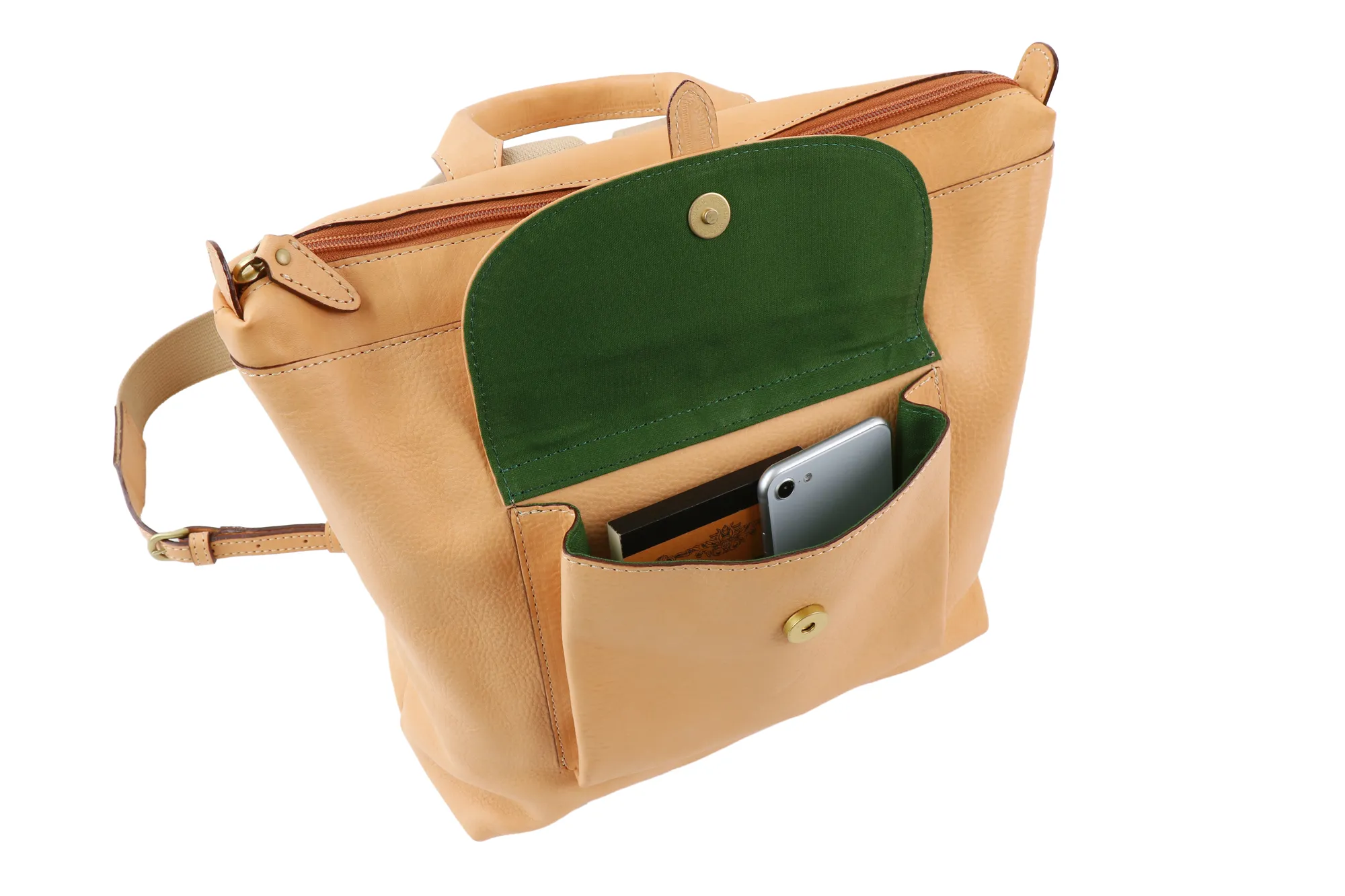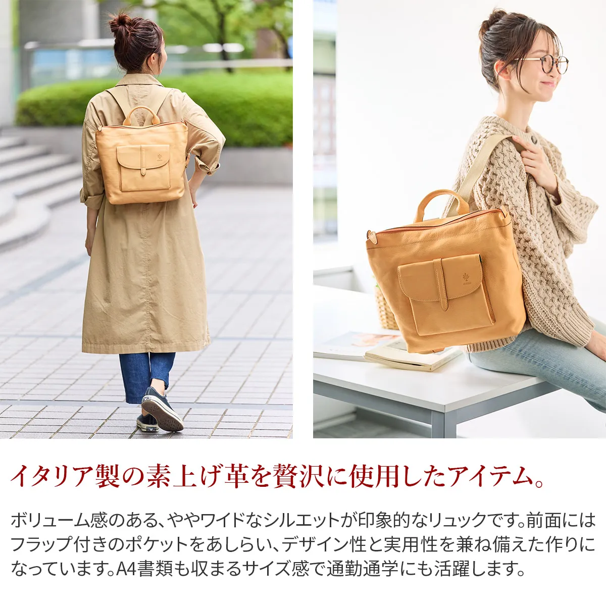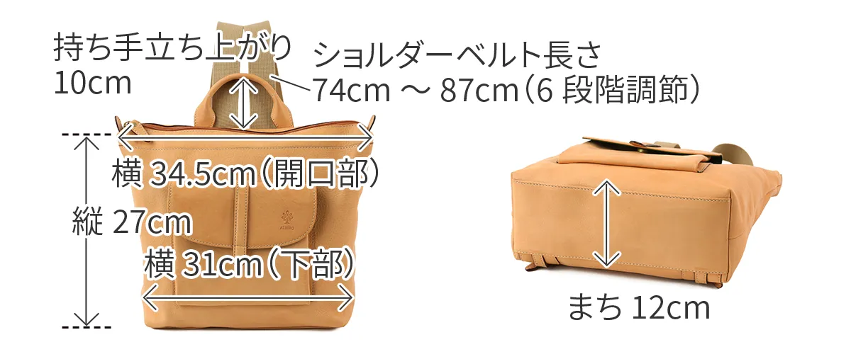 「自然を大切にしたい」はALBEROのフィロソフィー。 Naturaleは、それを象徴するシリーズ。 牛革ショルダー部を植物タンニンでなめし染色を施さず使う程に飴色に変化して光沢が増す素材。 ボリューム感のあるシルエットと前面ポケットがアイキャッチなリュックです。 A4書類がスッキリ収まり、通勤通学にも使いやすいサイズ感がうれしいポイント。 収納ポケットも充実しているので、迷子になりがちな小物の分類もしやすいデザインになっています。。 ショルダーベルトは74cm~87cmまでの6段階調節が可能で、身長や装いに合わせてアレンジしていただけます。 肩に当たる部分には幅広な綿テープを使用しており、長時間の使用でも疲れにくい工夫がされています。