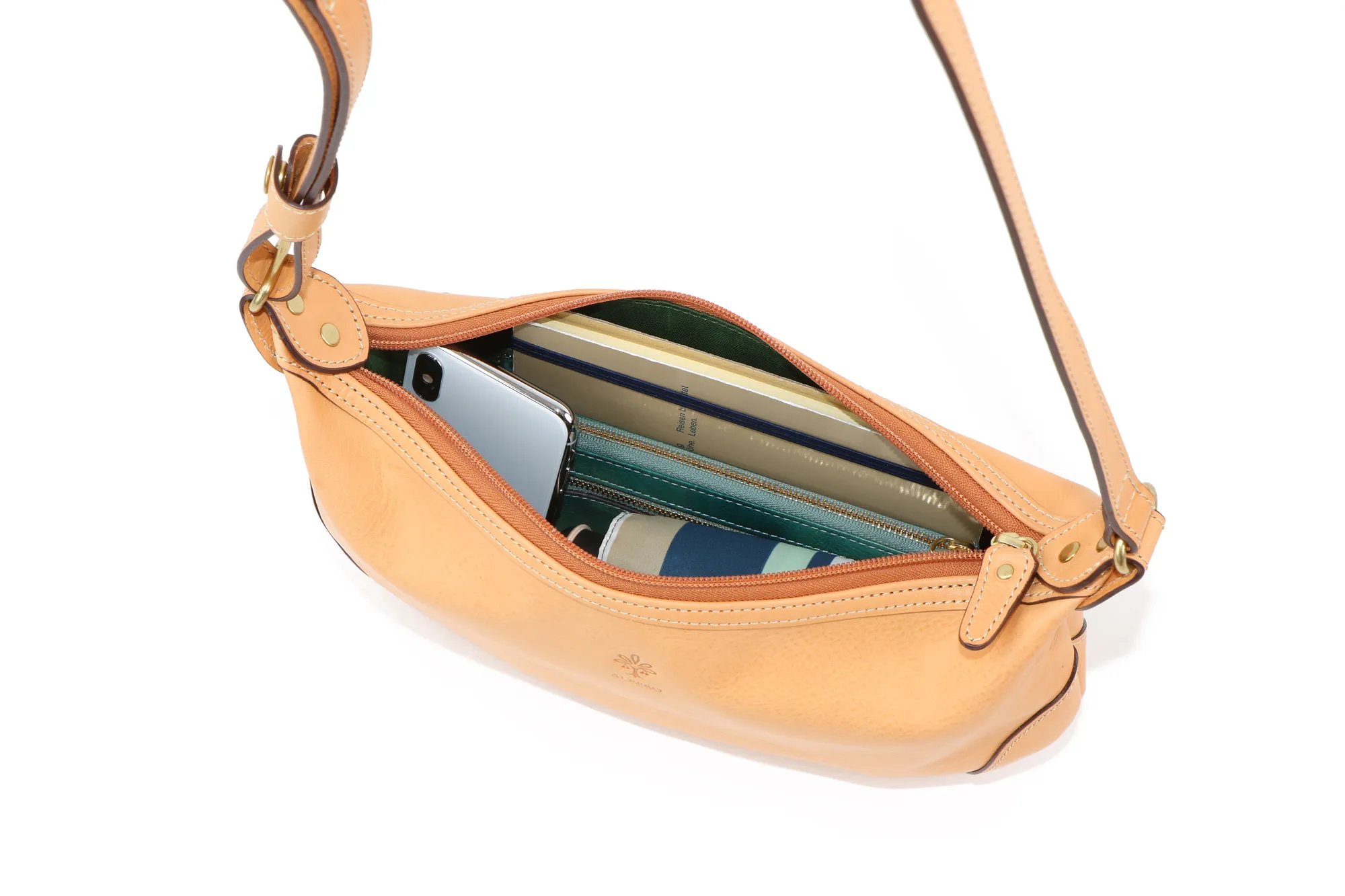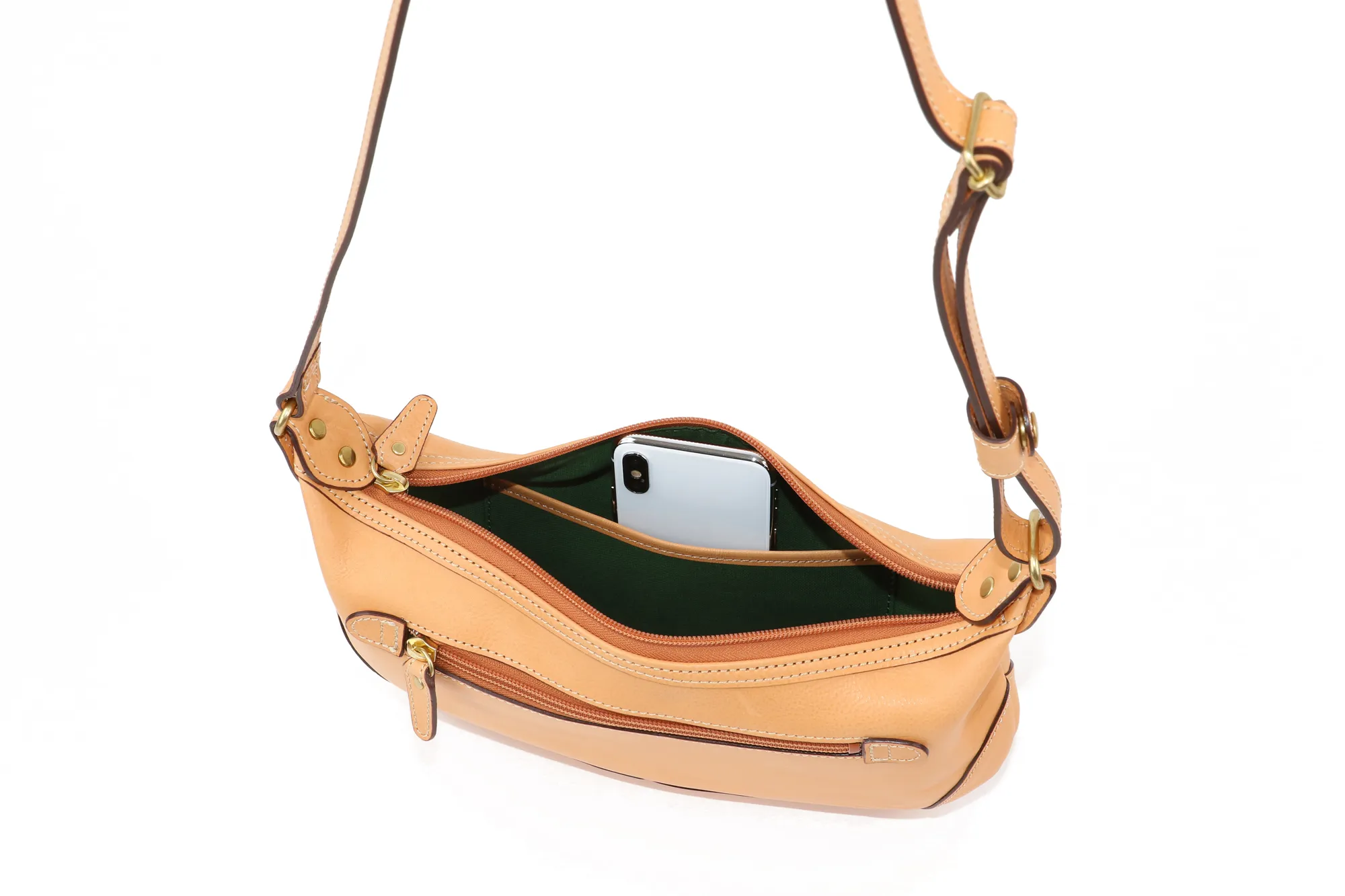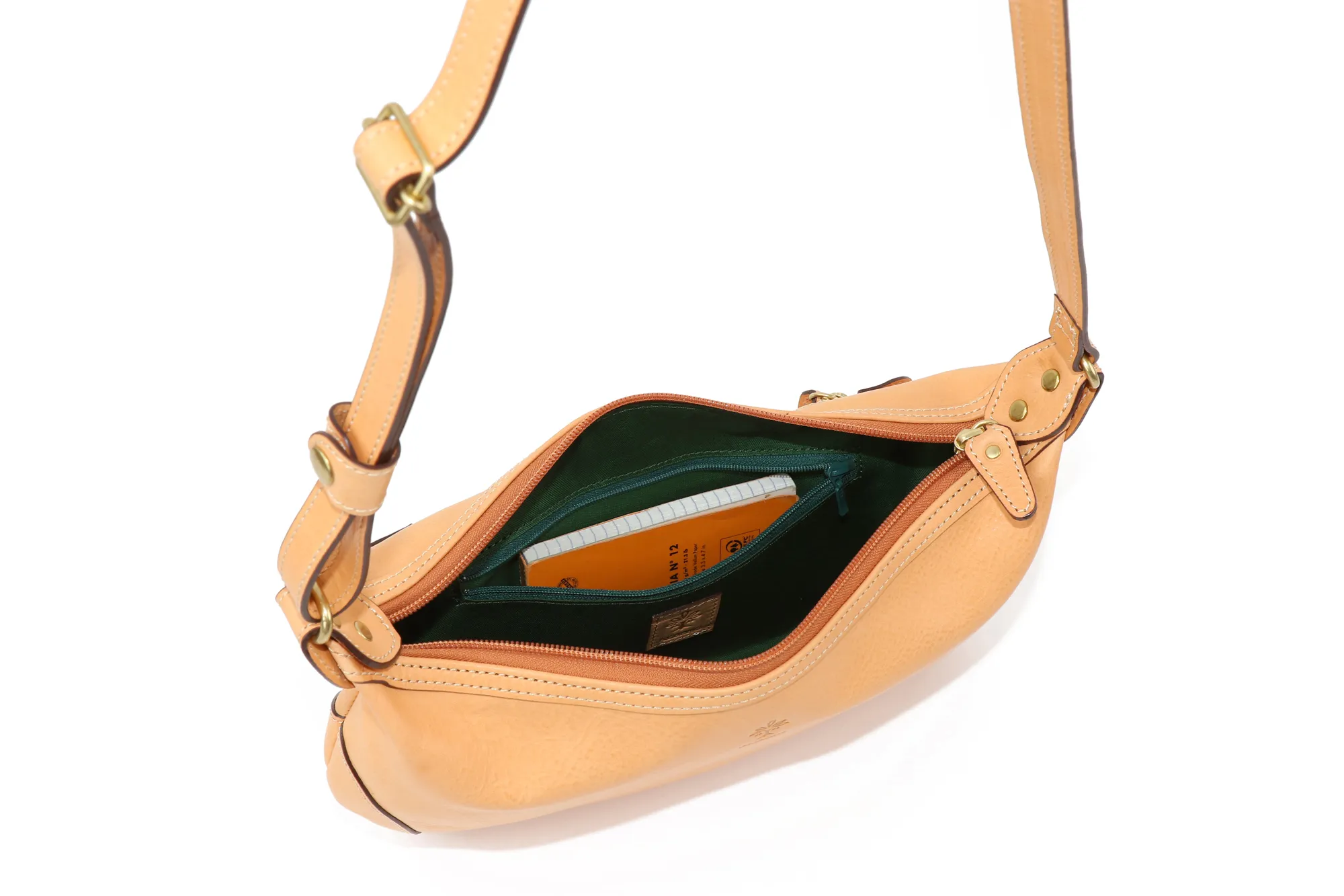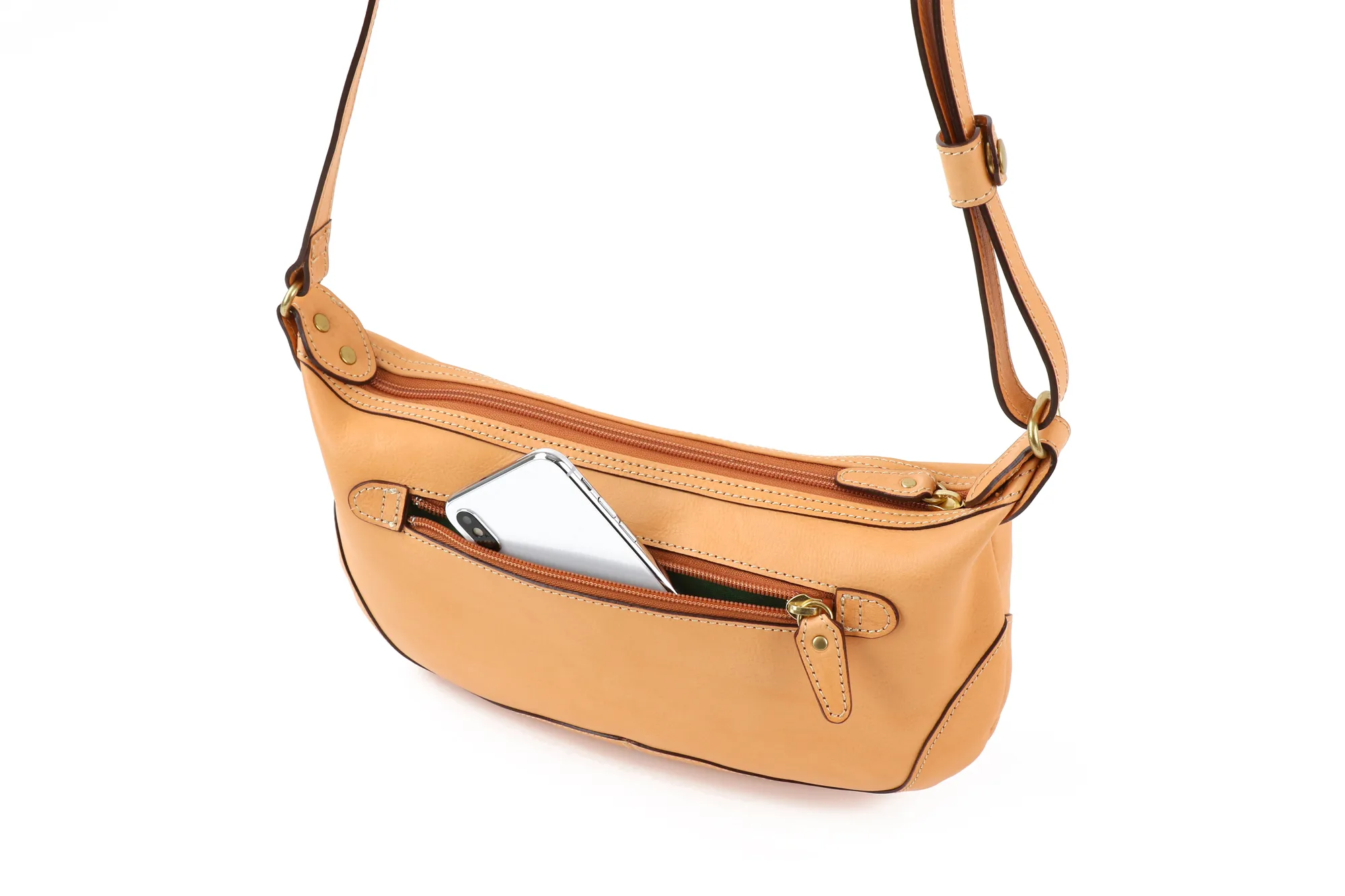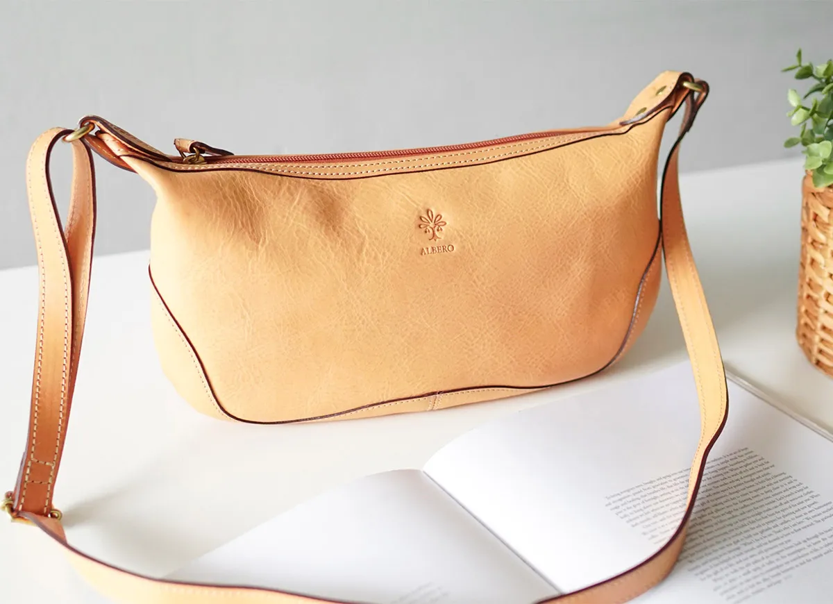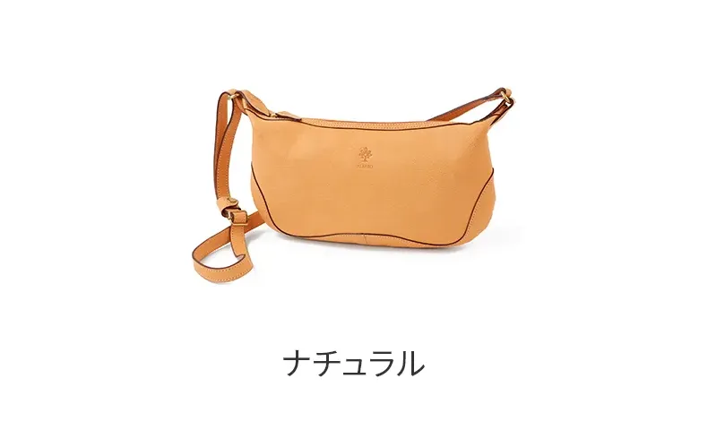 「自然を大切にしたい」はALBEROのフィロソフィー。 Naturaleは、それを象徴するシリーズ。 牛革ショルダー部を植物タンニンでなめし染色を施さず使う程に飴色に変化して光沢が増す素材。 舟形のシルエットが印象的な、ヌメ革を使用したミニショルダーバッグです。 コンパクトなサイズ感で、ワンマイルなお出かけから旅先での相棒など幅広いシーンで重宝します。 小ぶりでありながらポケットが豊富に備わっており、貴重品や携行品を分けて収納していただけます。 ショルダーベルトの長さは60cm~112cmの間で自在に調節可能で、斜めがけや肩がけにも対応しています。 使い込むほどに味わいが増す革の経年変化を長く楽しめるアイテムです。