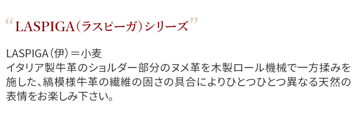 LASPIGA(伊)=小麦 イタリア製牛革のショルダー部分のヌメ革を木製ロール機械で一方揉みを施した、縞模様牛革の繊維の固さの具合によりひとつひとつ異なる天然の表情をお楽しみ下さい。 ショルダー部分のヌメ革を使用した、自然な風合いが目を惹くウォレットです。縞模様は個体差があり、唯一無二の表情を楽しめます。機能的なデザインも魅力で、BOXタイプの小銭入れは、硬貨を取り出しやすくなっています。