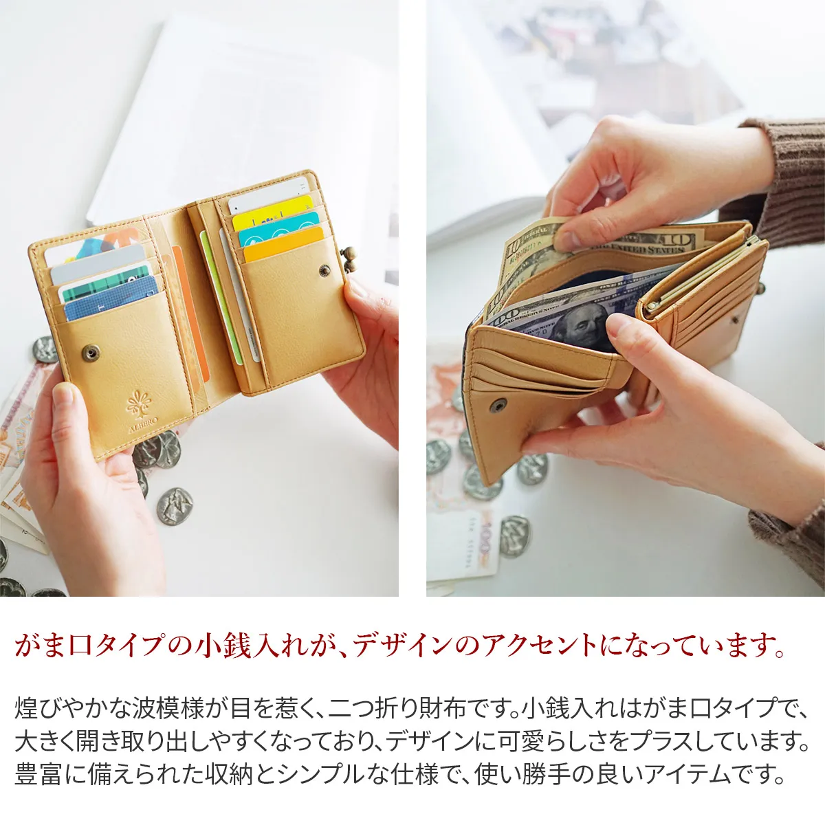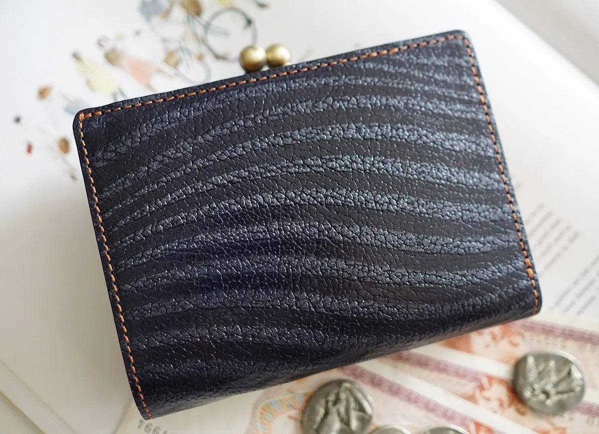 イタリア製牛革ショルダーにゼブラの型押しを施した波の様な流麗形が美しいレザー。 模様を生かしたシンプルモダン“WAVE(ウェイブ)” 煌びやかな波模様が目を惹く、二つ折り財布です。小銭入れはがま口タイプで、大きく開き取り出しやすくなっており、デザインに可愛らしさをプラスしています。豊富に備えられた収納とシンプルな仕様で、使い勝手の良いアイテムです。