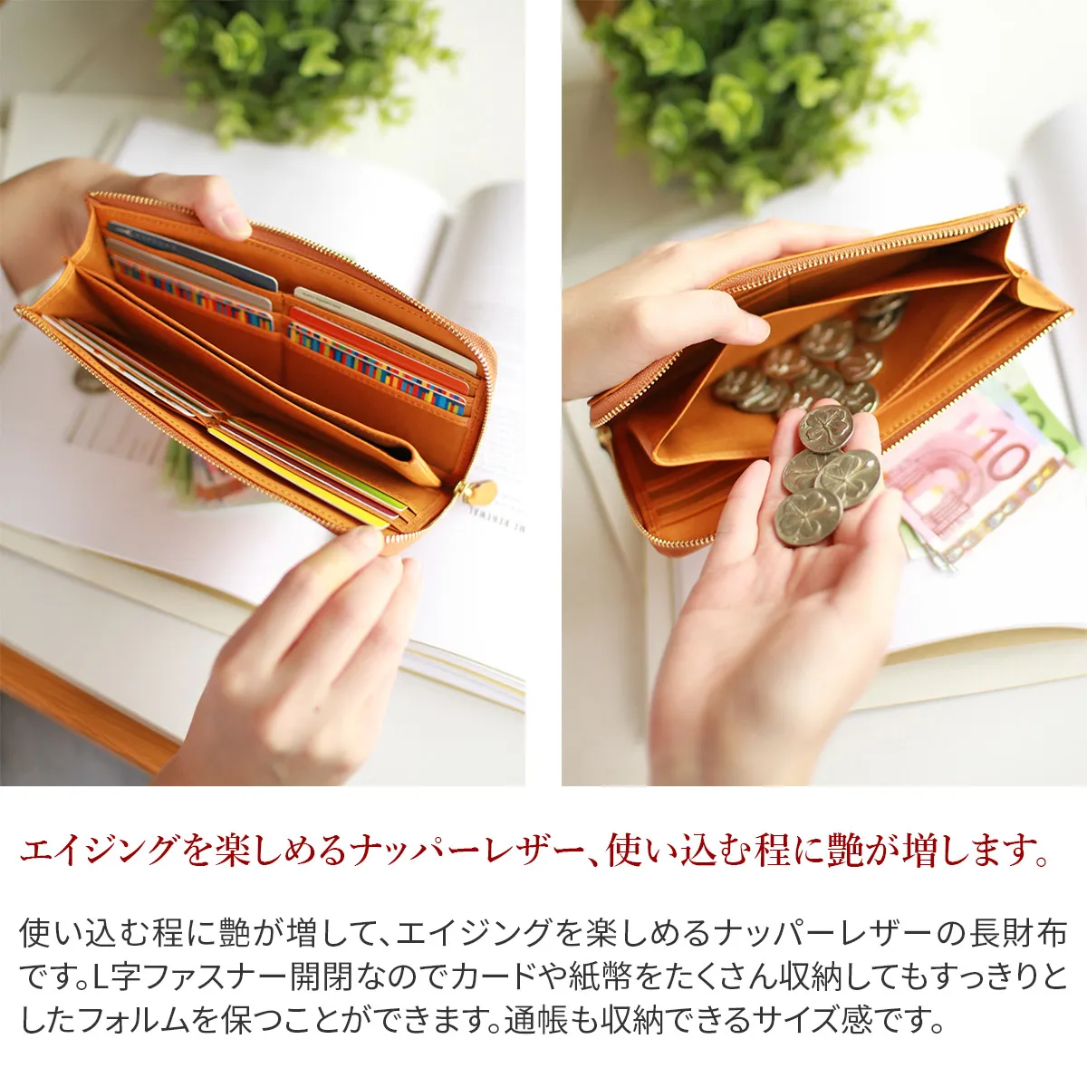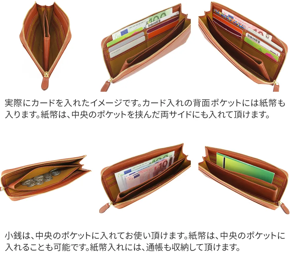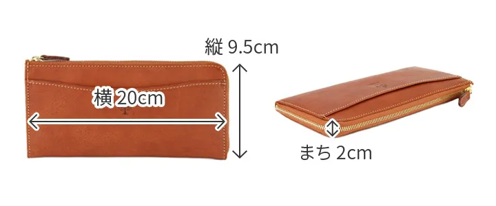 イタリア製牛ショルダー部分をタンニンでなめした後、オイルを含ませ、柔らかくしたナッパーレザーです。 使い込むほどに艶が増して、エイジングを楽しめる。 L字ファスナー開閉なのでカードや紙幣を沢山収納して頂いてもすっきりとしたフォルムを保つことができます。 通帳が収納できるサイズ感が良いですね♪