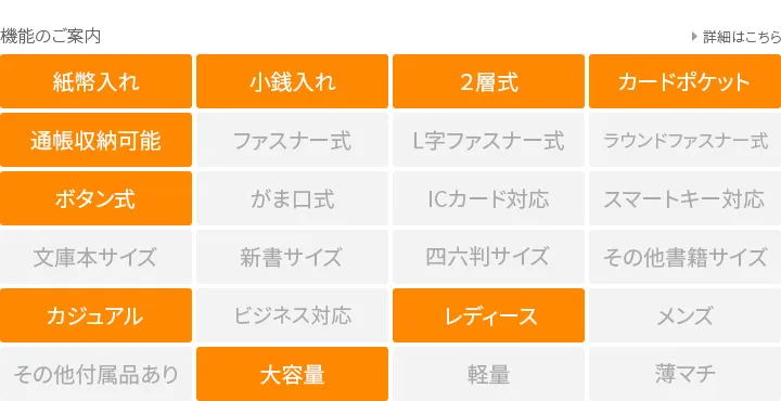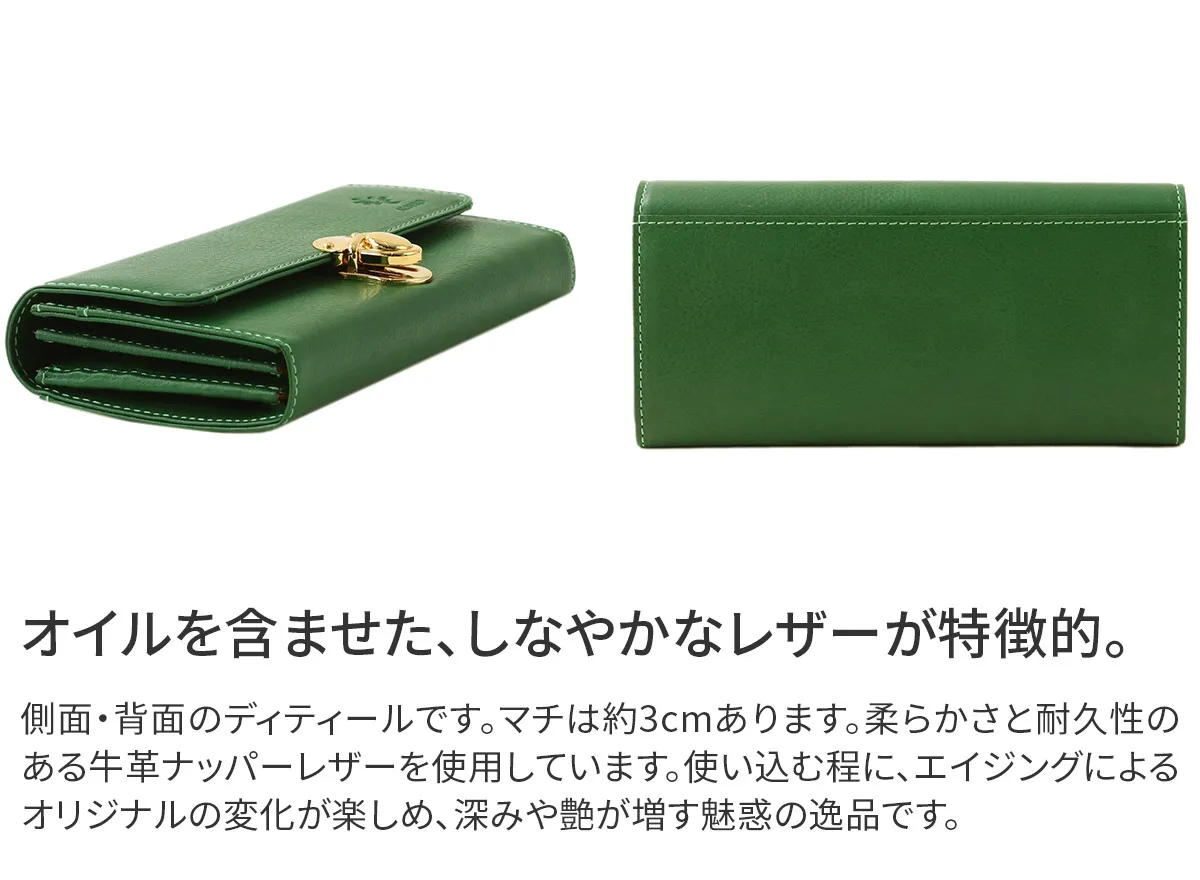 イタリア製牛ショルダー部分をタンニンでなめした後、オイルを含ませて柔らかくしたナッパーレザーです。使い込むほどに艶が増して、エイジングを楽しめる魅惑の逸品。 小銭入れは視認性が良いギャルソンタイプ。お札入れは2ヶ所、ポケットは計21ヶ所備えられており収納力に優れています。 鮮やかなカラーは、使い込むほどに艶が増しエイジングを楽しめる魅惑の逸品です。