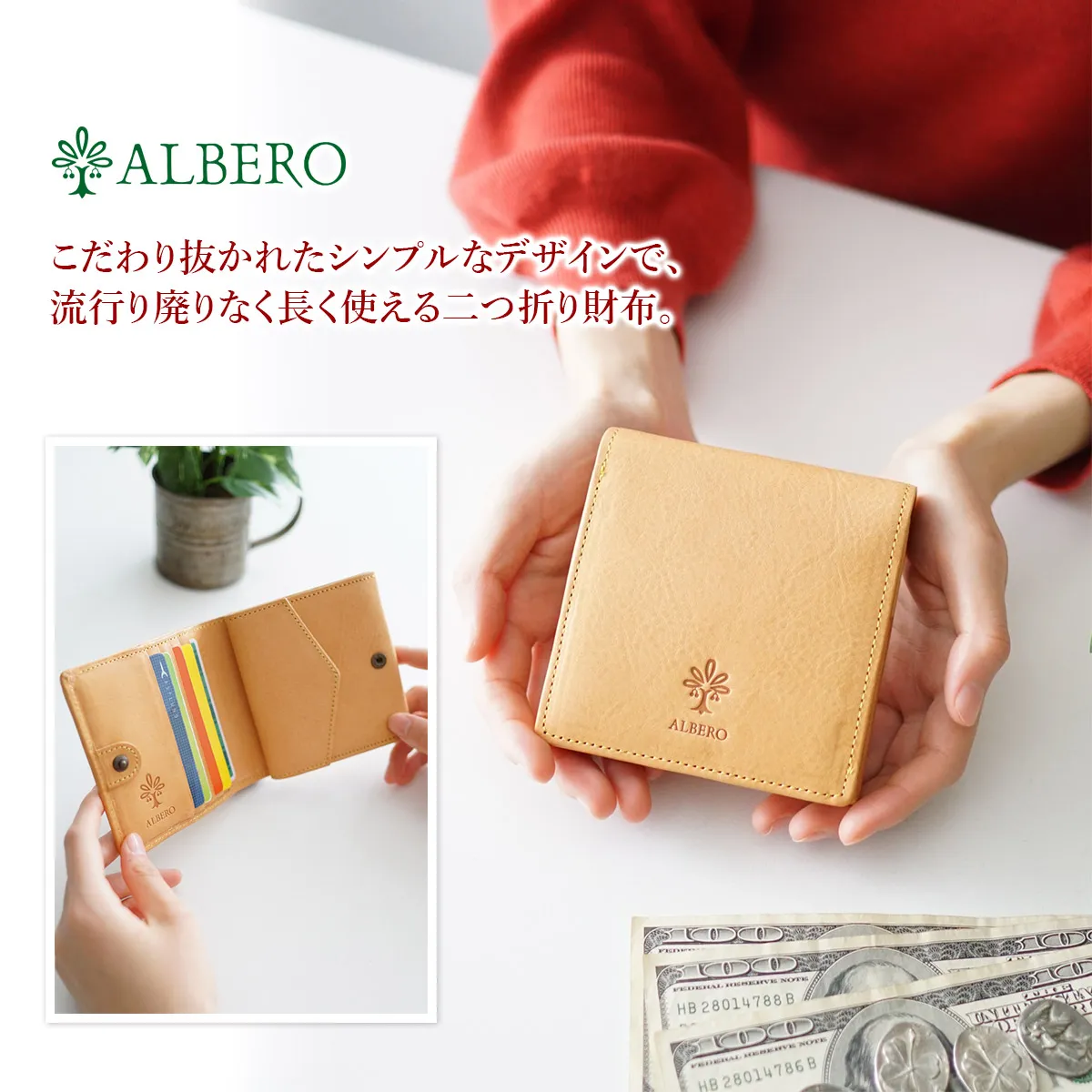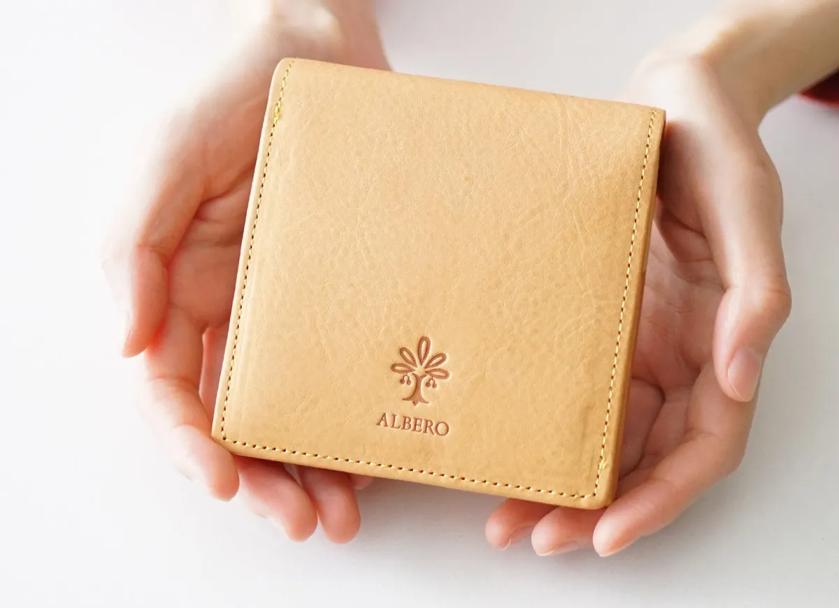 ALBERO(アルベロ) NATURE(ナチュレ) 小銭入れ付き二つ折り財布 5342 白ヌメシボ出しの素材を活かした、 見た目もつくりもシンプルなウォレット♪