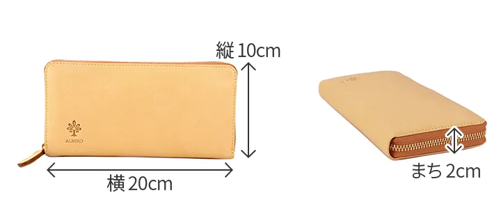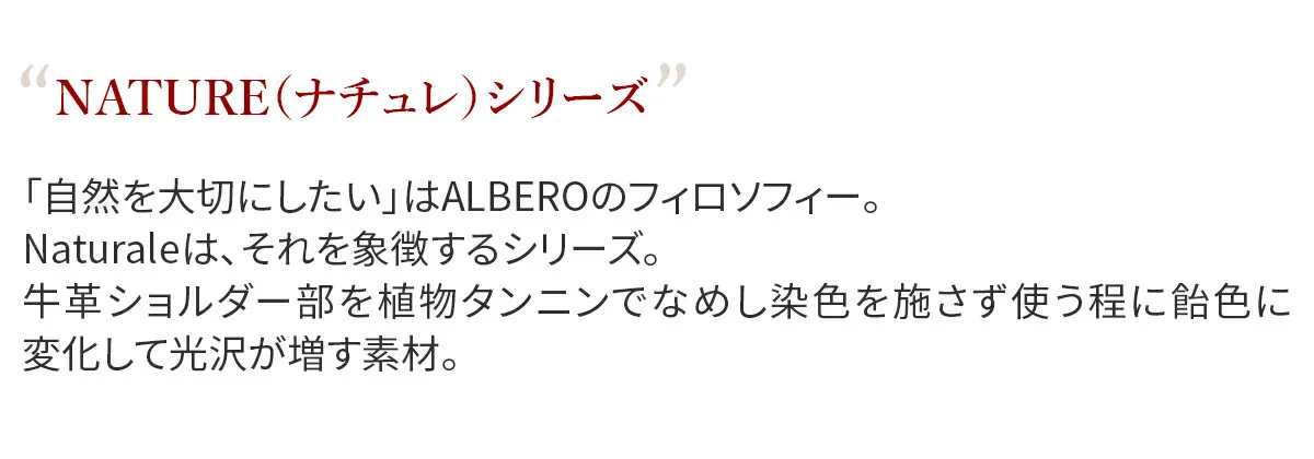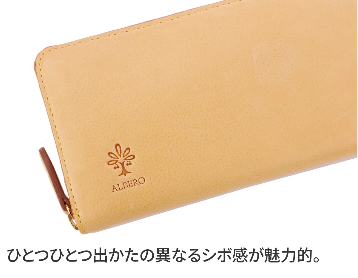 「自然を大切にしたい」はALBEROのフィロソフィー。牛革ショルダー部を植物タンニンでなめし染色を施さず使う程に飴色に変化して光沢が増す素材。 シンプルでスッキリとした見た目ですが、使いやすさを追求した機能性の高いデザインになっています。お札入れの後ろには、マチ付きのフリーポケットが備え付けられているので、通帳やパスポートなどの収納に最適です。