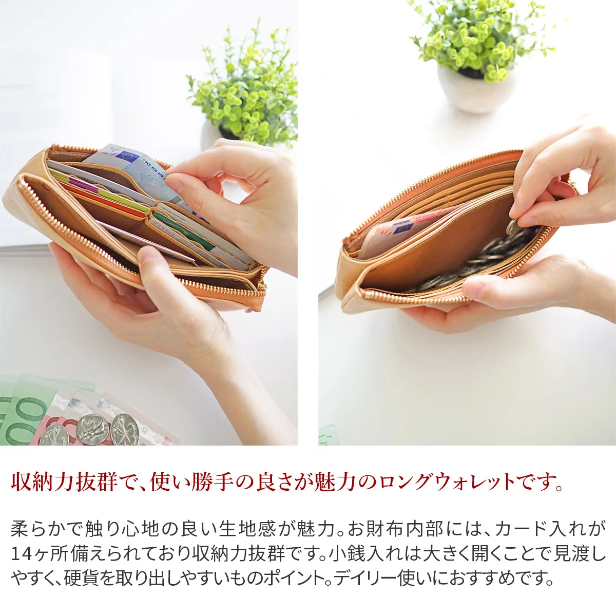 「自然を大切にしたい」はALBEROのフィロソフィー。Naturaleは、それを象徴するシリーズ。牛革ショルダー部を植物タンニンでなめし染色を施さず使う程に飴色に変化して光沢が増す素材。 お財布内部には、カード入れが14ヶ所備えられており収納力抜群です。小銭入れは大きく開くことで見渡しやすく、硬貨を取り出しやすいものポイント。