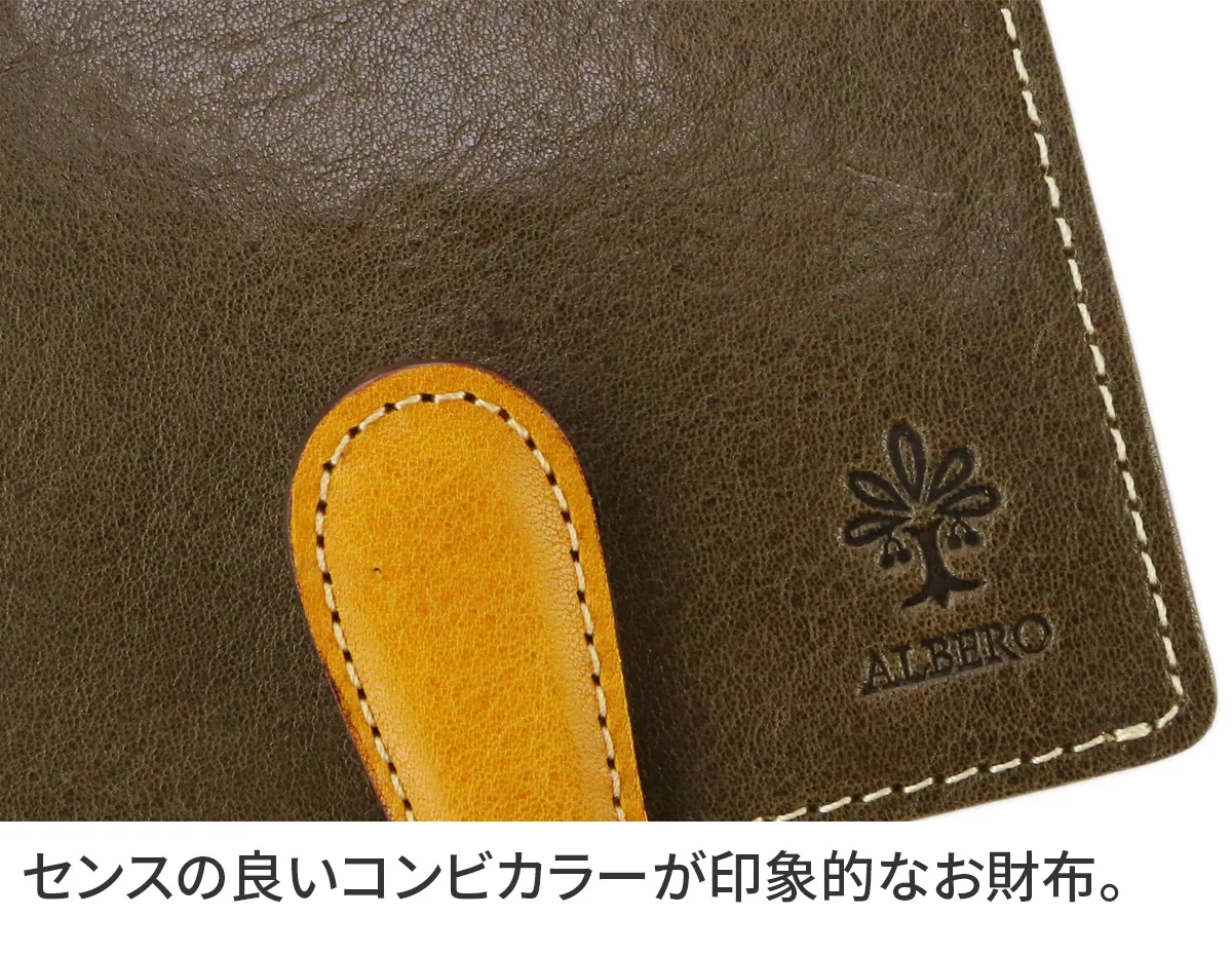 ALBERO(アルベロ) PIERROT(ピエロ) 小銭入れ付き二つ折り財布 6414 色の異なる革ベルトがアクセント。 センスの良いコンビカラーが印象的なお財布。