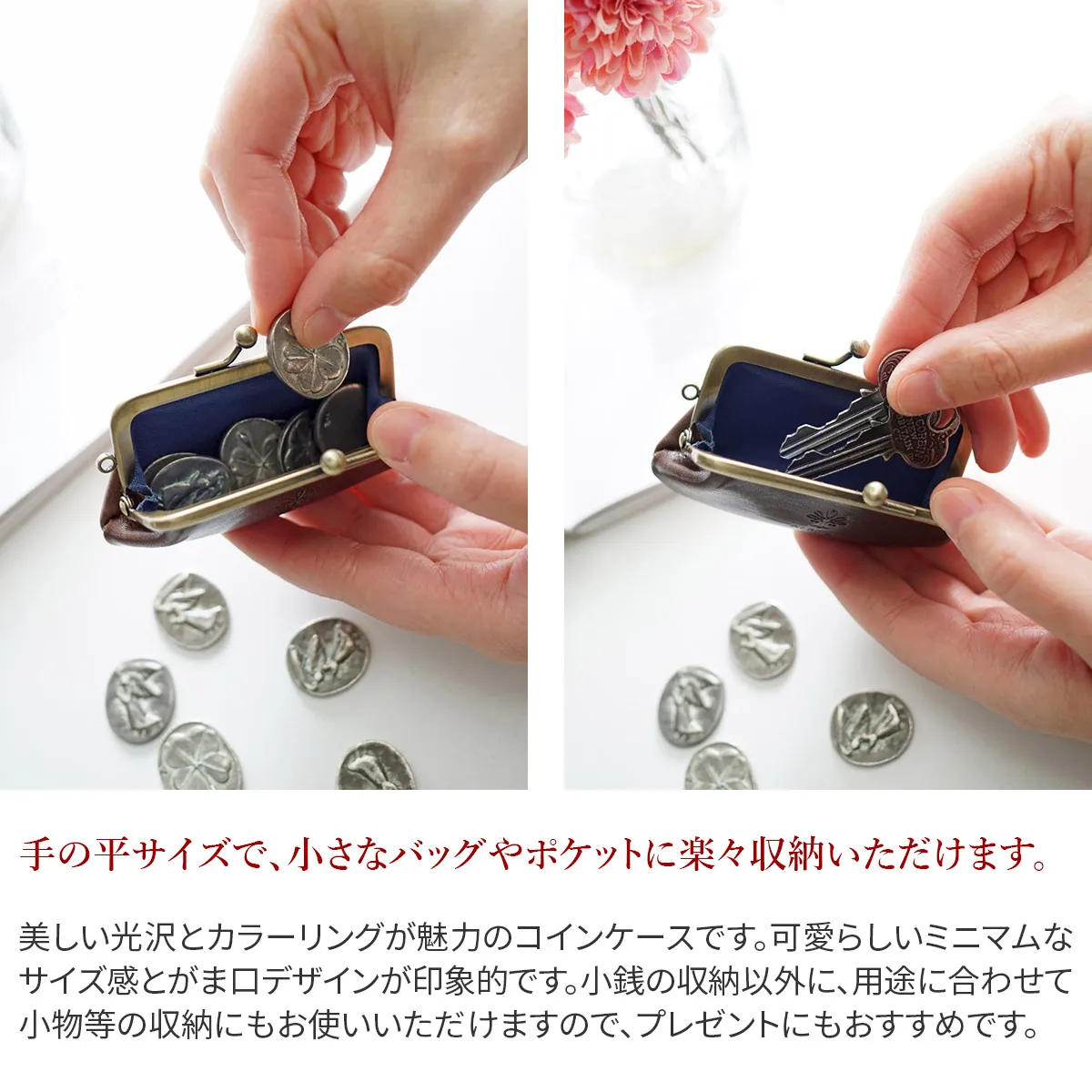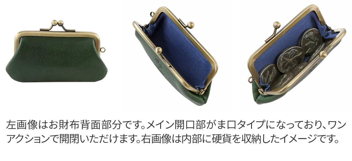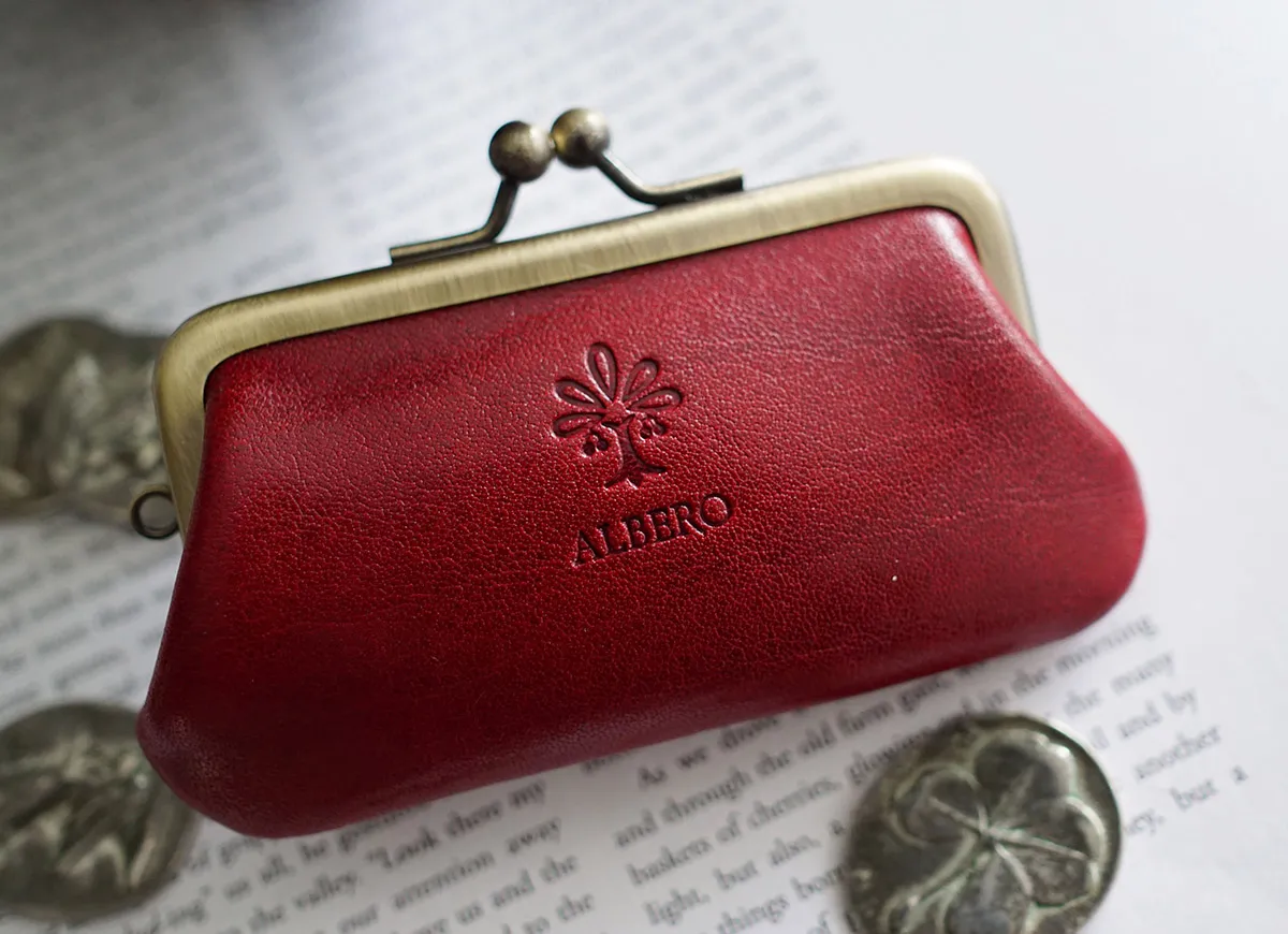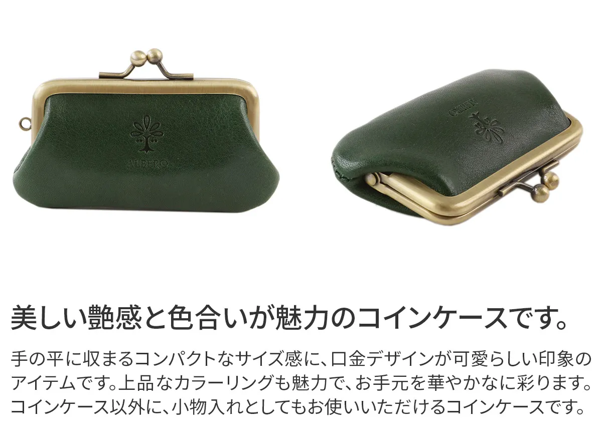 Tamponatoと呼ばれるトスカーナ地方の伝統技法による手染めの革を使用。 光沢としわ感が特徴の牛フロント(背中)部分をタンニンで鞣したソフトなヌメ革。 美しい光沢とカラーリングが魅力のコインケースです。可愛らしいミニマムなサイズ感とがま口デザインが印象的です。小銭の収納以外に、用途に合わせて小物等の収納にもお使いいただけますので、プレゼントにもおすすめです。