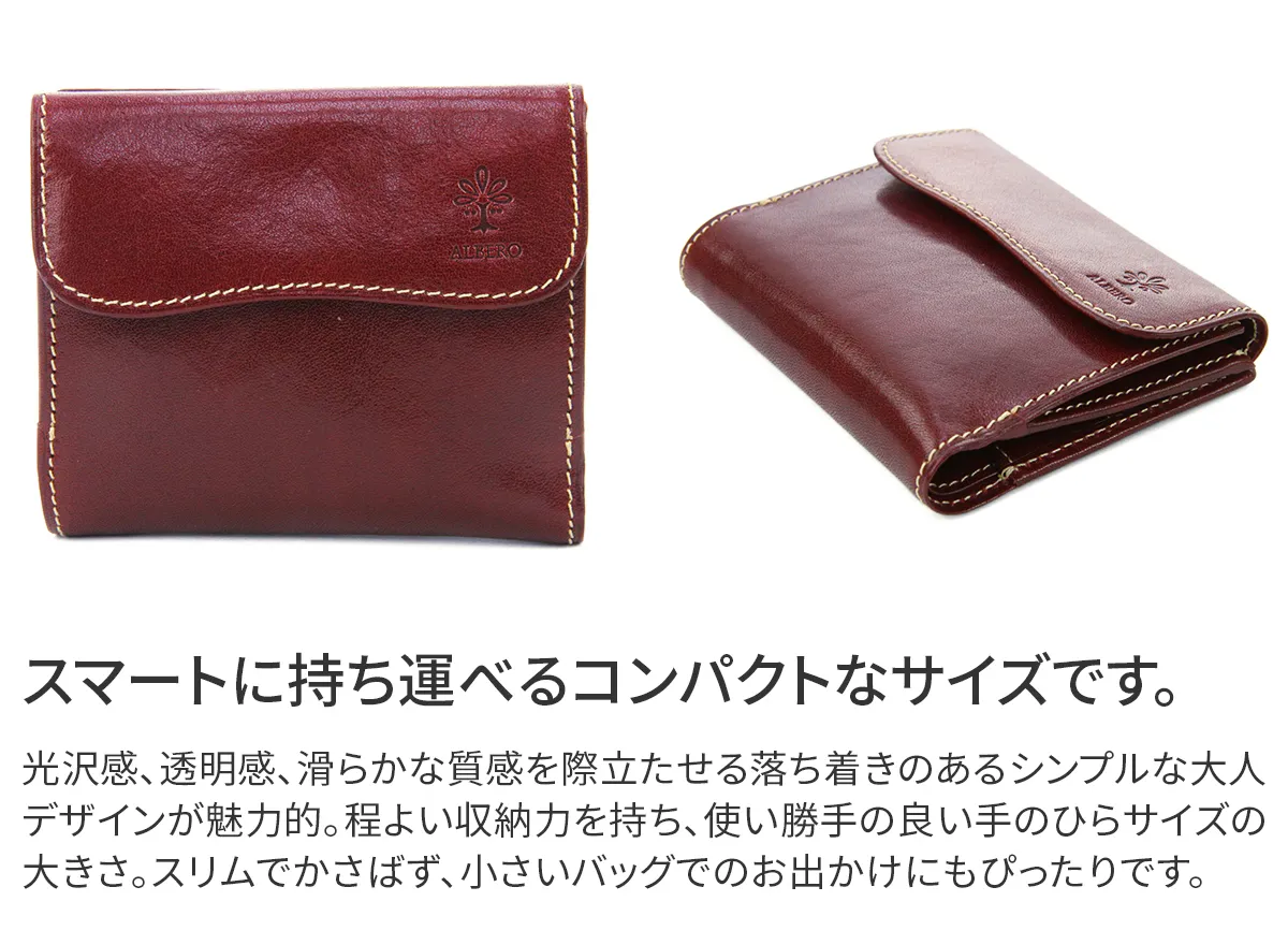 イタリア製牛革のフロント部分にタンポナートと呼ばれる手染めを施し光沢を出した素材。素材の透明感と、素材のショルダー(肩)に刻まれたトラ(シワ)が特徴。 深みのある色合い、艶が魅力的なレザーを使用、シンプルに素材を活かしたデザインのお財布です。小さめサイズなのでちょっとしたお買い物、旅行時などに役立ちます。
