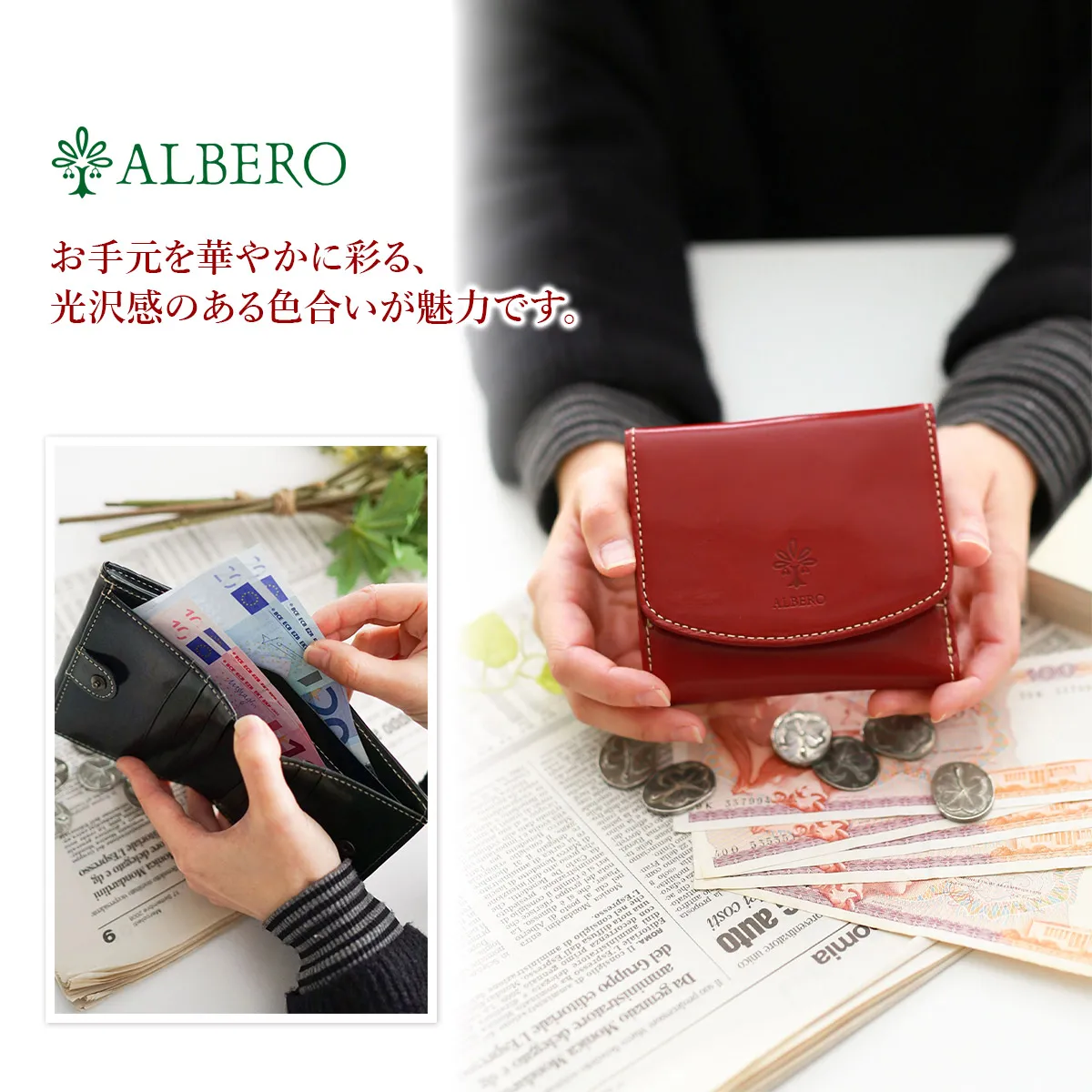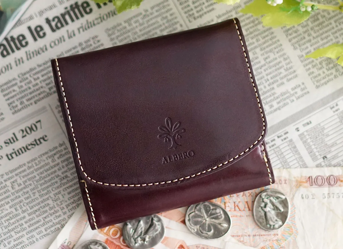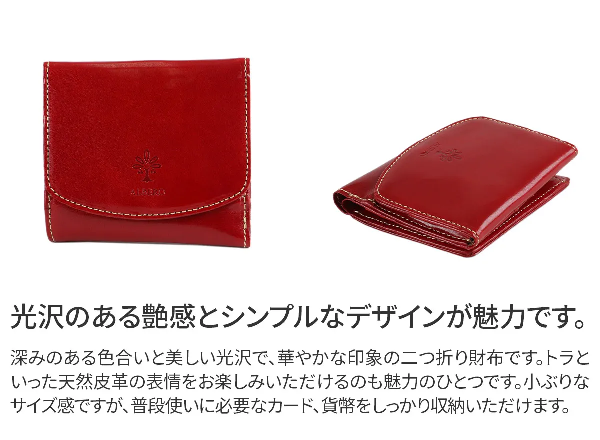 イタリア製牛革のフロント部分にタンポナートと呼ばれる手染めを施し光沢を出した素材。素材の透明感と、素材のショルダー(肩)に刻まれたトラ(シワ)が特徴。 透明感のある艶と、深みのある色合いで華やかな印象の二つ折り財布です。スクエア型のすっきりとしたフォルムに、小ぶりなサイズ感が特徴です。普段使いに必要なカード、貨幣を収納でき、BOX型の小銭入れは視認性抜群です。