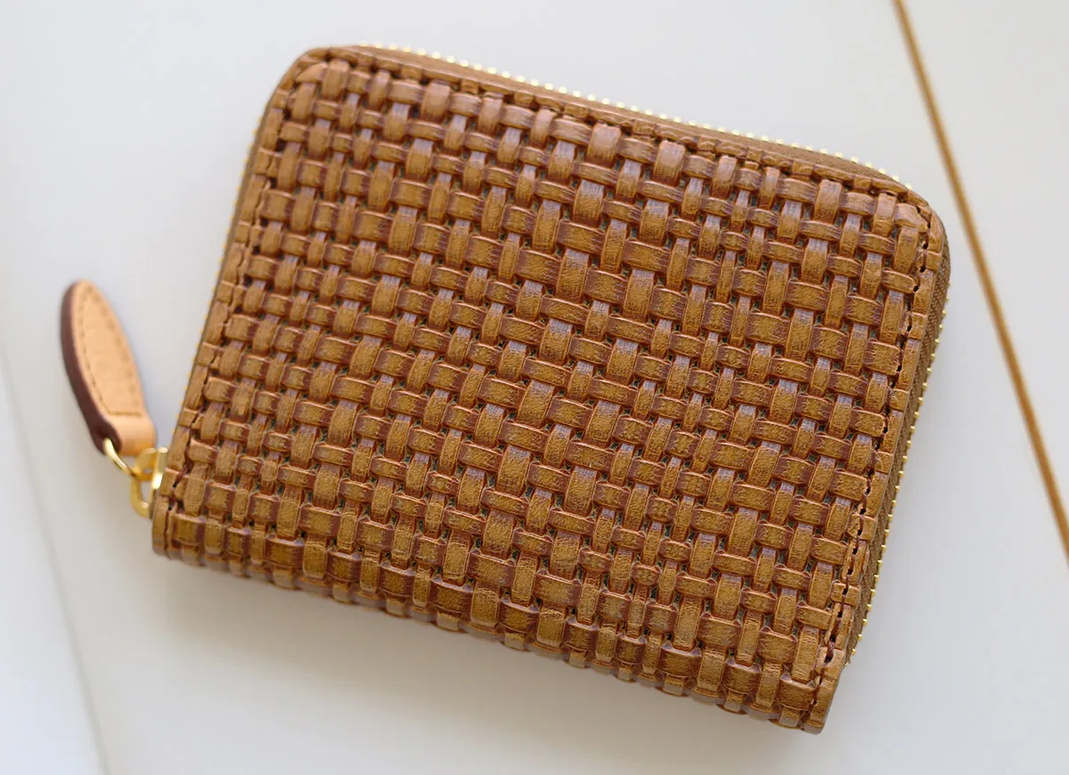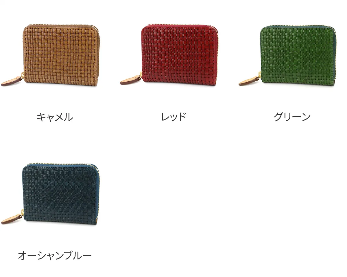 イタリア製牛ショルダーをタンニンでなめし、縄網の様なメッシュ柄を深く型押しをした素材。コバは切れ目を磨き込んだスタイリッシュでユニセックスなニューラインです。 ラウンドファスナーを開くと、手帳のように180度大きく開き中が見やすい作りです。BOXタイプの小銭入れは、ボタンを開けると硬貨全て一目でを確認できます。 お札入れは片側が縫われていないので、紙幣が取り出しやすい構造です。きちんと収納しながらも、スマートなフォルムを維持するラウンドファスナータイプの二つ折り財布です。